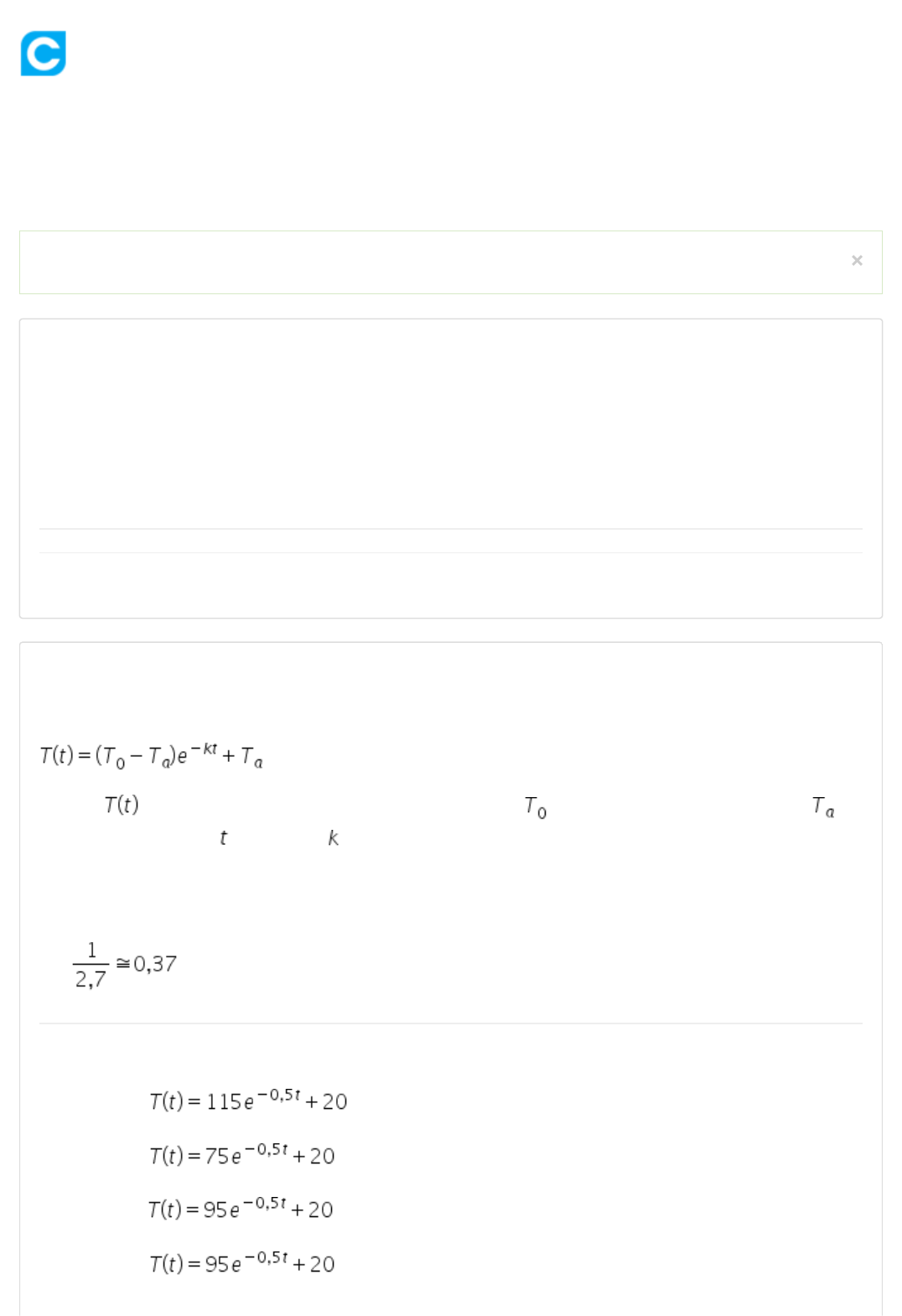 27/05/24, 12:24 Colaborar - Testando os Conhecimentos - 2ª Lista de Exercícios https://www.colaboraread.com.br/aluno/avaliacao/index/3864512901?atividadeDisciplinaId=16854305 1/8 Acelere Sua Carreira - 2024/1 - Pedagogia - L… Testando os Conhecimentos - 2ª Lista de Exercícios Sua avaliação foi confirmada com sucesso (/notific × Informações Adicionais Período: 22/04/2024 00:00 à 14/06/2024 23:59 Situação: Cadastrado Tentativas: 1 / 3 Protocolo: 1019227795 Avaliar Material 1) a) b) c) d) Segundo a Lei de Resfriamento de Corpos, a taxa de variação da temperatura de um corpo com relação ao tempo é proporcional à diferença entre a temperatura do corpo e a temperatura do ambiente. A equação utilizada para descrever a temperatura é dada por: Em que é a temperatura do corpo em função do tempo, é a temperatura inicial do corpo, é a temperatura ambiente, é o tempo e é a constante de proporcionalidade. Sabendo que a temperatura inicial da água era de 95 C°, temperatura ambiente de 20 C° e a constante k é igual a 0,5, assinale a alternativa que representa a temperatura da água no tempo igual a t = 2 minutos e a função que mostra a temperatura no instante igual a t com as condições dadas, respectivamente. (Use e = 2,7, se necessário). Alternativas: 27,75 C° e 75,75 C° e 47,75 C° e 27,75 C° e https://www.colaboraread.com.br/aluno/timeline/index/3864512901?ofertaDisciplinaId=2238005 https://www.colaboraread.com.br/notificacao/index javascript:void(0); 27/05/24, 12:24 Colaborar - Testando os Conhecimentos - 2ª Lista de Exercícios https://www.colaboraread.com.br/aluno/avaliacao/index/3864512901?atividadeDisciplinaId=16854305 2/8 e) 2) a) b) c) d) e) 3) 47,75 C° e Alternativa assinalada Leia o texto: “Entre os teóricos que tratam da modernidade tardia, ou da pós-modernidade, o sociólogo polonês Zygmunt Bauman é uma referência absoluta. Sua obra trata de uma série de mudanças que se estabeleceu nas últimas décadas e que exerceu, e ainda exerce, grande influência sobre o mundo social contemporâneo. Entre elas, a globalização foi uma das maiores forças de transformação da paisagem social moderna. A aproximação, ou o “encurtamento das distâncias”, transformou as relações humanas de várias formas. Em suas obras, Bauman cunha o termo “modernidade líquida”. Conforme exposto no texto, o conceito de Modernidade Líquida se caracteriza pela(o) Alternativas: fixidez nas relações sociais entre sujeitos e instituições sociais. ideal de progresso, baseando-se no pensamento racional e na ciência. fluidez das relações no mundo contemporâneo. Alternativa assinalada legitimidade de preceitos morais. construção do sentimento de nacionalismo. Uma empresa produz celulares de dois tipos num determinado modelo: tipo Standard e tipo Deluxe. A política da empresa garante a restituição da quantia paga ou troca do aparelho se qualquer celular apresentar defeito grave no prazo de seis meses. O tempo para ocorrência de algum defeito grave nos celulares tem distribuição normal. Observe a tabela a seguir Tipo Média de tempo que apresenta um defeito grave Desvio padrão do tempo que apresenta um defeito grave Standard10 2 Deluxe 14 5 Analise as asserções a seguir e a relação existente entre elas. I. A probabilidade de haver uma restituição do aparelho do tipo Deluxe é de 5,48% PORQUE II. A probabilidade de não haver uma restituição do aparelho do tipo Standard é de 97,72%. 27/05/24, 12:24 Colaborar - Testando os Conhecimentos - 2ª Lista de Exercícios https://www.colaboraread.com.br/aluno/avaliacao/index/3864512901?atividadeDisciplinaId=16854305 3/8 a) b) c) d) e) 4) a) Segue a Tabela Normal para auxiliar na resolução. A respeito dessas asserções, assinale a alternativa correta. Alternativas: As asserções I e II são proposições verdadeiras, mas a II não justifica a I. Alternativa assinalada As asserções I e II são proposições verdadeiras e a II justifica a I. A asserção I é uma proposição verdadeira e a II, falsa. A asserção I é uma proposição falsa e a II, verdadeira. As asserções I e II são proposições falsas. O relatório de vistoria é um gênero textual bastante usado na área de engenharia, que pressupõe um contexto de uso e um destinatário específico, obrigando seu autor a se preocupar com as regras gramaticais da língua portuguesa. Considerando as informações apresentadas, leia o fragmento a seguir, extraído de um relatório de vistoria, para resolver a questão proposta. Este relatório resume os procedimentos de análise documental e vistoria de campo, realizados pela XYZ Negócios e Investimentos S.A., responsável pela construção e operação da Arena ABC conduzidos de 01 a 31 de agosto de 20XX. Considerando a norma gramatiacal da língua protuguesa para o emprego da pontuação e para a concordância, assinale a alternativa que faz uma análise correta do trecho lido. Alternativas: Há um problema de concordância entre o determinante “realizados”, no plural, e o determinado “relatório”, no singular – relatório realizado. 27/05/24, 12:24 Colaborar - Testando os Conhecimentos - 2ª Lista de Exercícios https://www.colaboraread.com.br/aluno/avaliacao/index/3864512901?atividadeDisciplinaId=16854305 4/8 b) c) d) e) 5) a) b) c) d) e) 6) Há um problema de pontuação, visto que a expressão “este relatório” deveria vir separada por vírgula por ser um termo deslocado na frase. Há uma correta concordância entre a palavra “conduzidos”, no plural, e a expressão por ela determinada “os procedimentos de análise documental e vistoria de campo”. Alternativa assinalada Há um correto emprego dos sinais de pontuação, visto que o trecho possui todas as vírgulas necessárias à separação dos termos. Há um problema de concordância entre a palavra “conduzidos”, no masculino, e o termo “construção e operação”, com o qual deveria concordar no femin