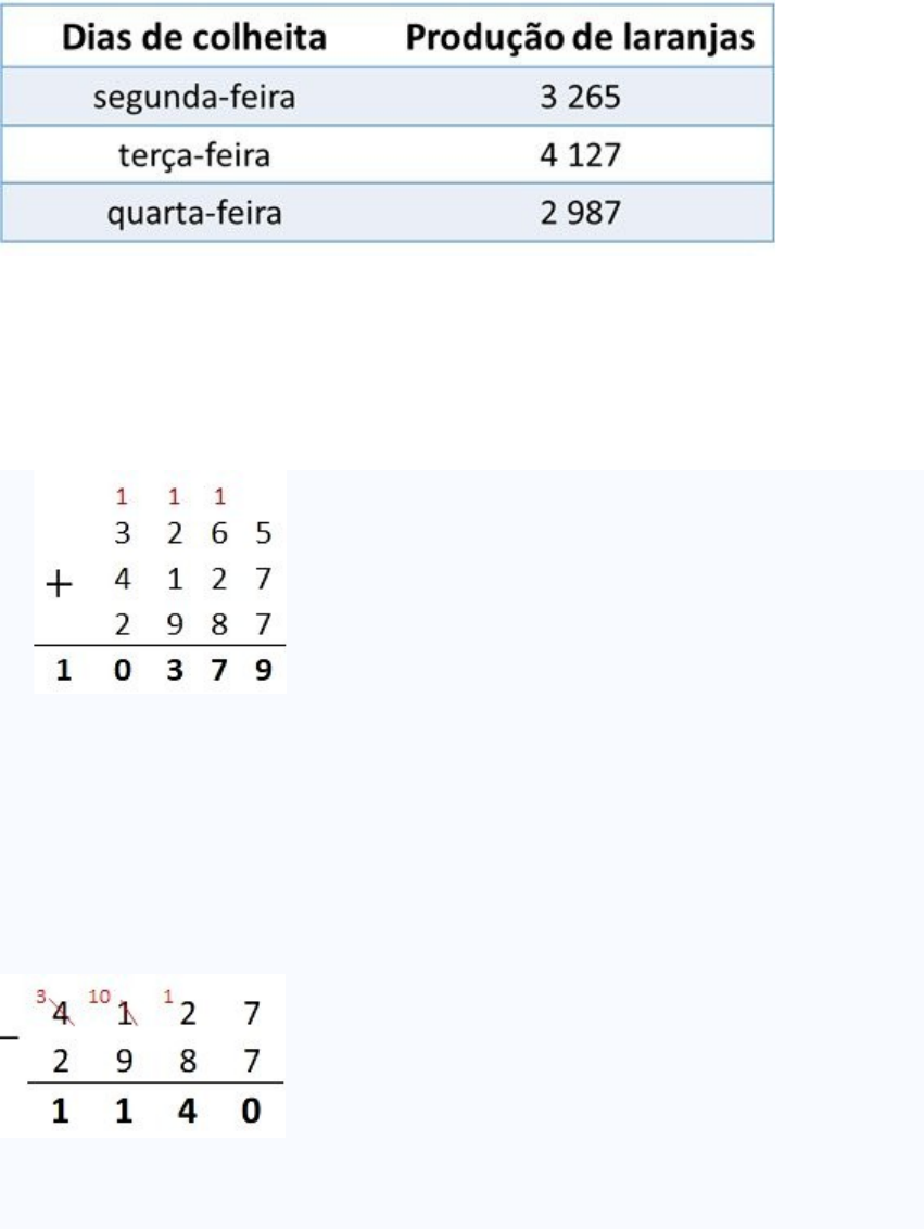 Adição e Subtração Na fazenda Morro Alto são produzidas laranjas. Assim que começou o período da colheita, uma grande produção já foi contabilizada. A tabela abaixo mostra a produção nos três primeiros dias. a) Qual a produção total nos três primeiros dias? b) De quanto foi a queda na produção entre o dia de maior e menor produção? Ver Resposta a) O total da produção nos três dias foi de 10 379 laranjas. b) 1 140 laranjas. O dia de maior produção foi terça-feira, com 4 127 laranjas e, o de menor produção foi quarta-feira, com 2 987 laranjas. A diferença é o resultado da subtração entre estes valores. Portanto, da terça-feira para quarta-feira houve uma queda na produção de 1 140 laranjas. image1.jpeg image2.jpeg image3.jpeg