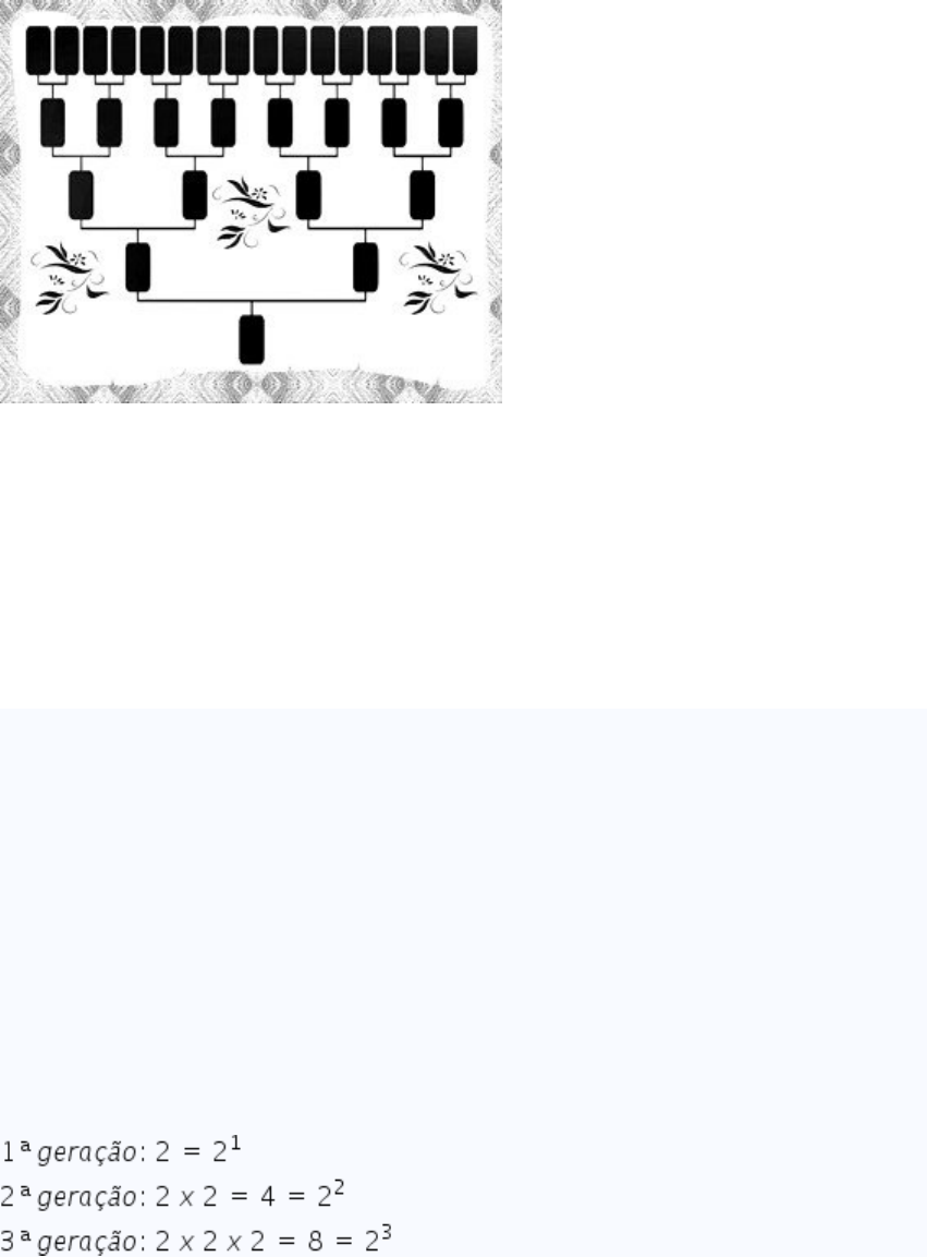 Nossa herança genética pode trazer mais surpresas do que supomos. Uma árvore genealógica é um instrumento que permite registrar e organizar a história de nossos antepassados, nela a cada geração, desenhamos mais dois “galhos”. Desta forma, a cada geração anterior, multiplicamos por dois o número de antepassados, em relação à anterior. Se considerarmos uma média de vinte anos para cada geração como tempo médio para gerar novos descendentes, há duzentos anos, quantas pessoas estariam nomeadas em sua árvore genealógica, nesta geração específica? Ver Resposta Resposta: 1 024 antepassados. Como estamos considerando 20 anos para cada geração, em 200 anos, teremos 10 gerações. 1ª geração passada: 2 pessoas (pais) 2ª geração passada: 4 pessoas (avós) 3ª geração passada: 8 pessoas (bisavós) Queremos um modo de determinar quantos antepassados há em uma determinada geração. No caso da questão, a décima. Fatorando as respostas para as primeiras 3 gerações, temos: Expandindo este raciocínio, calculando uma potência de base 2, onde o expoente representa a geração que procuramos, determinamos a geração. Desta forma, para a décima geração, temos: Portanto, apenas na décima geração passada, havia 1 024 antepassados. image1.jpeg image2.png image3.png