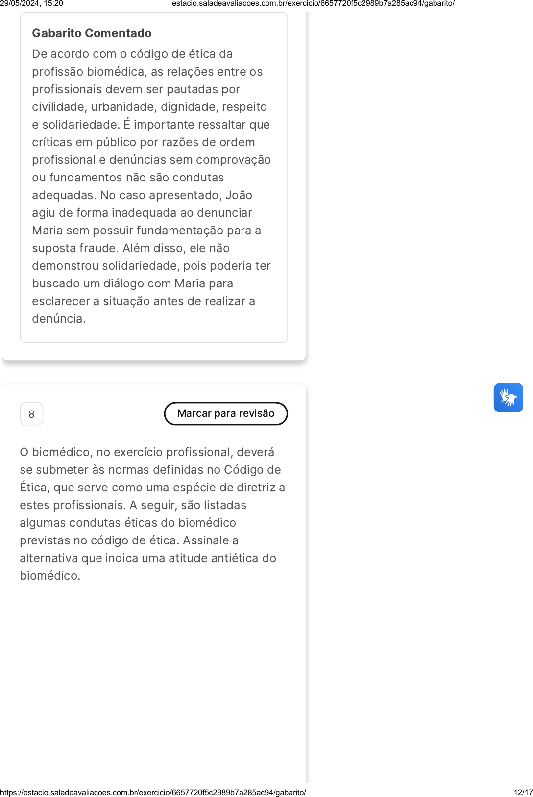 Gabarito Comentado De acordo com o código de ética da profissão biomédica, as relações entre os profissionais devem ser pautadas por civilidade, urbanidade, dignidade, respeito e solidariedade. É importante ressaltar que críticas em público por razões de ordem profissional e denúncias sem comprovação ou fundamentos não são condutas adequadas. No caso apresentado, João agiu de forma inadequada ao denunciar Maria sem possuir fundamentação para a suposta fraude. Além disso, ele não demonstrou solidariedade, pois poderia ter buscado um diálogo com Maria para esclarecer a situação antes de realizar a denúncia. 8 Marcar para revisão O biomédico, no exercício profissional, deverá se submeter às normas definidas no Código de Ética, que serve como uma espécie de diretriz a estes profissionais. A seguir, são listadas algumas condutas éticas do biomédico previstas no código de ética. Assinale a alternativa que indica uma atitude antiética do biomédico. 29/05/2024, 15:20 estacio.saladeavaliacoes.com.br/exercicio/6657720f5c2989b7a285ac94/gabarito/ https://estacio.saladeavaliacoes.com.br/exercicio/6657720f5c2989b7a285ac94/gabarito/ 12/17