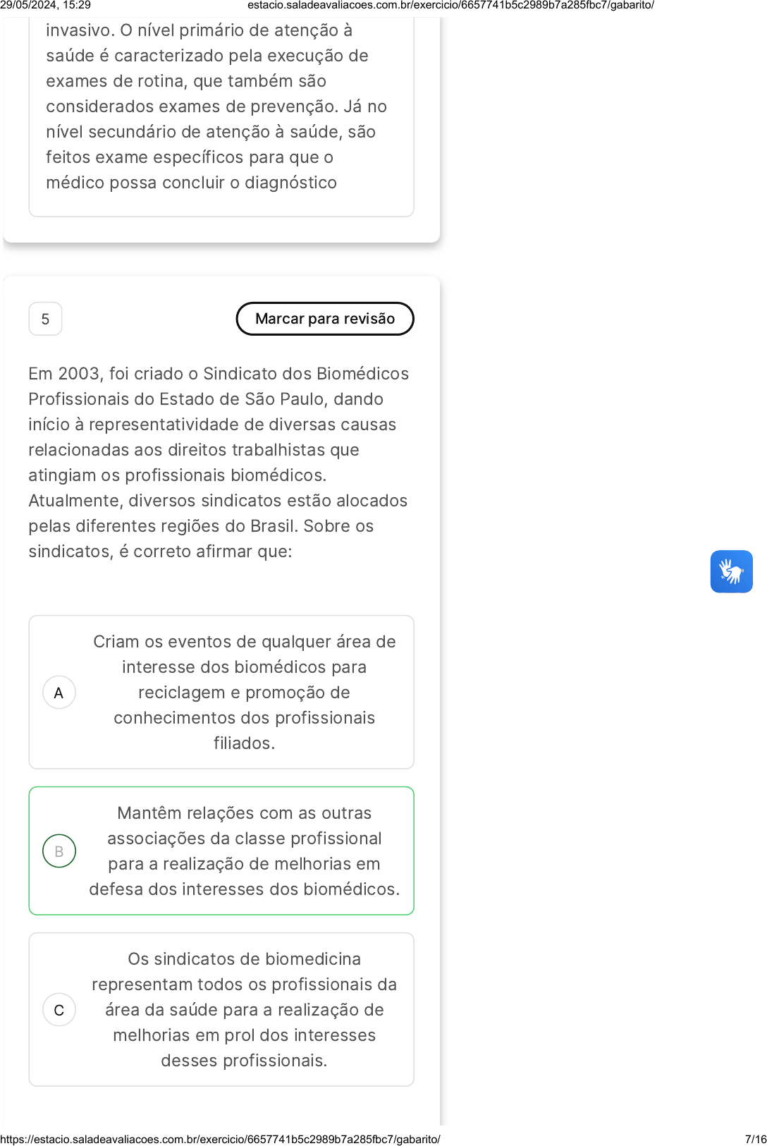 A B C invasivo. O nível primário de atenção à saúde é caracterizado pela execução de exames de rotina, que também são considerados exames de prevenção. Já no nível secundário de atenção à saúde, são feitos exame específicos para que o médico possa concluir o diagnóstico 5 Marcar para revisão Em 2003, foi criado o Sindicato dos Biomédicos Profissionais do Estado de São Paulo, dando início à representatividade de diversas causas relacionadas aos direitos trabalhistas que atingiam os profissionais biomédicos. Atualmente, diversos sindicatos estão alocados pelas diferentes regiões do Brasil. Sobre os sindicatos, é correto afirmar que: Criam os eventos de qualquer área de interesse dos biomédicos para reciclagem e promoção de conhecimentos dos profissionais filiados. Mantêm relações com as outras associações da classe profissional para a realização de melhorias em defesa dos interesses dos biomédicos. Os sindicatos de biomedicina representam todos os profissionais da área da saúde para a realização de melhorias em prol dos interesses desses profissionais. 29/05/2024, 15:29 estacio.saladeavaliacoes.com.br/exercicio/6657741b5c2989b7a285fbc7/gabarito/ https://estacio.saladeavaliacoes.com.br/exercicio/6657741b5c2989b7a285fbc7/gabarito/ 7/16