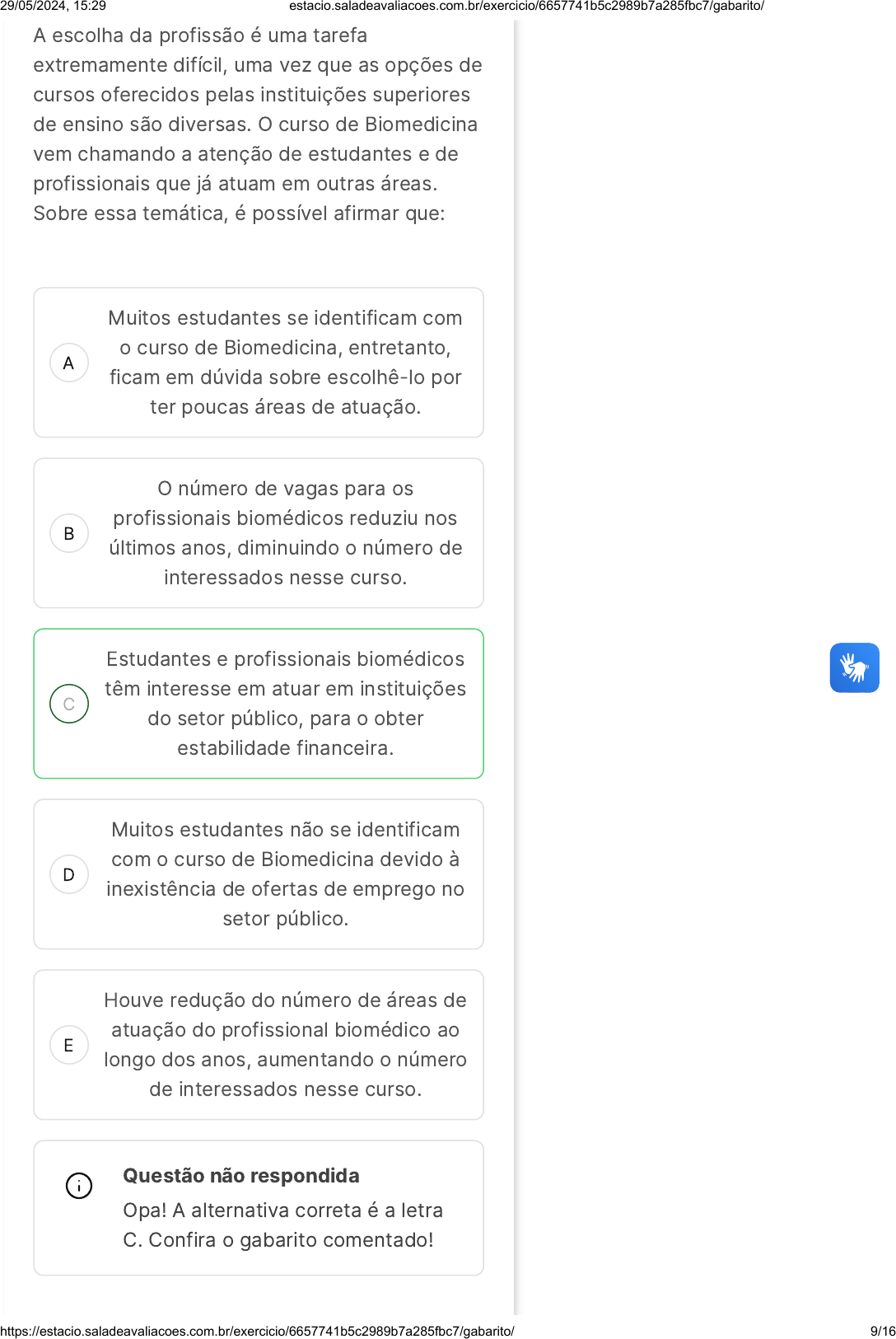 A B C D E A escolha da profissão é uma tarefa extremamente difícil, uma vez que as opções de cursos oferecidos pelas instituições superiores de ensino são diversas. O curso de Biomedicina vem chamando a atenção de estudantes e de profissionais que já atuam em outras áreas. Sobre essa temática, é possível afirmar que: Muitos estudantes se identificam com o curso de Biomedicina, entretanto, ficam em dúvida sobre escolhê-lo por ter poucas áreas de atuação. O número de vagas para os profissionais biomédicos reduziu nos últimos anos, diminuindo o número de interessados nesse curso. Estudantes e profissionais biomédicos têm interesse em atuar em instituições do setor público, para o obter estabilidade financeira. Muitos estudantes não se identificam com o curso de Biomedicina devido à inexistência de ofertas de emprego no setor público. Houve redução do número de áreas de atuação do profissional biomédico ao longo dos anos, aumentando o número de interessados nesse curso. Questão não respondida Opa! A alternativa correta é a letra C. Confira o gabarito comentado! 29/05/2024, 15:29 estacio.saladeavaliacoes.com.br/exercicio/6657741b5c2989b7a285fbc7/gabarito/ https://estacio.saladeavaliacoes.com.br/exercicio/6657741b5c2989b7a285fbc7/gabarito/ 9/16