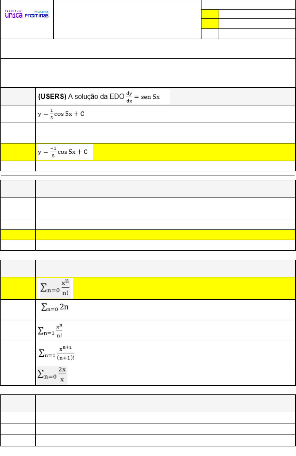 Pincel Atômico - 09/03/2024 00:09:17 1/6 ALAN MICHEL MENDONÇA RIBEIRO Avaliação Online (Curso Online - Automático) Atividade finalizada em 08/03/2024 22:49:02 (1235826 / 1) LEGENDA Resposta correta na questão # Resposta correta - Questão Anulada X Resposta selecionada pelo Aluno Disciplina: PRÁTICA PEDAGÓGICA INTERDISCIPLINAR: EQUAÇÕES DIFERENCIAIS ORDINÁRIAS [935548] - Avaliação com 20 questões, com o peso total de 50,00 pontos [capítulos - Todos] Turma: Segunda Graduação: Segunda Graduação 6 meses - Licenciatura em Matemática - Grupo: FPD-OUTUBRO/2023 - SGegu0A041023 [101341] Aluno(a): 91516869 - ALAN MICHEL MENDONÇA RIBEIRO - Respondeu 20 questões corretas, obtendo um total de 50,00 pontos como nota [360347_174153] Questão 001 y=cosâ•¡ 3x+C y=cos â•¡5x+C X y=cosâ•¡ x+C [360347_174107] Questão 002 Das equações abaixo, qual é linear? y'+ 2xy =cosy x2 yy'- 2xy2 = 0 y''= 1+(y')2 X y' = 5x+2y ey''- xy' + y = 0 [360347_174151] Questão 003 A série de Maclaurin da função F(x) = ex , será: X [360347_174167] Questão 004 A solução geral da equação y''-6y'+5y=0 é: y(x)=ex (C1 cosâ•¡ 3x + C2) y(x)=e2x C1 cosâ•¡3x + C2) y(x)=e2x (C1+C2) Pincel Atômico - 09/03/2024 00:09:17 2/6 y(x)=e2x X y(x)=e2x (C1 cosâ•¡ 3x + C2 sen 3x) [360347_174097] Questão 005 A SG da EDO y'=cosâ•¡x é y(x)=senx+C , onde Cϵ R. A solução particular que satisfaz a condição y(0)=2π será: y(x)=sen 2π y(x)=sen x+ π X y(x)=sen x+2π y(x)=0 y(x)=sen π [360347_110810] Questão 006 Analise a expressão abaixo: De acordo com a expressão dada, avalie as afirmativas abaixo: I. A expressão dada representa uma equação diferencial de segunda ordem. II. O conjunto das soluções para a expressão representada pode ser dado por y(x)=A.sen(xt)+B.cosâ•¡(xt), onde A e B são constantes quaisquer. III. Obter uma única solução para a expressão dada é o mesmo que obter todo o conjunto de soluções. É correto o que se afirma em II, apenas. I e III, apenas. III, apenas. I e II, apenas. X I, apenas. [360347_174165] Questão 007 A transformada de Laplace da função f(x)=2x2-3x+4 é: X [360347_174095] Questão 008 1 X π/3 0 Pincel Atômico - 09/03/2024 00:09:17 3/6 π/4 π/2 [360347_174098] Questão 009 Qual função é solução da EDO 2y dx-xdy=0? y=3x X y= 5x2 y=2x y=3x2 y=5x [360347_110774] Questão 010 Veja a expressão abaixo: É uma equação diferencial, pois possui integrais representadas na relação. possui expoentes inteiros representados na relação. possui raízes representadas na relação. X possui derivadas representadas na relação. possui zeros representados na relação. [360348_110742] Questão 011 Veja a situação abaixo: De acordo as informações apresentadas, avalie as afirmativas abaixo: I. A situação apresentada traz dois limites que resultam em indefinições. II. O limite da esquerda na expressão converge para 0, enquanto o segundo diverge para -∞. III. O resultado da expressão acima será uma divergência para +∞. É correto o que se afirma em: X III, apenas. I e III, apenas. I, apenas. II, apenas. I e II, apenas. Pincel Atômico - 09/03/2024 00:09:17 4/6 [360348_110766] Questão 012 Analise a expressão abaixo: De acordo as informações apresentadas no trecho, avalie as afirmativas abaixo: I. A expressão dada acima representa uma série chamada de geométrica. II. A soma dos termos da expressão acima converge, uma vez que a série será decrescente. III - Os valores de z representam um único valor na expressão dada acima e, portanto, a soma geral será convergente. É correto o que se afirma em: II e III, apenas. X III, apenas. II, apenas. I, apenas. I e II, apenas. [360348_110723] Questão 013 Veja a integral a seguir: Resolvendo-a, chega-se em: 1/2 π/6 X π/2 π/4 0 [360348_110777] Questão 014 Considere a equação abaixo: ƒ’ (t) = - a.sen (t) + b.cosâ•¡ (t) Possui por solução geral qual das expressões abaixo? ƒ(t) = a.sen(t+b) - cosâ•¡(t) ƒ(t) = a.sen(t) ƒ(t) = a.sen(t+b) - cosâ•¡(t) + b.sen(t-b) ƒ(t) = b.sen(a+b) + cosâ•¡(t) X ƒ(t) = a.cosâ•¡(t) - b.sen(t) Pincel Atômico - 09/03/2024 00:09:17 5/6 [360348_110803] Questão 015 Analise a expressão abaixo: De acordo com a expressão dada, avalie as afirmativas abaixo: I. A equação dada é diferencial de primeira ordem. II. A solução geral para a equação dada é igual a y(x)=1/4 x2+k. III. A solução geral da expressão dada não pode ser obtida. É correto o que se afirma em X I e II, apenas. III, apenas. I, apenas. II, apenas. I e III, apenas. [360348_110740] Questão 016 Analise a situação a seguir: A partir da análise da situação acima, considere as seguintes afirmações: I. O resultado do limite será uma indefinição do tipo +∞. II. Para encontrarmos um resultado possível para o limite dado deve ser aplicado o Teorema de Cauchy. III. O limite acima converge para 1. É correto o que se afirma em: I e II, apenas. III, apenas. II, apenas. X I e III, apenas. I, apenas. [360349_110785] Questão 017 Analise a expressão abaixo: dI = F.dt A expressão representa uma exponencial para derivação. uma equação linear. X uma diferencial para integração. uma derivação sobre expoente. uma equação logarítmica. Pincel Atômico - 09/03/2024 00:09:17 6/6 [360349_110729] Questão 018 Analise a situação abaixo: Diante da situação apresentada, avalie as afirmativas abaixo: I. A igualdade apresentada é verdadeira, uma vez que foram mantidas as propriedades da função no intervalo. II. As integrais do lado direito são impróprias, pois possuem intervalos infinitos. III. A integral da esquerda converge para 1. É correto o que se afirma em: II, apenas. X I, apenas. I e II, apenas. III, apenas. II e III, apenas. [360349_110733] Questão 019 Analise a expressão abaixo: Resolvendo-a, chega-se em: +∞ 1 X -∞ 0 -1 [360349_110823] Questão 020 Analise a equação abaixo: Qual é o conjunto das soluções gerais que