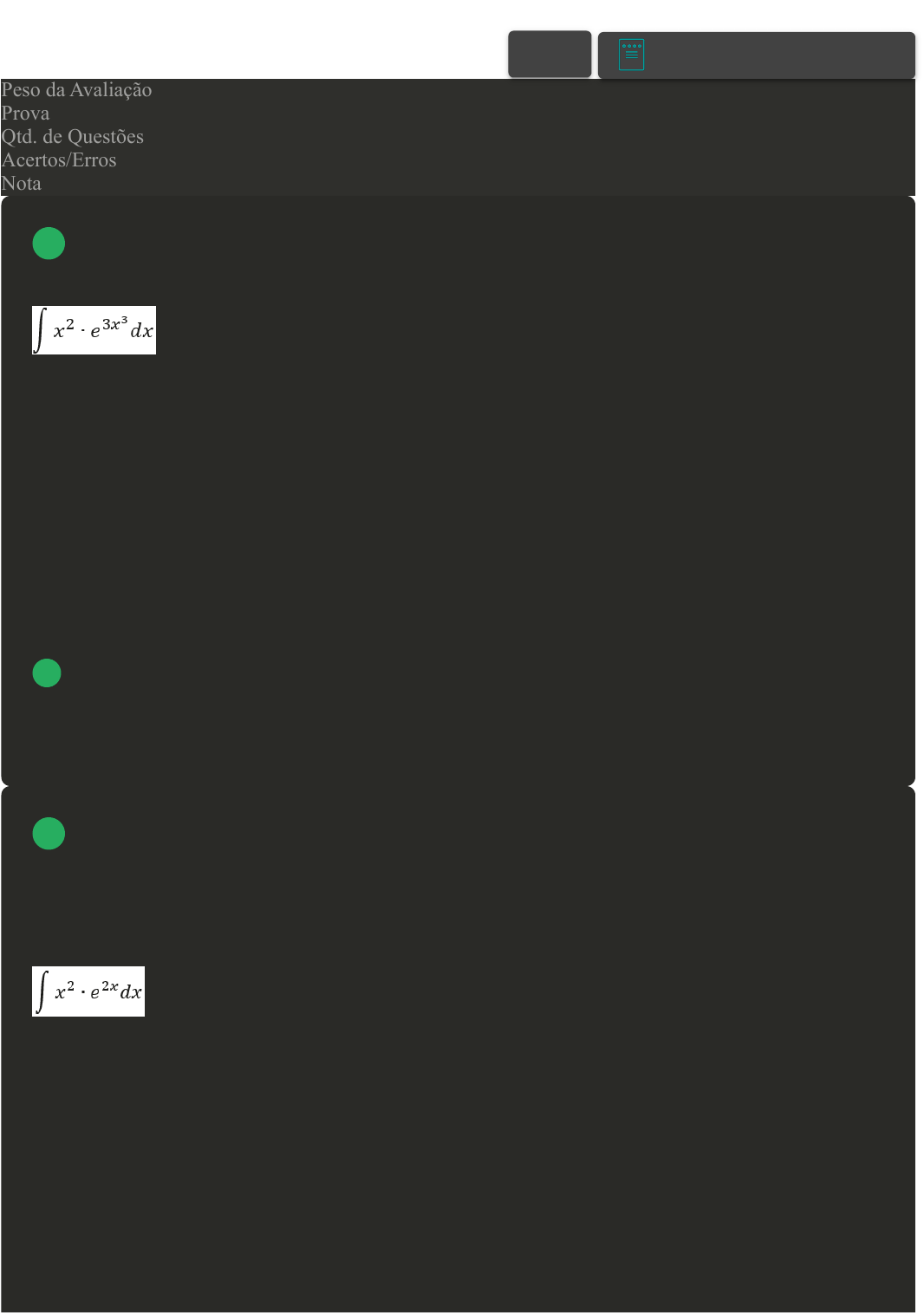 Prova Impressa GABARITO | Avaliação I - Individual (Cod.:956703) Peso da Avaliação 2,00 Prova 81799241 Qtd. de Questões 10 Acertos/Erros 9/1 Nota 9,00 Em certo momento da aula, o professor desafiou os alunos a identificarem uma estratégia para resolver a integral apresentada a seguir Aluno A: A integral pode ser resolvida, utilizando a integral por partes, sendo u = x² e dv = e3x³. Aluno B: A integral pode ser resolvida, substituindo 3x³ por u, no método por substituição. Aluno C: A integral pode ser resolvida, dividindo a integral em duas partes, podemos integrar separadamente x² e e3x³. Analisando as propostas de resolução dos alunos A, B e C, assinale a alternativa correta: A Os alunos A e C estão corretos. B Apenas o aluno C está correto. C Os alunos A e B estão corretos. D Apenas o aluno B está correto. E Apenas o aluno A está correto. No estudo do cálculo integral, destaca-se o método de integração por partes, derivado do princípio da derivação do produto de funções. Este método, em suma, envolve a transformação da integração de uma função complexa em duas ou mais integrais mais simples, tornando mais acessível o processo de resolução. Sendo a integral analise as opções que apresentam argumentos válidos, sobre a resolução dessa integral pelo método de integração por partes: I. Devemos assumir inicialmente u = x². II. Necessitaremos utilizar por três vezes o método para resolver a integral. III. Na segunda vez que aplicamos o método, devemos utilizar o dv = e2x dx. IV. A integral de e2x, deve ser resolvido pelo método da substituição. É correto o que se afirma em: A II e III, apenas. B I e IV, apenas. VOLTAR A+ Alterar modo de visualização 1 2 08/05/2024, 22:01 Avaliação I - Individual about:blank 1/6 C I e II, apenas. D II e IV, apenas. E I, III e IV, apenas. No estudo do cálculo integral, os métodos ou técnicas de integração são procedimentos analíticos empregados para encontrar antiderivadas de funções. Entre as técnicas mais reconhecidas estão a integração por substituição, por partes e por frações parciais. Especificamente, a técnica de integração por substituição envolve a aplicação da mudança de variáveis u = g(x), facilitando a obtenção de uma integral imediata para resolver o problema. Por exemplo, considere a integral Dessa forma, a partir dessa integral, identifique a alternativa correta que propõe a melhor substituição a ser utilizada: A u = dx. B u = e2x^4. C u = e2x D u = x3. E u = 2x4. Em situações em que uma função possui partes de sua representação gráfica acima e abaixo do eixo das abscissas, surge um conceito crucial denominado "saldo de área". Este conceito implica que ao calcular a integral de tal função em um intervalo de integração, o resultado não apenas representa a área total sob o gráfico, mas também considera a diferença entre as áreas acima e abaixo do eixo das abscissas. Desta forma, analise a representação gráfica de uma função f e sendo a, b, c e d, as áreas positivas desta função nos respectivos intervalos (-3, -1), (-1, 2), (2, 4) e (4, 6): Considerando as informações apresentadas, avalie as asserções a seguir e a relação proposta entre elas. 3 4 08/05/2024, 22:01 Avaliação I - Individual about:blank 2/6 I. A integral definida de -3 até 6 desta função, apresentará como resultado, a soma de a + b + c + d. PORQUE II. Ao calcular a área da curva no intervalo de -3 até 6, devemos separar o cálculo em quatro partes, respeitando as partes acima e abaixo do eixo das abscissas. A respeito dessas asserções, assinale a opção correta: A As asserções I e II são verdadeiras, mas a II não é uma justificativa correta da I. B As asserções I e II são falsas. C A asserção I é uma proposição verdadeira e a II é uma proposição falsa. D A asserção I é uma proposição falsa e a II é uma proposição verdadeira. E As asserções I e II são verdadeiras, e a II é uma justificativa correta da I. No cálculo, a integral de uma função foi criada originalmente para determinar a área sob uma curva no plano cartesiano e também surge naturalmente em dezenas de problemas da física, como na determinação da posição em todos os instantes de um objeto, se for conhecida a sua velocidade instantânea em todos os instantes. Para resolver estas integrais, podemos recorrer a alguns métodos de resolução. Um deles é o método da integração por substituição. Sobre o exposto, analise as sentenças a seguir: É correto o que se afirma em: A II, III e IV, apenas. B II e III, apenas. C I, II e IV, apenas. D I, III e IV, apenas. E I e II, apenas. As operações inversas: adição e subtração, multiplicação e divisão, potenciação e radiciação, exponenciação e logaritmação, já são bastante conhecidas. A integração indefinida é basicamente a operação inversa da diferenciação. Assim, dada a derivada de uma função, o processo que consiste em achar a função que a originou, ou seja, achar a sua primitiva denomina-se de antiderivação. 5 6 08/05/2024, 22:01 Avaliação I - Individual about:blank 3/6 Baseado nisso, analise as opções que apresentam f(x), sendo que f'(x) = 3x² - 6x + 2 para todo x e com f(1) = 2: I. f(x) = 6x² - 6 II. f(x) = x³ - 3x² + 2x + 2 III. f(x) = x³ - 6x² + 2x IV. f(x) = 3x² - 2x - 3 É correto apenas o que se afirma em A II e III, apenas. B I, apenas. C IV, apenas. D II e IV, apenas. E I e II, apenas. A resolução de integrais requer a aplicação meticulosa de métodos analíticos e estratégias de simplificação, visando encontrar soluções que capturem com precisão os aspectos fundamentais das funções em estudo, sendo uma habilidade essencial em diversas áreas da matemática e ciências aplicadas. Portanto, utilizando das técnicas e métodos desenvolvidos no estudo das integrais, assinale entre as opções a seguir, qual delas apresenta a primitiva da função f(x)