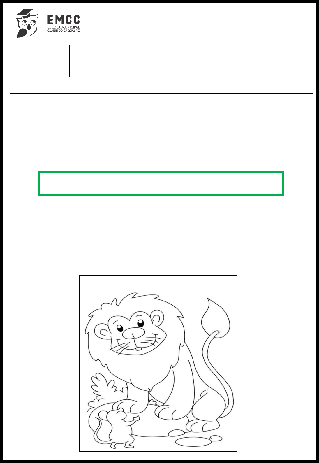 1 LEÃOJOÃO 1ª SEMANA (01 A 08 DE OUTUBRO) – SEMANA DA CRIANÇA DIA 01/10/2021 –SEXTA – FEIRA ARTES - EF15AR26P3 ●ACESSE O VÍDEO EXPLICATIVO NO LINK INDICADO A SEGUIR: https://youtu.be/Qdxugj3l3WA 1) VAMOS FAZER UM LINDO COLORIDO DO PERSONGEM DA HISTÓRIA? E. M. CLARINDO CASSIMIRO EDUCAÇÃO INFANTIL - ENSINO FUNDAMENTAL I (31) 3773-2284 PLANTE O BEM, FAÇA O BEM, O RESTO VEM! 3º Ano C - EF ATIVIDADES NÃO PRESENCIAIS PROFESSORA: DANIELE PROFESSORA DE APOIO: MARIA ELIZANDRA ALUNO (A): BERNARDO ALTISSPIMO ANDRADE A HISTORINHA DO LEÃO JOÃO (TEATRO) 2 ENSINO RELIGIOSO - EF03ER04X QUEM JÁ FOI A UMA FESTA? ELAS PODEM SER RELIGIOSAS OU NÃO. NAS DIVERSAS TRADIÇÕES RELIGIOSAS OS EVENTOS IMPORTANTES SÃO LEMBRADOS E COMEMORADOS FESTIVAMENTE, EXEMPLOS: ACONTECIMENTOS IMPORTANTES COMO NASCIMENTO, VIDA E MORTE DE FUNDADORES OU LÍDERES DE CADA RELIGIÃO. 1) OBSERVE AS IMAGENS ABAIXO E ASSINALE A OPÇÃO QUE INDICA SER UMA FESTA RELIGIOSA. CIÊNCIAS - EF03CI10 ●ATIVIDADE CORRESPONDENTE A PROPOSTA DO LIVRO DE DIDÁTICO: ●LEIA O TEXTO DA PÁGINA 108. ●FAÇA AS ATIVIDADES : 1, 2 E 3 PÁGINA 109. AS FESTAS RELIGIOSAS PARA LER E ESCREVER MELHOR 3 DIA 04/10/2021 –SEGUNDA–FEIRA LÍNGUA PORTUGUESA - (EF15LP17) ,(EF35LP27) POEMA : É UM TEXTO LITERÁRIO GERALMENTE APRESENTADO NA VERTICAL, UM VERSO EMBAIXO DO OUTRO. OS VERSOS SE ORGANIZAM EM ESTROFES, QUE SÃO SEPARADAS PORUM ESPAÇO EM BRANCO. ●FAÇA A LEITURA DA PÁGINA: 218 – PARA INICIAR: LEITURA POEMA ●FAÇA AS ATIVIDADES 1, 2 E 3 DA PÁGINA 219. MATEMÁTICA -EF03MA18 ●ATIVIDADE CORRESPONDENTE A PROPOSTA DO LIVRO DE DIDÁTICO: ●ACESSE O VÍDEO EXPLICATIVO NO LINK INDICADO A SEGUIR: HTTPS://YOUTU.BE/1NIAACBQO7S VEJA O LINK :HTTPS://WWW.YOUTUBE.COM/WATCH?V=ZFB5ICN2_PI INTRODUÇÃO : UNIDADES DE MEDIDAS NÃO PADRONIZADAS: VEJA:O LINK : HTTPS://WWW.YOUTUBE.COM/WATCH?V=1NIAACBQO 7S RESPONDA : 1) QUAIS SÃO AS MEDIDAS NÃO PADRONIZADAS? 2) QUAIS SÃO AS MEDIDAS PADRONIZADAS? GRANDEZAS E UNIDADES DE MEDIDAS https://youtu.be/1niAACbqo7s https://www.youtube.com/watch?v=ZfB5IcN2_pI https://www.youtube.com/watch?v=1niAACbqo7s https://www.youtube.com/watch?v=1niAACbqo7s 4 HISTÓRIA -EF03HI10 https://youtu.be/10Um-fJTGZI?t=5 ●LIVRO DIDÁTICO PÁGINA 10 E 11 ●LEIA A PÁGINA 10 E 11 RESPONDA NO CADERNO: ●O QUE SÃO ESPAÇOS PÚBLICOS? RESPONDA NO CADERNO: 1) O QUE SÃO ESPAÇOS PÚBLICOS? 2) POR QUE AS RUAS, AS PRAÇAS, OS JARDINS E PRAIA SÃO CONSIDERADOS ESPAÇOS PÚBLICOS? DIA 05/10/2021- TERÇA-FEIRA LÍNGUA PORTUGUESA- EF35LP23 ●ASSISTA AO VÍDEO: HTTPS://YOUTU.BE/H3MTNGVTZNO?T=8 RESPONDA 1) O PRIMEIRO VERSO DO POEMA “VOA OU NÃO VOA” É: COPIE UMA PALAVRA QUE RIMA COM “VOA” : ______________________ COPIE UMA PALAVRA QUE RIMA COM “PENA É: _____________________. ESPAÇO PÚBLICO E ESPAÇO PRIVADO POEMA https://youtu.be/10Um-fJTGZI?t=5 https://youtu.be/10Um-fJTGZI?t=5 https://youtu.be/10Um-fJTGZI?t=5 https://youtu.be/h3mTNgVTzNo?t=8 5 GEOGRAFIA - EF03GE10) ●ACESSE O VÍDEO EXPLICATIVO NO LINK INDICADO A SEGUIR: https://www.youtube.com/watch?v=5Hdjj7v_L6k ●LIVRO DIDÁTICO DE GEOGRAFIA PÁGINA 126 ●LEIA APÁGINA126ERESPONDA EM SEU CADERNO: 1) O QUE É LIXO? 2) O QUE É RESÍDUO? CIÊNCIAS - EF03CI08X) 1) OBSERVE AS IMAGENS E PINTE COM TINTA GUACHE O QUE VEMOS NO CEÚ DURANTE À NOITE. O QUE É JOGADO FORA O QUE VEMOS NO CÈU? https://www.youtube.com/watch?v=5Hdjj7v_L6k 6 MATEMÁTICA - EF03MA18 ●ASSISTA AO VÍDEO: https://youtu.be/EMcFq7WuW3I?t=223 1) PARA MEDIR USAMOS O METRO. MARQUE UM X NAS FIGURAS QUE INDICAM O QUE COMPRAMOS NO METRO. DIA06/10/2021 –QUARTA–FEIRA LÍNGUA PORTUGUESA – MEDIDAS DE COMPRIMENTO: METRO, CENTÍMETRO E MILÍMETRO. https://youtu.be/EMcFq7WuW3I?t=223 7 O DIA DAS CRIANÇAS É RECONHECIDO EM VÁRIAS NAÇÕES AO REDOR DO MUNDO PARA HOMENAGEAR AS CRIANÇAS, CUJA DATA EFETIVA DE COMEMORAÇÃO VARIA DE PAÍS PARA PAÍS. FOI PROCLAMADO PELA PRIMEIRA VEZ DURANTE A CONFERÊNCIA MUNDIAL PARA O BEM-ESTAR DA CRIANÇA EM GENEBRA EM 1925, SENDO CELEBRADO DESDE ENTÃO O DIA INTERNACIONAL DA CRIANÇA EM 01 DE JUNHO, ADOTADO EM PAÍSES COMO ANGOLA, PORTUGAL E MOÇAMBIQUE. NO BRASIL, O DIA DAS CRIANÇAS É SOLENIZADO EM 12 DE OUTUBRO. 1) ESTE TEXTO QUE VOCÊ LEU FALA SOBRE: ( ) COMO SÃO AS COMEMORAÇÕES NO DIA DA CRIANÇA. ( ) COMO SURGIU O DIA DA CRIANÇA NO MUNDO. MATEMÁTICA ●VAMOS RELEMBRAR, ADIÇÃO COM RESERVA. 8 HISTÓRIA– EF03HI10 1) OBSERVE AS IMAGENS ABAIXO E ASSINALE A OPÇÃO QUE INDICA UMA RUA DE TERRA. DIA07/10/2021 –QUINTA–FEIRA LÍNGUA PORTUGUESA - EF12LP05 ●ASSISTA AO VÍDEO: https://youtu.be/R9X8KDmIkOE?t=3 1) OBSERVE A PALAVRA ABAIXO: POEMA “SER CRIANÇA“ https://youtu.be/R9X8KDmIkOE?t=3 9 1) RECORTE E COLE DE JORNAIS OU REVISTAS AS VOGAIS QUE ESTÃO FALTANDO NA PALAVRA CRIANÇA. 2) FAÇA UMA BELA FRASE COM A PALAVRA CRIANÇA. GEOGRAFIA - EF03GE10 O QUE É JOGADO FORA- LIVRO DIDÁTICO DE GEOGRAFIA PÁGINA 126 QUAIS SÃO OS LIXOS PRODUZIDOS POR VOCÊ E SUA FAMÍLIA? FAÇA UM LEVANTAMENTO EM SUA CASA E FAÇA A ATIVIDADE ABAIXO: QUANTIDADE È RECICLÁVEL NÃO É RECICLÁVEL GARRAFA PLÁSTICA GARRAFA DE VIDRO PILHA SACO PLÁSTICO OBJETO ELETRÔNICO LATA DE ALUMÍNIO 10 EMBALAGEM DE PLÁSTICO EMBALAGEM DE PAPELÃO RESTOS DE COMIDA MATEMÁTICA- EF03MA18 JOGO – MEMÓRIA DE MEDIDAS- LIVRO DIDÁTICO DE MATEMÁTICA PÁGINA 164. ●FAÇA A ATIVIDADE 1,2, 3 E 4 DA PÁGINA 165 E RECORTE O SUPORTE DA PÁGINA 219 E 220 . DIA08/10/2021 –SEXTA–FEIRA ARTES – EF15AR26P3 ●ASSISTA AO VÍDEO: https://youtu.be/lgDOXkKSobM?t=63 1) ASSISTA O VÍDEO E DESENHE NO ESPAÇO A SEGUIR A SUA BRINCADEIRA PREDILETA. CRIANÇA NÃO TRABALHA https://youtu.be/lgDOXkKSobM?t=63 11 SER CRIANÇA É SER FELIZ... CORRER E BRINCAR ATÉ CANSAR E AINDA PEDIR BIS! ENSINO RELIGIOSO - EF03ER04X ●ASSISTA O VIDEO DO POEMA E ESCREVA NOS RETÂNGULOS DUAS PALAVRAS, SOBRE COMO É BOM SER CRIANÇA. HTTPS://YOUTU.BE/4UY4TUE060G 1) FAÇA UM COLORIDO CAPRICHADO NO DESENHO ABAIXO: 12 CIÊNCIAS – - EF03CI