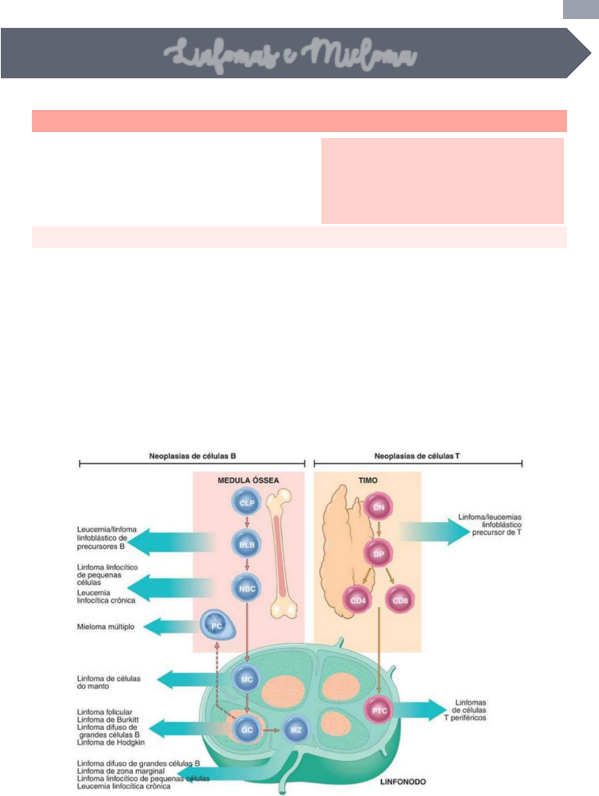 1 INTERPRETAÇÃO CLÍNICA I | P6 - UC 16 | MEDICINA UNIT AL 2021.2 – Mayra Alencar @maydicina Interpretação Clínica I | Aula 5 | UC 16 LINFOMAS • Os linfomas são neoplasias malignas provenientes de linfócitos em diferentes estágios de maturação. Se originam nos órgãos e tecidos linfoides: linfonodos, amigdalas, timo e baço. • Se dividem em linfomas de Hodgkin (LH) e não Hodgkin (LNH). CLASSIFICAÇÃO As neoplasias linfoides são classificadas em 5 categorias baseadas nas características clínicas, morfológicas, imunofenotípicas e genotípicas: • Neoplasias de linfócitos B precursores (pré-B) (linfócitos B imaturos). • Neoplasias periféricas de linfócitos B (linfócitos B maduros). • Neoplasias de linfócitos T precursores (pré-T) (linfócitos T imaturos). • Neoplasias periféricas de linfócitos T e NK (linfócitos T e NK maduros). • LH (neoplasias de células de Reed-Sternberg [RS]). A maioria das neoplasias linfoides (85% a 90%) tem origem nos linfócitos B, sendo a maior parte dos restantes tumores de linfócitos T; somente os tumores raros são de origem histiocítica ou de linfócitos NK. A maioria das neoplasias linfoides assemelha-se a algum estágio reconhecível do desenvolvimento dos linfócitos B ou T, uma característica usada em sua classificação. Linfomas e Mieloma A diferença entre linfomas e leucemia linfocítica, que acometem o tecido linfoide, é que a origem dos linfomas é no tecido linfoide e pode acometer a medula óssea e a origem da leucemia é na medula óssea, podendo acometer os linfonodos. 2 INTERPRETAÇÃO CLÍNICA I | P6 - UC 16 | MEDICINA UNIT AL 2021.2 – Mayra Alencar @maydicina Nesse material e nessa aula, o foco é apenas linfomas de Hodgkin e não Hodgkin. Linfoma de Hodgkin (LH) Linfoma Não Hodgkin (LNH) • Esclerose nodular • Celularidade mista • Rico em linfócitos • Com depleção de linfócitos • Com predominância de linfócitos • Linfomas indolentes • Linfomas agressivos • Linfomas altamente agressivos LINFOMA DE HODGKIN • Corresponde a 0,5-1% de todas as neoplasias malignas. • É um linfoma de células B. • Dois principais: o linfoma Hodgkin clássico, com uma célula neoplásica característica (Reed-Sternberg) e o linfoma de Hodgkin de predominância linfocítica, nodular, com uma célula linfocítica predominante característica, muito menos comum (~5% dos casos). • O LH é menos comum do que o LNH (25 a 30% dos casos). • Apresenta elevado comprometimento torácico, especialmente exprimindo- se com massa mediastinal e linfonodomegalia. Mais de 85% dos pacientes com LH apresentam linfonodomegalias mediastinais, diferentemente do LNH, no qual ocorrem dois terços dos casos, e no terço restante o comprometimento é extranodal (que é raro na LH). • Apresenta dois picos de incidência – na terceira e sexta décadas, sendo mais prevalente em homens. Junto com o LNH é a terceira neoplasia mais comum em crianças depois da leucemia linfocítica aguda (LLA) e neoplasias cerebrais. • As regiões brasileiras mais pobres apresentam um predomínio do tipo histológico de celularidade mista, enquanto nas mais ricas predomina o tipo esclerose nodular. Há também uma prevalência de infecção pelo EBV em pacientes com o tipo esclerose nodular. Células de Reed-Sternberg: células gigantes binucleadas, com nucléolos grandes e eosinófilos dando aspecto de “olho de coruja”. FISIOPATOLOGIA • A causa é desconhecida. Não está associado a exposição à radiação, produtos químicos, agentes biocidas, trabalho na saúde e profissões correlatas, ou tonsilectomia prévia. • O vírus Epstein-Barr (EBV) é o suspeito principal, com base em evidências sugestivas, mas ainda sem prova definitiva Ele infecta linfócitos B, estimulando sua proliferação. Em imunodeprimidos, o vírus se replica descontroladamente levando a proliferação de linfócitos B e levando a formação de células neoplásicas. QUADRO CLÍNICO • Linfadenopatia na área cervical, axilar ou mediastinal, e apenas em 10% das vezes surge como doença nodal inferior ao diafragma. • O envolvimento de linfonodos é geralmente indolor, mas alguns pacientes podem notar desconforto em sítios nodais acometidos imediatamente após ingerirem álcool. • Sintomas B clássicos: perda de peso significativa (>10% do peso nos últimos 6 meses), sudorese noturna ou febre persistente geralmente sinalizam doença disseminada ou localmente extensa e precisam de tratamento sistêmico. • O prurido generalizado, ocasionalmente severo, pode anteceder em vários anos o diagnóstico de LH. • Tosse ou estridor resultante de compressão traqueobrônquica por doença mediastinal ou dor óssea secundária ao envolvimento metastático. • Anemia sintomática ou pancitopenia (porque o LH pode acometer a medula óssea extensamente). • Síndromes paraneoplásicas (raras). 3 INTERPRETAÇÃO CLÍNICA I | P6 - UC 16 | MEDICINA UNIT AL 2021.2 – Mayra Alencar @maydicina Os sintomas B são chamados assim devido ao estadiamento dos linfomas: a letra B representa a presença de pelo menos um dos sintomas, enquanto a letra A significa ausência de todos eles. Indicam prognóstico ruim. +: > 90% dos casos positivos; +/ −: maioria dos casos positivos; - / +: minoria de casos positivos; -: <10% dos casos positivos. * A positividade do CD20 do LH clássico é bastante heterogênea, com ampla variação no brilho da coloração. ** No LH clássico, um padrão de crescimento nodular está confinado ao subtipo esclerosante nodular. • Diagnóstico diferencial: linfoma não Hodgkin, tumores de células germinativas, timoma, sarcoidose e tuberculose. A biópsia prontamente determina o diagnóstico. ESTADIAMENTO • Os testes para estadiamento de LH incluem: Anamnese completa para procura de sintomas B (febre, perda de peso, sudorese noturna) ou outros problemas sintomáticos sugerindo doença mais avançada. DIAGNÓSTICO • Baseado no recon