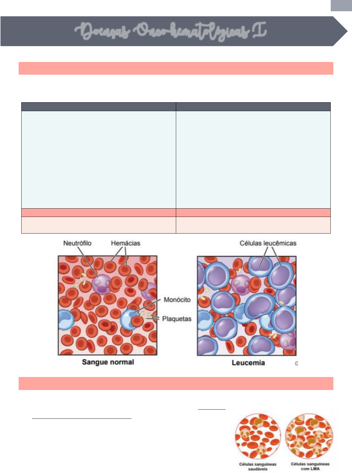 1 INTERPRETAÇÃO CLÍNICA I | P6 - UC 16 | MEDICINA UNIT AL 2021.2 – Mayra Alencar @maydicina Interpretação Clínica I | Aula 3 – Leucemias Agudas | UC 16 LEUCEMIAS • São um grupo de doenças caracterizadas pelo acúmulo de leucócitos malignos na medula óssea e no sangue. É um termo que designa um conjunto de cânceres que atingem as células brancas do sangue, que são produzidas pela medula óssea. AGUDAS CRÔNICAS • Progride rapidamente e produz células que não estão maduras, logo não realizam suas funções (perde a capacidade maturativa + rápido agravamento). • A transformação maligna ocorre em células-tronco da hematopoese ou em progenitores primitivos. • Acredita-se que o dano genético resulte em: aumento da velocidade de produção, diminuição da apoptose e bloqueio na diferenciação celular → acúmulo de células primitivas (blastos). • Denominador comum no hemograma das leucemias agudas → citopenia das 3 séries mieloides e presença de blastos leucêmicos em número variável e frequente. • Progride lentamente e os pacientes têm um número maior de células maduras (ainda realizam as funções retardando o agravamento). • A capacidade maturativa é mantida e a insuficiência hematopoiética é tardia. • O hemograma varia de acordo com a progênie de origem. LINFOIDE MIELOIDE • Derivadas do precursor linfoide (células NK, linfócitos T e B e plasmócitos). • Derivadas do precursor mieloide (mastócitos, basófilos, neutrófilos, eosinófilos e monócitos). LEUCEMIA MIELÓIDE AGUDA (LMA) • A leucemia mieloide aguda (LMA) é uma doença heterogênea caracterizada por proliferação clonal de precursores mieloides incapazes de se diferenciar em elementos celulares maduros → há acúmulo de formas imaturas (blastos) na medula óssea, sangue periférico ou em outros tecidos. • Quando essas células se cumulam chamam-se infiltração, tal infiltração na medula leva à redução na produção de elementos sanguíneos causando anemias, sangramentos e maior risco para infecções. • A célula de origem mieloide perde sua capacidade de diferenciação. • É o tipo leucêmico mais comum em adultos. Doenças Onco-hematológicas I 2 INTERPRETAÇÃO CLÍNICA I | P6 - UC 16 | MEDICINA UNIT AL 2021.2 – Mayra Alencar @maydicina Proliferação de um clone na medula óssea Perda da capacidade de diferenciação Infiltração medular Inibição da hematopoese Citopenia Sintomatologia ETIOLOGIA Fatores ambientais como exposição a agentes químicos, radiação, tabaco, drogas quimioterápicas são fatores de risco conhecidos. Anormalidades genéticas como trissomia do 21, anemia de Fanconi, mutações familiares no gene RUNX1, também algumas doenças hematológicas benignas (hemoglobinúria paroxística noturna e anemia aplásica) e malignas (síndromes mielodisplásicas e doenças mieloproliferativas crônicas). PATOGENIA • É caracterizada pela rápida proliferação de um clone que também perde sua capacidade de diferenciação → acúmulo de células imaturas no sangue periférico e medula óssea; • A proliferação do clone dentro da medula leva a uma inibição da hematopoese normal (impedindo que outras células sanguíneas sejam formadas) → anemia, plaquetopenia e neutropenia (essa redução nos níveis das células sanguíneas, chamado de citopenia, vai causar os sintomas). • Envolve alterações moleculares que alteram os processos de regulação de proliferação, diferenciação, apoptose e reparo do DNA. OBS: em idosos a doença é mais frequentemente associada a síndromes mielodisplásicas, mieloproliferativas e a fenótipos de resistência a múltiplas drogas. QUADRO CLÍNICO • Os aspectos clínicos são dominados pelo quadro de insuficiência da medula óssea causada pelo acúmulo de células malignas; • Principais sinais e sintomas são decorrentes da pancitopenia. • Dispneia, fraqueza, palidez cutânea e mucosa (+ todos os sintomas da anemia). • Pode haver petéquias, equimoses e sangramentos gengivais, epistaxe e menorragia → pela plaquetopenia. • Aumento da susceptibilidade a infecções → principalmente de vias aéreas superiores, pulmonares, gastrointestinais e cutâneas → pela neutropenia. • Risco de coagulação intravascular disseminada pela intensa plaquetopenia. • Dores ósseas generalizadas devido a expansão medular. • Presença de febre é indicador de infecção → pesquisar focos e iniciar Antibioticoprofilaxia de amplo espectro de imediato. • Os pacientes apresentam hiper viscosidade sanguínea pela proliferação dos blastos. • Hipermetabolismo celular → crise artrítica gotosa e Nefrolitíase por cristais de urato. • 10% dos pacientes podem apresentar cefaleia, alteração visual e de nervos cranianos → realizar TC ou RM para descartar hemorragia intracraniana. • EXAME FÍSICO: pode haver hipertrofia gengival (infiltração leucêmica), candidíase orofaríngea e amigdalite → sempre avaliar a cavidade oral. • Presença eventual de sarcomas granulocíticos (tumores extramedulares localizados em ossos, no periósteo, em linfonodos, na pele e em tecidos moles). 3 INTERPRETAÇÃO CLÍNICA I | P6 - UC 16 | MEDICINA UNIT AL 2021.2 – Mayra Alencar @maydicina HEMOGRAMA NAS LEUCEMIAS AGUDAS Independente da classificação, o diagnóstico de LA se origina dos sintomas que irão indicar necessidade de hemograma. Pensar em LA quando: • Anemia de rápida instalação → sem que haja perda sanguínea que justifique e havendo sinais sistêmicos de LA; • Púrpura recente → equimose, petéquias e sangramento das mucosas forem súbitos e notados em pacientes em BEG; • Febre ou outros sinais de infecção com anemia e/ou púrpura recentes → apresentação clássica de LA (pancitopenia); • Dor óssea → pesquisa por pressão digital no esterno; • Linfonodomegalia e esplenomegalia; • Dor reumática em crianças; • Gengivite hipertrófica. MIELOGRAMA 
