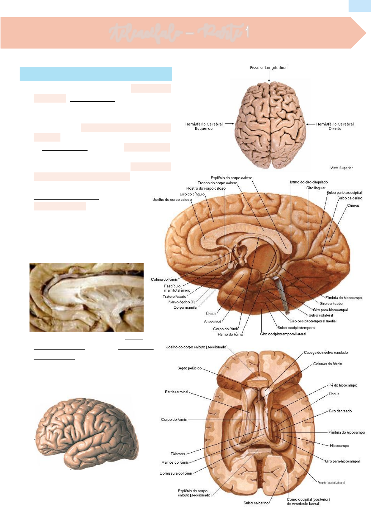 1 PROBLEMAS MENTAIS E DE COMPORTAMENTO | P6 - UC 16 | MEDICINA UNIT AL 2021.2 – Mayra Alencar @maydicina Anatomia | Aula 1 – Lobo frontal/parietal, área de Broca e pré-frontal | UC 16 TELENCÉFALO • O telencéfalo compreende 2 HEMISFÉRIOS CEREBRAIS, direito e esquerdo, e uma pequena linha mediana situada na porção anterior do III ventrículo. • Os dois hemisférios cerebrais são incompletamente separados pela FISSURA LONGITUDINAL DO CÉREBRO, cujo assoalho é formado por uma larga faixa de fibras comissurais, denominada CORPO CALOSO, principal meio de união entre os dois hemisférios. • Os hemisférios possuem cavidades, os VENTRÍCULOS LATERAIS DIREITO E ESQUERDO, que se comunicam com o III ventrículo pelos forames interventriculares. • SEPTO PELÚCIDO: entre o corpo caloso e o fórnix. Constituído por duas delgadas lâminas de tecido nervoso que delimitam uma cavidade muito estreita, a cavidade do septo pelúcido. Ele separa os dois ventrículos laterais. • Cada hemisfério possui 3 polos: frontal, occipital e temporal e 3 faces: súpero-lateral, medial e inferior, repousando anteriormente nos andares anterior e médio da base do crânio e posteriormente na tenda do cerebelo. Telencéfalo – Parte 1 Polo temporal Polo occipital Polo frontal 2 PROBLEMAS MENTAIS E DE COMPORTAMENTO | P6 - UC 16 | MEDICINA UNIT AL 2021.2 – Mayra Alencar @maydicina Lobo frontal Lobo temporal Lobo parietal Lobo occipital Lobo da ínsula 3 PROBLEMAS MENTAIS E DE COMPORTAMENTO | P6 - UC 16 | MEDICINA UNIT AL 2021.2 – Mayra Alencar @maydicina LOBO FRONTAL E PARIETAL • SULCO PRÉ-CENTRAL: mais ou menos paralelo ao sulco central. • SULCO FRONTAL SUPERIOR: inicia-se na porção superior do sulco pré-central e dirige-se anteriormente no lobo frontal. É perpendicular a ele. • SULCO FRONTAL INFERIOR: partindo da porção inferior do sulco pré-central, dirige-se para frente e para baixo. • SULCO LATERAL (DE SYLVIUS): é o sulco que separa o lobo frontal do lobo temporal. Ele é subdividido em ramos ascendente, anterior e posterior. • SULCO CENTRAL (DE ROLANDO): separa o lobo parietal do frontal. O sulco central é ladeado por dois giros paralelos, um anterior, giro pré-central, e outro posterior, giro pós-central. As áreas situadas adiante do sulco central relacionam-se com a MOTRICIDADE, enquanto as situadas atrás deste sulco relacionam-se com a SENSIBILIDADE. • GIRO PRÉ-CENTRAL: localiza-se entre o sulco central e o sulco pré-central. Neste giro se localiza a área motora principal do cérebro (córtex motor). • GIRO PÓS-CENTRAL: localiza-se entre o sulco central e o sulco pós-central. É no giro pós-central que se localiza uma das mais importantes áreas sensitivas do córtex, a área somestésica. • GIRO FRONTAL SUPERIOR: localiza-se acima do sulco frontal superior. • GIRO FRONTAL MÉDIO: localiza-se entre o sulco frontal superior e inferior. • GIRO FRONTAL INFERIOR: localiza-se abaixo do sulco frontal inferior. O giro frontal inferior do hemisfério esquerdo é o centro cortical da palavra falada. PARTE ORBITAL: inferiormente ao ramo anterior é a mais anterior e continua com a superfície inferior do lobo frontal. PARTE TRIANGULAR: entre o ramo anterior e o ascendente, logo encontrando- se entre as outras duas opções. PARTE OPERCULAR: posteriormente ao ramo ascendente, é a mais posterior e forma parte do opérculo frontal. 4 PROBLEMAS MENTAIS E DE COMPORTAMENTO | P6 - UC 16 | MEDICINA UNIT AL 2021.2 – Mayra Alencar @maydicina • SULCO INTRAPARIETAL: geralmente localiza-se perpendicular ao sulco pós-central (com o qual pode estar unido) e estende-se para trás para terminar no lobo occipital. • LÓBULO PARIETAL SUPERIOR: localiza-se superiormente ao sulco intraparietal. • LÓBULO PARIETAL INFERIOR: localiza-se inferiormente ao sulco intraparietal. Neste, descrevem-se dois giros: o giro supramarginal, curvando em torno da extremidade do ramo posterior do sulco lateral, e o giro angular, curvando em torno da porção terminal e ascendente do sulco temporal superior. ÁREA DE BROCA X GIRO DE BROCA • FUNÇÃO: é relacionada a motricidade da fala enquanto a área de Wernick está relacionada a sensibilidade da fala. • LOCALIZAÇÃO: o giro de broca é formado pela parte triangular e opercular do giro frontal inferior esquerdo + a área de Wernick (ou seja, é a área de broca + área de Wernick). • CORRELAÇÃO ANATOMOCLÍNICA: caso a área de Broca seja lesionada, ocorre a AFASIA DE BROCA = as pessoas conseguem em geral entender o significado das palavras e saber como elas desejam responder. No entanto, elas têm dificuldade em encontrar as palavras ao falar. ÁREA PRÉ-FRONTAL CEREBRAL • O córtex pré-frontal é considerado como a base de processos cognitivos complexos (raciocínio, planificação e flexibilidade mental), assim como também desempenha um papel importante no controle emocional e na personalidade. • A parte orbitofrontal está relacionada com aspectos emocionais do comportamento e do controle inibitório, e a área medial tem implicações no aspecto motivacional e da iniciativa de comportamento. • Uma lesão pré-frontal pode resultar numa diversidade de perturbações, tanto cognitivas, como volitivas e emocionais. • Córtex pré-frontal – pode ser subdividido em dorso-lateral, medial e orbital: permite o controle, organização e coordenação de funções cognitivas, respostas emocionais e comportamentos, mediante funções de auto-regulação, ou auto-controle, designadas como funções executivas. • Área motora-primária (área 4) – movimentos dos membros. • Área pré-motora (área 6 e parte posterior da área 8) – Apraxia. • Área de Broca (áreas 44 e 45) – fala, inputs da visão e audição. • Campo ocular frontal (área 8) – visão. A ocorrência de comportamentos antissociais tem vindo a ser associada a alterações estruturais pré-frontais relacionadas com perturbação do funcioname