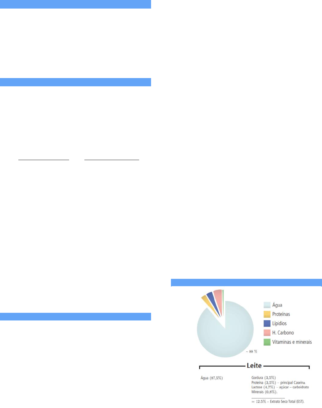 Bromatologia Leite Introdução ✦ O leite é uma mistura complexa de lipídeos, carboidratos, proteínas e minerais. ✦ Suas características organolépticas são constituídas por: ✎ Aspecto: Líquido opaco e fluído; ✎ Coloração: Branca ou amarelada; ✎ Odor: Próprio; ✎ Sabor: Característico. Definições ✦ O leite é uma combinação de elementos sólidos em água. Sendo os sólidos representando cerca de 12 a 13% do leite e água com os 87%. ✦ Os principais elementos sólidos do leite são: lipídeos, carboidratos, proteínas, sais minerais e vitaminas. ✦ Os elementos, suas distribuições e interações vão determinar a estrutura, propriedades funcionais e aptidão do leite para processamento. ✦ As micelas de caseína e os glóbulos de gordura são responsáveis pela maior parte das características físicas (estrutura e cor) encontradas nos produtos lácteos. ✦ Os componentes do leite permanecem em equilíbrio, de modo que a relação é muito estável. O conhecimento dessa estabilidade é a base para os testes que são realizados com o objetivo de apontar a ocorrência de problemas que alteram a composição do leite. ✦ Sólidos Totais (ST) ou Extrato Seco Total (EST) englobam todos os componentes do leite exceto a água, logo, EST = todos os componentes – H2O. ✦ Sólidos não-gordurosos (SNG) ou Extrato Seco Desengordurado (ESD) compreendem-se todos os elementos do leite, menos água e gordura, ou seja, ESD = todos os componentes – H20 - % gordura. ✦ Uma redução substancial da concentração de lactose ou dos sólidos totais poderia levantar suspeitas de adição fraudulenta de água, após a ordenha. Nesse caso, ocorrem alterações das propriedades físicas do leite, facilmente detectáveis em laboratório. Componentes do leite Carboidratos: ✦ O principal é a lactose, que é produzida pelas células epiteliais da glândula mamária e é a principal fonte de energia dos recém-nascidos. Além da lactose, podem ser encontrados no leite outros carboidratos, como a glicose e a galactose, mas em pequenas quantidades. ✦ A lactose compreende aproximadamente 52% dos sólidos totais do leite desnatado e 70% dos sólidos encontrados no soro do leite. Controla o volume do leite produzido, atraindo a água do sangue para equilibrar a pressão osmótica na glândula mamária. ✦ A concentração de lactose no leite é de aproximadamente 5%. É um dos elementos mais estáveis do leite, ou seja, menos sujeito a variações. Proteínas: ✦ Representam entre 3% e 4% dos sólidos. A porcentagem varia, dentre outros fatores, como a raça e é proporcional à quantidade de gordura presente no leite. Significando que quando maior a porcentagem de gordura no leite, maior será a de proteína. ✦ Existem vários tipos de proteínas no leite, mas a principal é a caseína, que apresenta alta qualidade nutricional e é muito importante na fabricação de queijos. ✦ A gordura e a caseína têm importância fundamental para a manufatura de vários derivados lácteos, sendo que representam a maior concentração de elementos sólidos dos queijos. Gordura: ✦ A gordura do leite está presenta na forma de pequenos glóbulos, suspensos na fase aquosa. Cada glóbulo é envolvido por uma camada formada por um componente da gordura denominado fosfolipídio. ✦ A maior parte da gordura do leite é constituída de triglicerídeos, formados por ácidos graxos ligados ao glicerol. ✦ A fração de gordura do leite serve de veículo para as vitaminas lipossolúveis (K, E, D, A), colesterol e outras substâncias solúveis em gordura, como os carotenoides que dão ao leite sua cor amarelo-creme. ✦ A concentração de gordura no leite varia entre 3,5 e 5,3%, em razão de diferenças entre raças, estágio de lactação e de acordo com a alimentação dos animais. Vitaminas e Sais Minerais: ✦ O leite é uma fonte excelente da maioria dos sais minerais necessários para o desenvolvimento dos indivíduos. O cálcio e o fósforo do leite apresentam alta disponibilidade, e se encontram associados à caseína. ✦ Há vitaminas do complexo B e vitamina C associadas. ✦ O leite é uma fonte importante de vitamina C (ácido ascórbico), mas está é rapidamente oxidada na presença de cobre em um produto biologicamente inativo. Composição básica Obs: se houver a retirada do teor de gordura, proteína, lactose e minerais, o resultado se chama de Extrato Seco Total (EST). Classificação Em função da presença de bactérias. Tratamentos térmicos ✦ Pasteurização: se dá pelo aquecimento a 72-75℃, por 15-20s, seguido de resfriamento. ✦ UHT (Ultra High Temperature): se dá pelo aquecimento a 130-140℃ por 2-4s, seguido de resfriamento a 32℃ e envase em embalagens assépticas. Para eliminação das bactérias mais resistentes. Observação: Para quê serve o tratamento térmico? ✎ Aquecimento: eliminação das bactérias e gera uma agitação das moléculas. ✎ Resfriamento: traz de volta a sua estruturação evitando reações químicas. Qualidade do leite ✦ Sua qualidade é definida por parâmetros de composição química, características físico-químicas e higiene. ✦ A presença e os teores de proteína, gordura, lactose, sais minerais e vitaminas determinam a qualidade da composição, que é influenciada pela alimentação, manejo, genética e raça do animal. ✦ Fatores ligados a cada animal, como o período de lactação, o escore corporal ou situações de estresse também são importantes quanto à qualidade composicional. ✦ As exigências de qualidade e higiene para o leite cru e derivados lácteos são definidas com base em postulados estabelecidos para a proteção da saúde humana e preservação das propriedades nutritivas desses alimentos. Fatores que influenciam a qualidade do leite ✦ Rebanho – Animais sadios • Fonte de contaminação interna: infecções; • Fonte de contaminação externa: sujeiras na mama. ✦ Utensílios: 