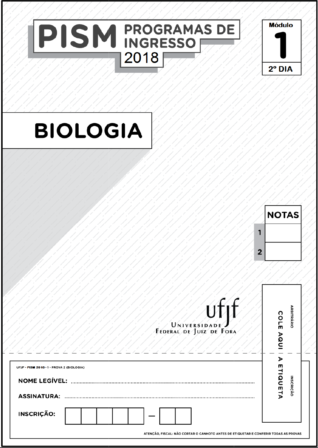 ATENÇÃO: 1. Suas respostas devem estar escritas obrigatoriamente com caneta esferográfica azul ou preta, de corpo transparente. 2. ESCREVA SEU NOME E ASSINE SOMENTE NO ESPAÇO PRÓPRIO DA CAPA. 3. NÃO FAÇA NAS DEMAIS PÁGINAS QUALQUER MARCA PARA ALÉM DO SEU TEXTO. Qualquer tipo de identificação pessoal do candidato nas folhas de questões acarretará sua eliminação. 4. Não ultrapasse o espaço que está pautado nas questões. Página 1 de 1 UNIVERSIDADE FEDERAL DE JUIZ DE FORA PISM 2018 – Módulo I – Dia 2 PROVA DISCURSIVA DE BIOLOGIA QUESTÃO 1 - Quando fazemos atividade física para emagrecer é necessário controlar a proporção de exercício aeróbico e anaeróbico que realizamos para aumentar a eficiência da queima de gordura, já que há grande diferença na quantidade de ATP produzido nos dois tipos de exercício. Sobre exercício aeróbico e anaeróbico, responda: a) Em qual tipo de exercício, aeróbico ou anaeróbico, você espera maior produção de ATP? Por quê? b) Qual o papel do oxigênio no processo de síntese de ATP? c) Por que o processo de síntese de ATP que ocorre nas mitocôndrias é chamado de fosforilação oxidativa? QUESTÃO 2 – Vários protozoários vivem em ambiente de água doce onde as concentrações de seus fluidos internos são maiores que as do meio, condição que lhes impõe um importante desafio que pode levar à ruptura e, consequentemente, morte do protozoário. a) Que processo físico-químico está envolvido nesse problema? Como esse processo se dá na situação exposta no enunciado da questão? b) O que significa dizer que a membrana plasmática é uma membrana semi-permeável? c) Exposta às mesmas condições que o protozoário do enunciado, uma célula vegetal se romperia? Por quê? COORDENAÇÃO GERAL DE PROCESSOS SELETIVOS – COPESE MÓDULO I DO PISM – TRIÊNIO 2017-2019 INSTRUÇÕES PARA A REALIZAÇÃO DA PROVA DISCURSIVA --------------------------------------------------------------------- CORTE AQUI ------------------------------------------------------------------- Antes de abrir esse caderno, leia atentamente as instruções. Antes da prova: � Não use em sala: boné, chapéu, chaveiros de qualquer tipo, óculos escuros, relógio e similares. � Se você possui cabelos compridos, mantenha-os presos, deixando as orelhas descobertas. � Mantenha com você somente materiais de escrita, documento de identificação, alimentos, água (em garrafa transparente) e medicamentos, se necessário. Tudo o mais que trouxer deve ficar no saco plástico que você recebeu, amarrado e colocado embaixo da cadeira. � Assine a lista de presença com a assinatura idêntica à da sua identidade. � Se solicitado pelo Fiscal, assine a Ata de Abertura do Lacre da pasta que contém as provas. � Quando autorizado, vire o caderno e preencha os dados na capa. � Abra seu caderno e confira se sua prova tem 2 questões. Caso haja algum problema, solicite imediatamente a substituição de seu caderno de questões. � Você terá 4 horas e 30 min para fazer as provas de hoje. Você só pode sair da sala 1h e 30min depois do início do exame. � Será excluído do concurso o candidato que for flagrado portando ou mantendo consigo celular e/ou aparelho e componente eletrônico. Durante a prova: � Suas respostas devem estar escritas obrigatoriamente com caneta esferográfica azul ou preta, de corpo transparente. � Devolva ao fiscal esse caderno de questões completo. Se não fizer isso, sua prova não será corrigida. � Se as folhas do seu caderno se soltarem, por algum motivo, peça ao fiscal que as grampeie novamente. � Os três últimos candidatos deverão permanecer até o final da prova para assinar a Ata de Encerramento do exame. � Comunique aos fiscais qualquer irregularidade observada durante a realização da prova. Se eles não tomarem as devidas providências, solicite a presença do Coordenador do Setor ou fale com ele depois que você sair da sala.
