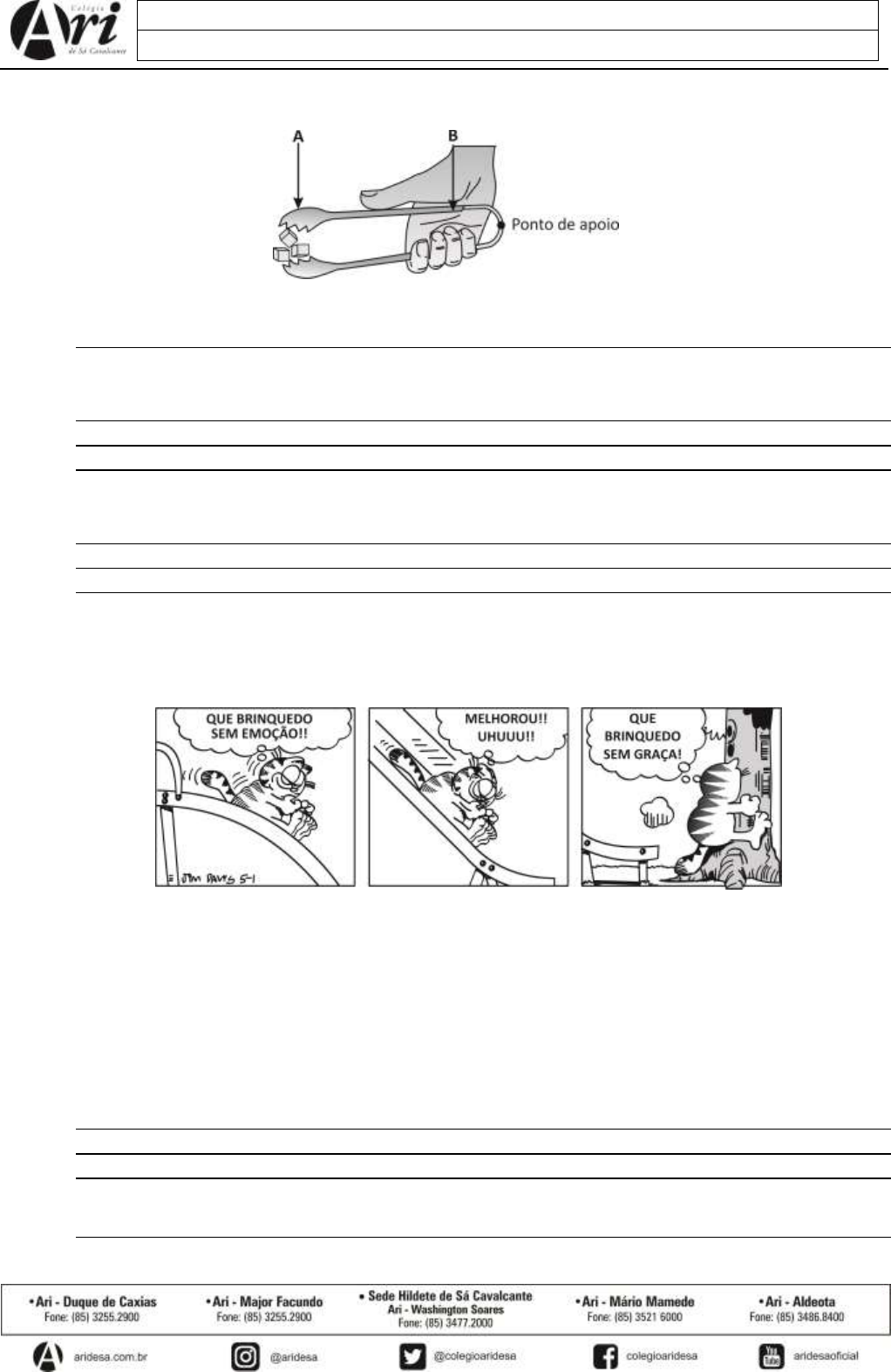 LISTA DE ATIVIDADES 1 – CIÊNCIAS – 7º ANO – 1ª ETAPA Aluno(a): 1. Um homem precisava retirar gelos de dentro de uma vasilha e resolveu utilizar uma pinça, conforme está sendo demonstrado na imagem abaixo. Disponível em: https://www.mesoatomic.com/pt-br/fisica/mecanica/estatica/maquinas-simples (adaptado). a) Em qual tipo de máquina simples essa pinça pode ser classificada? b) Em que ponto, A ou B, a pessoa aplicará menor força ao utilizar a pinça para pegar o gelo? Justifique sua resposta. c) Nesse tipo de máquina, existe uma força potente e outra força resistente. Levando em consideração essa imagem, comente a ação dessas duas forças durante o uso da pinça ao segurar o gelo. 2. A tirinha de humor a seguir ilustra um brinquedo muito comum em parques e jardins – o escorregador. Provavelmente, em algum dia da sua vida, você teve a oportunidade de brincar em um brinquedo como esse e perceber que a velocidade no final da descida é maior do que no início. 1 2 3 Davis, J. (1988) Disponível em: http://www.propostasensinodefisica.net/2_Atividades/mec-conserv._de%20_energia.pdf (adaptado). 2.1. Considerando a tirinha, pode-se concluir que a) Garfield não gostou do brinquedo, pois esse tipo de alavanca o machucou durante a brincadeira. b) a árvore serviu de ponto de apoio durante a utilização da força potente, o que deixou o Garfield emocionado. c) durante a brincadeira, Garfield se sentiu veloz e animado à medida que o plano foi se tornando mais inclinado. d) Garfield precisou realizar um grande esforço enquanto descia no escorregador, situação comum no plano inclinado. 2.2. Em qual quadrinho da tirinha, 1 ou 2, Garfield apresenta a maior velocidade? Justifique sua resposta. 2.3. Qual tipo de máquina simples melhor representa esse brinquedo? OSG 1485/20 2 3. Observando a imagem, é possível perceber que a gangorra está pendendo para o lado de João, deixando Maria suspensa. Considerando a distância das crianças em relação ao centro de apoio e suas massas, a situação apresentada é possível de acontecer? Justifique utilizando cálculos. Disponível em: https://br.freepik.com/vetores-gratis/criancas-brincando-de-gangorra-no-fundo-branco_3577529.htm#page=1&query=gangorra&position=0 4. Observe a imagem que representa alguns tipos de máquinas e responda aos itens. Disponível em: https://pt.slideshare.net/karenrojassoza/maquinas-simples-28297465/4?smtNoRedir=1 (adaptado). Disponível em: http://aulasdecienciasdmobio.blogspot.com/p/atividade-sobre-maquinas-simples-7-ano.html (adaptado). Disponível em: https://brainly.com.br/tarefa/17653353 (adaptado). a) Qual dessas máquinas pode ser considerada composta? Justifique sua resposta. b) Quais imagens podem ser consideradas como um plano inclinado? c) Qual o princípio da utilização da máquina de número 5? 5. A imagem a seguir mostra dois tipos de caminhões utilizados pelos bombeiros. Disponível em: https://pt.wikipedia.org/wiki/Escada_de_m%C3%A3o 3 Nº de REGISTRO ACADÊMICO – RA OSG 1485/20 a) O caminhão de bombeiro demonstrado é uma máquina simples ou composta? Justifique sua resposta. b) Cite dois tipos de máquinas simples que podem ser visualizados na imagem. c) Escolha uma máquina simples citada no item b e defina o seu princípio de funcionamento.
