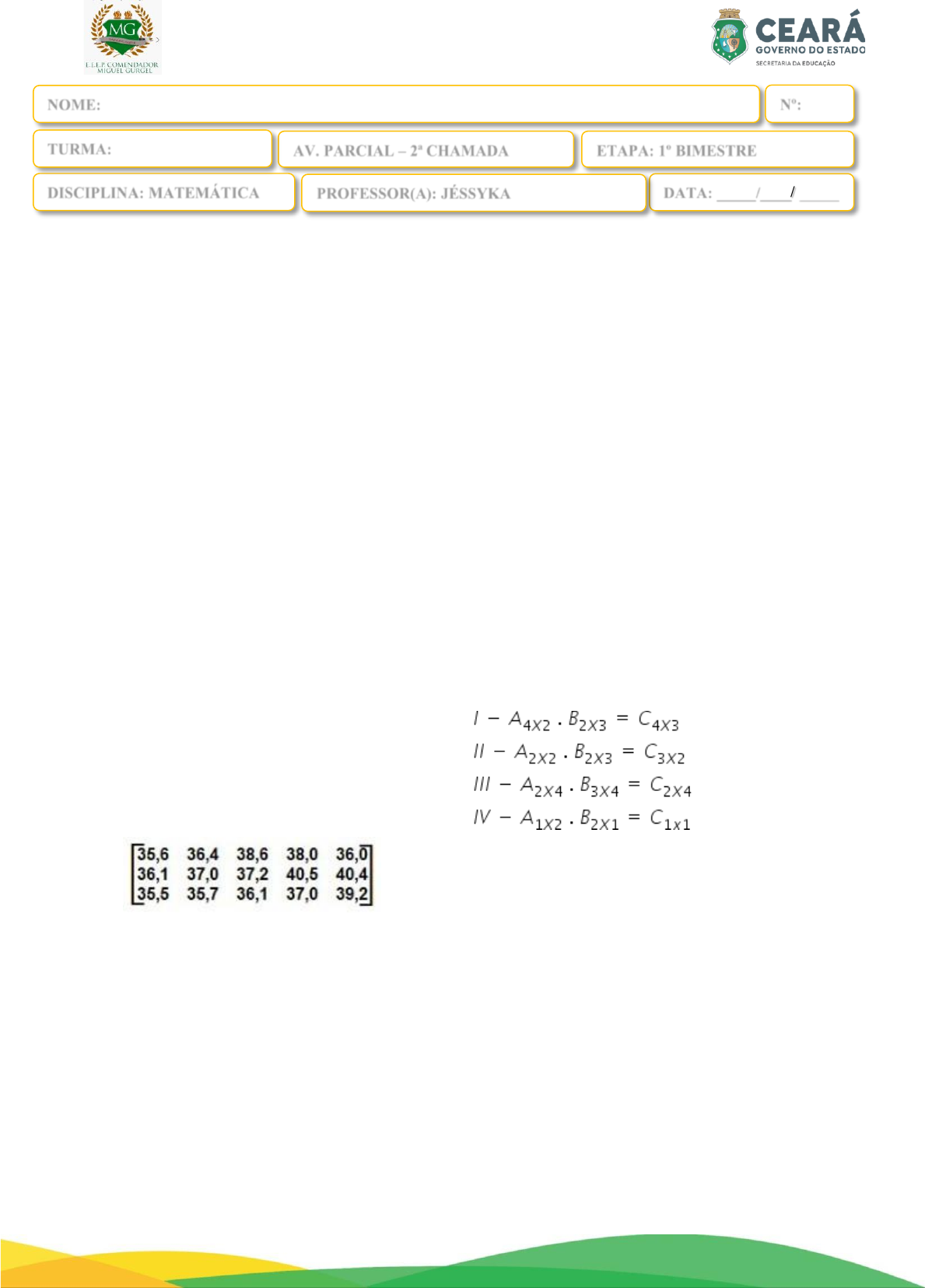 E.E.E.P. COMENDADOR MIGUEL GURGEL 01. Sobre as matrizes, julgue as afirmativas a seguir: I – A matriz linha é aquela que possui uma única linha. II – A matriz coluna é aquela que possui uma única coluna. III – A matriz quadrada é aquela que possui número de linhas igual ao número de colunas. Marque a alternativa correta. A) Somente I é falsa. B) Somente II é falsa. C) Somente III é falsa. D) Todas são verdadeiras. 02. Analise a matriz a seguir: ( 1 5 1 3 4 0 1 −2 −3 ) A soma dos termos a22 e a32 é igual a A) -1 B) -2 C) 0 D) 1 E) 2 03. (UERJ — adaptada) A temperatura corporal de um paciente foi medida, em graus Celsius, três vezes ao dia (de manhã, de tarde e de noite), durante cinco dias. Cada elemento aij da matriz abaixo corresponde à temperatura observada no instante i do dia j. Julgue as afirmativas a seguir: I - No momento a21, o paciente estava com a temperatura de 36,1. II - As temperaturas do momento a33 e do momento a21 são iguais. III - No momento a35, a temperatura era de 39,2. A ordem correta é A) V F V B) F V V C) F F V D) V V V 04. Analise a matriz A a seguir: A = ( 1 3 4 −2 5 9 −1 2 7 ) A diferença entre o produto dos elementos da diagonal principal e o produto dos elementos da diagonal secundária é A) 15 B) 20 C) 35 D) 55 05. Uma matriz A5x5 possui lei de formação aij = 5i − j². A soma dos termos da diagonal principal é A) 12 B) 15 C) 18 D) 20 06. (PM - ES) Sobre multiplicação de matrizes, Fabiana escreveu as seguintes sentenças em seu caderno: Está correto o que Fabiana afirma A) apenas em I. B) apenas em II. C) apenas em I e III. D) apenas em I e IV. 07. São dadas as matrizes A = ( 9 2 8 −1 8 −4 0 7 3 ), B = ( 1 −2 −8 1 2 4 0 −7 7 ) e C = ( 10 0 0 0 10 0 0 0 10 ). Observe as afirmativas a seguir. I. C = A + B II. C é uma matriz triangular III. C é uma matriz diagonal IV. C é uma matriz identidade AV. PARCIAL – 2ª CHAMADA DATA: _____/____/ _____ NOME: ___________________________________________________________________________________ Nº: _____ DISCIPLINA: MATEMÁTICA PROFESSOR(A): JÉSSYKA TURMA: ETAPA: 1º BIMESTRE Está(ão) correta(s) apenas a(s) afirmativa(s) A) I. B) I e II. C) I, II e III. D) I, II, III e IV. 08. (UFRGS) A matriz C fornece, em reais, o custo das porções de arroz, carne e salada usados em um restaurante. A matriz P fornece o número de porções de arroz, carne e salada usados na composição dos pratos tipo P1, P2 e P3. A matriz que fornece o custo de produção, em reais, dos pratos P1, P2 e P3 é A) ( 4 4 4 ) B) ( 7 9 8 ) C) ( 9 11 4 ) D) ( 2 8 6 ) 09. (UNESP 2016) Um ponto P, de coordenadas (x, y) do plano cartesiano ortogonal, é representado pela matriz coluna ( 𝑥 𝑦), assim como a matriz coluna ( 𝑥 𝑦) representa, no plano cartesiano ortogonal, o ponto P de coordenadas (x, y). Sendo assim, o resultado da multiplicação matricial ( 0 −1 1 0 ) ∙ ( 𝑥 𝑦) é uma matriz coluna que, no plano cartesiano ortogonal, necessariamente representa um ponto que é A) uma rotação de P em 90º no sentido anti-horário, e com centro em (0, 0). B) simétrico de P em relação ao eixo horizontal x. C) simétrico de P em relação ao eixo vertical y. D) uma rotação de P em 90º no sentido horário, e com centro em (0, 0). 10. (Unicamp 2017) Sendo a um número real, considere a matriz A = ( 1 𝑎 0 −1 ). Então, A2017 é igual a A) ( 1 0 0 1 ) B) ( 1 𝑎 0 −1 ) C) ( 1 1 1 1 ) D) (1 𝑎2017 0 −1 ) QUESTÕES ABERTAS 11. Dadas as matrizes A = ( 1 2 3 −4 5 6 4 6 8 ), B = ( −7 −8 9 12 6 5 8 7 4 ), e C = ( 2 3 −4 6 7 1 2 8 7 ), determine a matriz D resultante da operação A + B – C. 12. Construa a matriz quadrada de ordem 2 cuja lei de formação é bij = 2i + 3j – 5. 13. Considere as matrizes A = ( 4 5 2 3 ) e B = ( 4 2𝑥 + 1 3𝑥 − 4 3 ). Sabendo que as matrizes A e B são iguais, determine o valor de x + y.