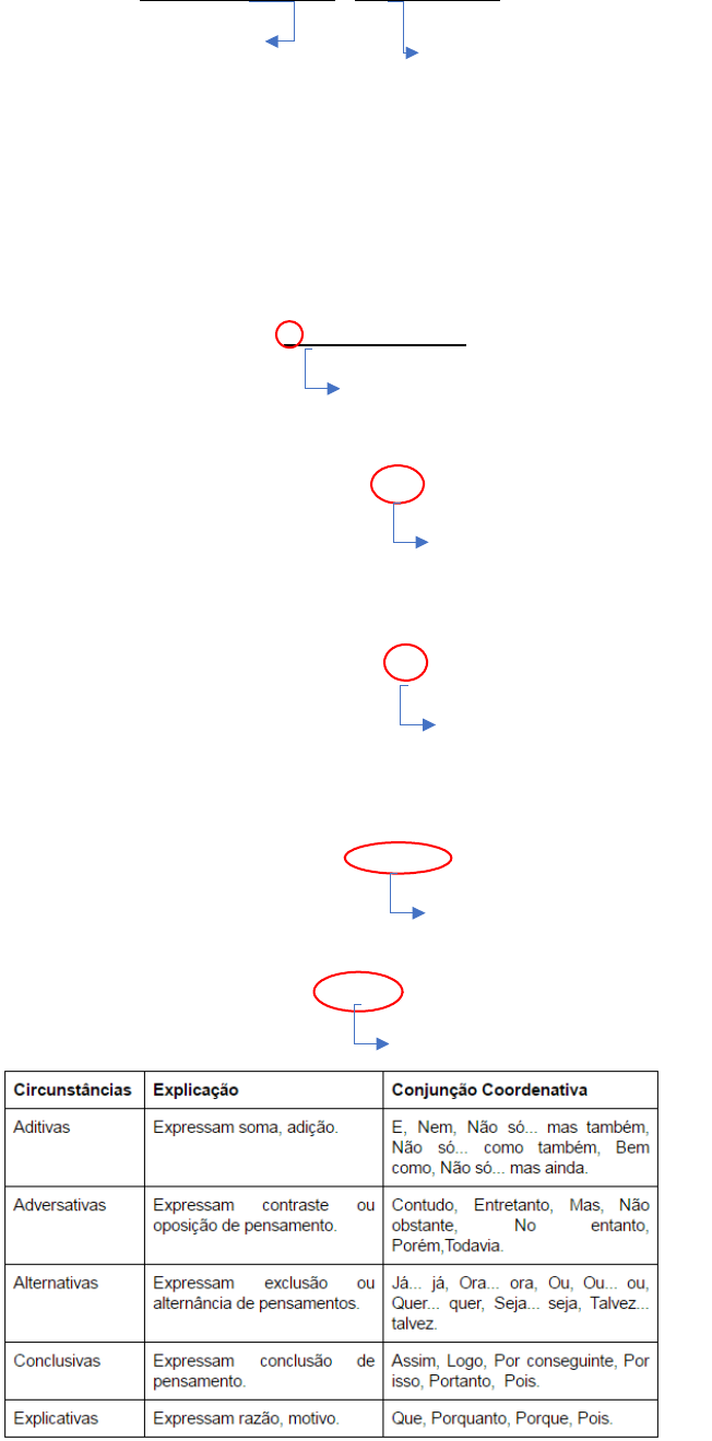 CONJUNÇÕES COORDENATIVAS E DE ORAÇÕES COORDENADAS Orações coordenadas: São aquelas consideradas independentes sintaticamente por terem sentido completo. Se não iniciarem por conjunção serão classificadas como assindéticas, se iniciarem, sindéticas. Ele está aqui dentro / e não quer sair.2ª oração: Coordenada sindética 1ª oração: Coordenada assindética Orações coordenadas assindéticas: são marcadas por vírgula, ponto e vírgula ou dois-pontos. Ex.: Tudo passa, tudo muda, o mundo permanece. Classificação das orações coordenadas sindéticas: · Aditivas: ideia de acréscimo, soma ou adição com outra oração. Aproveite/ e relaxe no seu dia.conjunção aditiva · Adversativa: ideia de oposição ou contraste. O Rio de Janeiro continua lindo, / mas a cidade está mudando.conjunção adversativa · Alternativas: ação alternada ou um fato que se exclui. Você pode ter aula presencial /ou pode ter aula online.conjunção alternativa · Conclusiva: ideia de conclusão ou consequência lógica em relação a oração anterior. Não estudei o suficiente,/ portanto irei mal na prova.conjunção conclusiva · Explicativa: explicação, razão ou motivo expressa na oração anterior. Aproveite que hoje ainda é dia de folga,/ porque amanhã voltaremos ao trabalho.conjunção explicativa Aulas de Reforço Larissa Criscuolo – CNPJ: 30.776.197/0001-16 Av. São Miguel, 4098 – Ponte Rasa. Telefone para contato: (11) 94864-6495 Orações Subordinadas: São aquelas consideradas dependentes sintaticamente por não terem sentido completo, ou seja, apresentam um período composto por subordinação. Oração Subordinada Substantiva: é aquela que tem o valor de um substantivo e normalmente é introduzida por conjunções subordinativas integrantes que ou se, desempenhando em relação a oração principal a função de sujeito, objeto direto, objeto indireto, complemento nominal, predicativo, aposto ou agente da passiva. Classificação das orações subordinadas substantivas: · Subjetiva: a oração principal não apresenta sujeito, portanto, faz esse papel. O verbo da oração principal está sempre na 3ª pessoa do singular (ele/ela) Começam com “que” ou “se”, pronomes indefinidos ou pronomes interrogativos. Completam orações principais que começam como: “É possível...Não é justo...Parece...Acontece...” OU em oração principal com verbo na voz passiva: “Foi dito...Estava planejado...É sabido...” Ex.: É possível /que tenhamos um mundo mais justo? · Objetiva Direta: exerce a função de objeto direto quando na oração principal tem um verbo transitivo expressando atitude, percepção ou vontade. Liga-se diretamente ao verbo SEM preposição. Ex.: Todos querem / que se punam os culpados · Objetiva Indireta: exerce a função de objeto indireto e tem características parecidas com a objetiva direta, porém liga-se a um verbo COM preposição. Ex.: Todos duvidam/ de que se punam os culpados. · Completiva Nominal: liga-se a um nome da oração principal através de uma preposição. Funciona como complemento nominal de um substantivo abstrato, adjetivo ou advérbio. Ex.: Todos têm esperança / de que se punam os culpados. · Predicativa: funciona como predicativo do sujeito e liga-se ao sujeito da oração principal pelo verbo de ligação “ser”. Ex.: A resposta da justiça é /que se punam os culpados. · Apositiva: funciona como aposto, então costuma ser introduzida por dois-pontos. Ex.: O povo faz um pedido: /que se punam os culpados. RESUMO A punição dos culpados é necessária. ⇒ sujeito Todos querem a punição dos culpados. ⇒ objeto direto Todos duvidam da punição dos culpados. ⇒ objeto indireto Todos têm esperança da punição dos culpados. ⇒ complemento nominal A resposta da justiça é a punição dos culpados. ⇒ predicativo do sujeito O povo faz um pedido: a punição dos culpados. ⇒ aposto ORAÇÕES SUBORDINADAS ADVERBIAIS • Oração subordinada porque desempenha uma função sintática em relação à oração principal. • Oração adverbial porque ocupa na frase o lugar que seria de um advérbio. Dependendo da conjunção adverbial utilizada, as orações adverbiais têm sentidos diferentes, que podem ser agrupados em quatro tipos, relação de: causalidade, temporalidade, contraste, modo e comparação. Aulas de Reforço Larissa Criscuolo – CNPJ: 30.776.197/0001-16 Av. São Miguel, 4098 – Ponte Rasa. Telefone para contato: (11) 94864-6495 image1.png image2.jpeg image3.png