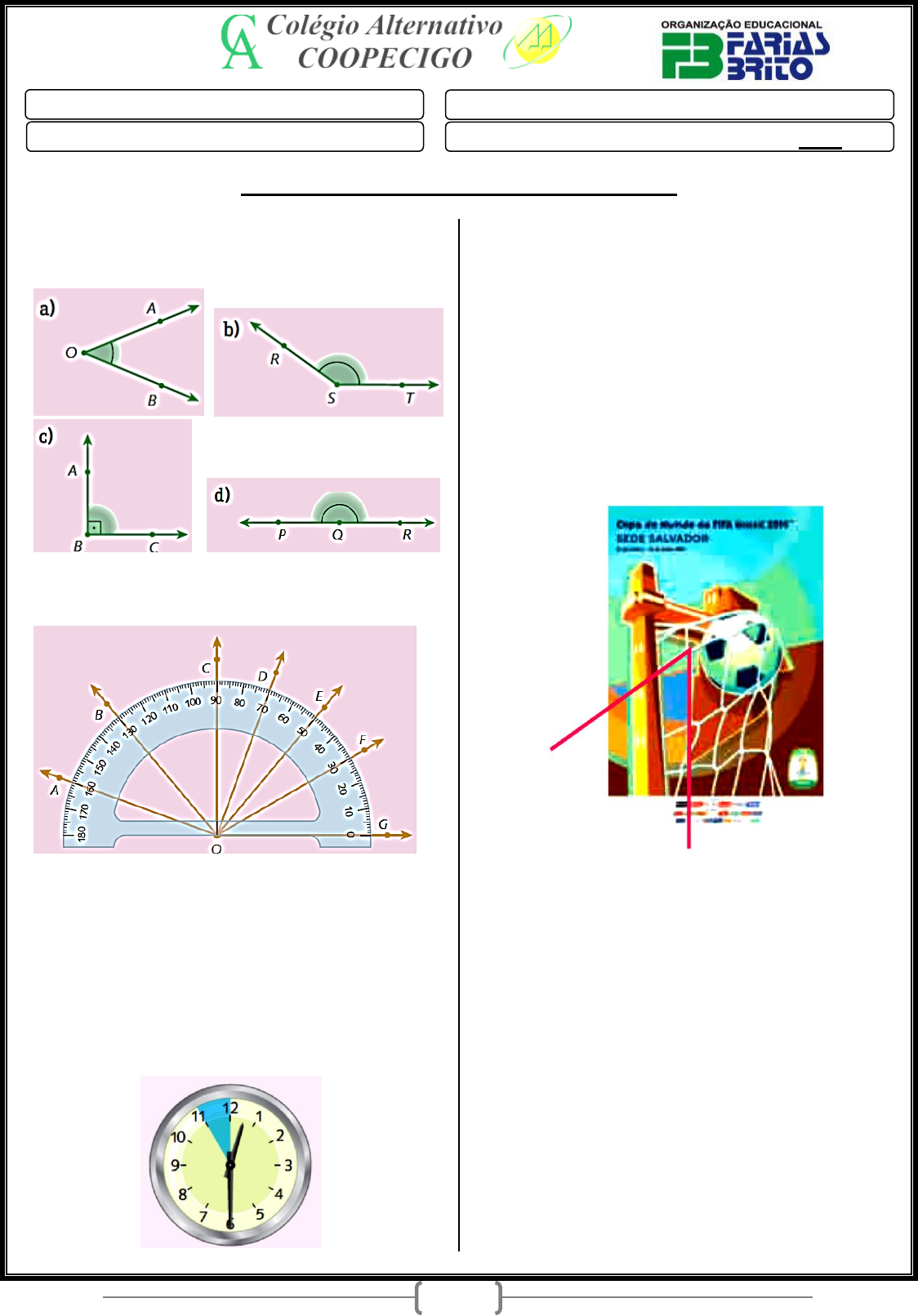 1 Disciplina: Geometria Aluno(a): Professor (a): Mattheus Ano: 7º Data: ____/____/2020 ATIVIDADE COMPLEMENTAR DE GEOMETRIA 1. Identifique o nome, o vértice e os lados de cada ângulo: 2. Determine as medidas dos ângulos representa- dos abaixo: a) med(GÔF) b) med(GÔE) c) med(DÔC) d) med(GÔD) e) med(AÔD) f) med(CÔF) g) med(CÔF) h) med(AÔG) 3. Observe o relógio abaixo e, responda às ques- tões: a) Quanto mede o ângulo pintado? b) Quanto mede o menor ângulo formado pelos ponteiros? c) Quanto mede o maior ângulo formado pelos pon- teiros? 4. O Elevador Lacerda, transformado em trave de futebol, e uma bola estufando a rede que o envolve foram utilizados como pôster oficial de Salvador na Copa do Mundo realizada no Brasil em 2014. O ângulo destacado no pôster tem quantos graus? Ele é reto ou obtuso? 5. Classifique as sentenças em verdadeiro (V) ou falso (F): a) ( ) Os ângulos retos medem 90°. b) ( ) As medidas de um ângulo agudo é maior que 90°. c) ( ) Dois ângulos retos são congruentes. d) ( ) A medida de um ângulo obtuso é maior que 90°. e) ( ) Dois ângulos obtusos são sempre congruen- tes. f) ( ) A medida de um ângulo obtuso é maior que a de um ângulo agudo. 2 6. Com um transferidor, meça e registre a medida de cada ângulo. 7. Com um transferidor, determine a medida dos ângulos da figura abaixo. Depois, indique os ângulos congruentes. a) AÔB b) BÔC c) CÔD d) DÔE e) EÔF f) FÔG g) AÔC h) EÔA i) FÔC j) EÔB 8. Observe a figura abaixo e indique pares de ângu- los adjacentes. 9. Observe a figura seguinte e indique: a) dois ângulos adjacentes ao ângulo AÔB; b) dois ângulos adjacentes ao ângulo DÔE. 10. Na ilustração abaixo OB é a bissetriz de AÔC e OD é bissetriz de CÔE. a) Qual é a medida de AÔB, se med(BÔC) = 35? b) Qual é a medida de CÔD, se med(DÔE) = 25°? c) Qual é a medida de DÔA? 11. Na figura abaixo, OC é a bissetriz de AÔB e med(AÔC) = 25°. Determine as medidas de AÔB e BÔC. 12. Calcule a medida do complemento de cada um dos ângulos cuja medida está abaixo. a) 76° b) 46° c) 38° d) 0° e) 82° f) 85° g) 26° h) 90° 13. Calcule a medida do suplemento de cada ângu- lo cuja medida está abaixo. a) 76° b) 30° c) 0° d) 128° e) 175° f) 180° 3 14. Observe a figura e determine três pares de ân- gulos opostos pelo vértice e três pares de ângulos ad- jacentes suplementares. 15. Relacione as colunas: 16. Os ângulos abaixo têm as seguintes medidas: a = 120°, b = 90°, c = 20° e d = 30° Classifique os seguintes ângulos: a) x = b + d b) y = a – c c) z = b + c – d d) k = a – b + c + d 17. Responda: a) Um ângulo de 35° e um de 65° são complemen- tares? b) Um ângulo de 58° e um de 32° são complemen- tares? c) Um ângulo de 70° e um de 110° são suplementa- res? d) Um ângulo de 86° e um de 104° são suplementa- res? 18. Na figura, as letras representam as medidas dos ângulos assinalados. Quais os pares congruentes? 19. Calcule as medidas indicadas pelas letras: 20. Determine as medidas x e y, em grau, em cada figura: