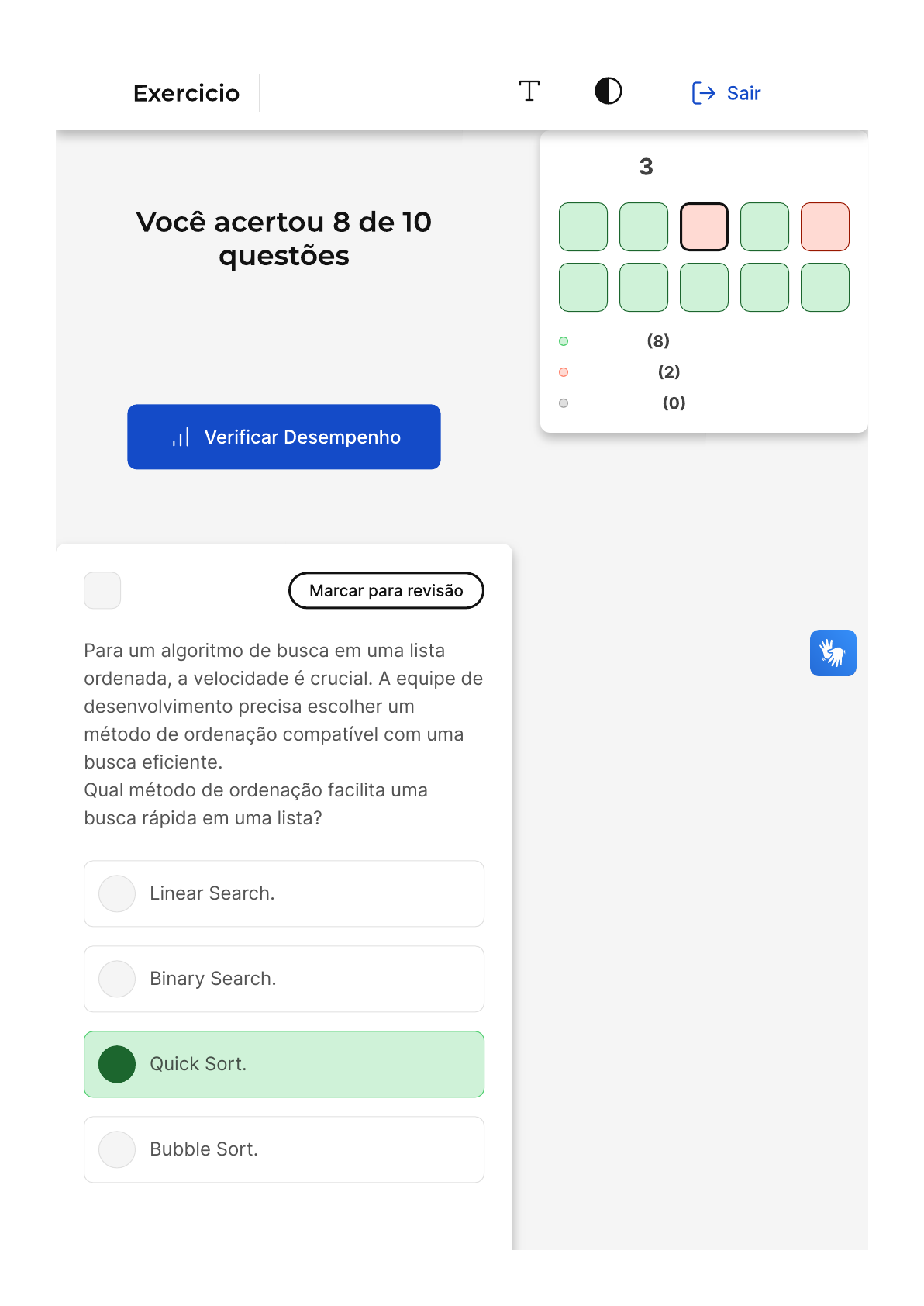 Verifique o seu desempenho e continue treinando! Você pode refazer o exercício quantas vezes quiser. A B C D 1 Para um algoritmo de busca em uma lista ordenada, a velocidade é crucial. A equipe de desenvolvimento precisa escolher um método de ordenação compatível com uma busca eficiente. Qual método de ordenação facilita uma busca rápida em uma lista? Linear Search. Binary Search. Quick Sort. Bubble Sort. Questão de 10 Corretas Incorretas Em branco 1 2 3 4 5 6 7 8 9 10 Algoritmos De Ordenação Avançados Firefox https://estacio.saladeavaliacoes.com.br/exercicio/664a98d25fe07b85... 1 of 13 19/05/2024, 21:30 E A B C Heap Sort. Parabéns, você selecionou a alternativa correta. Confira o gabarito comentado! O Quick Sort é ideal para preparar listas para buscas rápidas, como a busca binária, devido à sua eficiência na ordenação. Algoritmos como Bubble Sort podem ser menos eficientes, tornando as buscas subsequentes mais lentas. 2 O "Bubble Sort", ou "Ordenação por Bolha" em tradução livre, é um dos algoritmos de ordenação mais simples. O que acontece com o maior valor na lista durante o processo de ordenação crescente do "Bubble Sort"? É movido para a esquerda. É deixado onde está. É movido para o centro. Firefox https://estacio.saladeavaliacoes.com.br/exercicio/664a98d25fe07b85... 2 of 13 19/05/2024, 21:30 D E É empurrado para baixo. É continuamente empurrado até o fim da passagem. Parabéns, você selecionou a alternativa correta. Confira o gabarito comentado! O maior valor na lista está em alguma comparação. Como a ordenação é do tipo crescente, esse valor será continuamente empurrado até o fim da passagem. 3 Firefox https://estacio.saladeavaliacoes.com.br/exercicio/664a98d25fe07b85... 3 of 13 19/05/2024, 21:30 A B C D E Considere que os percentuais foram inseridos no vetor vet de 5 posições, a partir da posição 1, na seguinte sequência: 25.33, 27.72, 27.10, 26.90 e 27.31, ou seja, com os dados de 2008 até 2012. Um técnico em processamento de dados do TCE�RS utilizou um método para ordenar os dados de vet. O método realizou os seguintes passos no processo de ordenação: • Passo 1 � 25.33 27.72 27.10 26.90 27.31; • Passo 2 � 25.33 27.10 27.72 26.90 27.31; • Passo 3 � 25.33 26.90 27.10 27.72 27.31; • Passo 4 � 25.33 26.90 27.10 27.31 27.72. Trata-se do método de ordenação: Bubble sort Selection sort Quick sort Fast sort Insertion sort Opa! A alternativa correta é a letra E. Confira o gabarito comentado! O método de ordenação utilizado pelo técnico em processamento de dados do Firefox https://estacio.saladeavaliacoes.com.br/exercicio/664a98d25fe07b85... 4 of 13 19/05/2024, 21:30 A B C D TCE�RS é o Insertion sort. Esse método de ordenação é caracterizado por dividir o vetor em duas partes: uma ordenada e outra não ordenada. A cada passo, o algoritmo pega o primeiro elemento da parte não ordenada e insere na posição correta na parte ordenada. Isso é feito repetidamente até que todos os elementos estejam na parte ordenada. No exemplo dado, podemos observar que a cada passo, o elemento é inserido na posição correta na parte já ordenada, caracterizando o método Insertion sort. 4 Em um projeto de software, foi identificada a necessidade de um algoritmo de ordenação eficiente para grandes volumes de dados. A equipe decidiu utilizar um algoritmo avançado de ordenação para melhorar a performance. Qual algoritmo de ordenação avançado seria mais adequado para este cenário? Bubble Sort. Insertion Sort. Quick Sort. Selection Sort. Firefox https://estacio.saladeavaliacoes.com.br/exercicio/664a98d25fe07b85... 5 of 13 19/05/2024, 21:30 E A B Linear Search. Parabéns, você selecionou a alternativa correta. Confira o gabarito comentado! O Quick Sort é ideal para grandes volumes de dados devido à sua alta eficiência e velocidade. Diferentemente de algoritmos elementares como Bubble Sort ou Selection Sort, o Quick Sort divide os dados em subconjuntos menores para ordená-los rapidamente, sendo mais adequado para o cenário descrito. 5 O algoritmo de ordenação Shell Sort, ou simplesmente Shell Sort, é uma generalização do algoritmo de inserção que permite a troca de itens distantes. Qual é o propósito das sentinelas em algumas variações da ordenação "Shell Sort"? Aumentar a eficiência do algoritmo. Guardar valores especiais de terminação. Firefox https://estacio.saladeavaliacoes.com.br/exercicio/664a98d25fe07b85... 6 of 13 19/05/2024, 21:30 C D E A B C Organizar a sequência de incrementos. Facilitar a visualização do código. Indicar o começo e o fim do array. Opa! A alternativa correta é a letra B. Confira o gabarito comentado! As sentinelas guardam valores especiais de terminação. 6 Uma empresa de tecnologia está desenvolvendo um sistema de arquivos que exige ordenação estável para manter a ordem de registros iguais. Qual algoritmo de ordenação oferece a característica de ser estável? Quick Sort. Heap Sort. Shell Sort. Firefox https://estacio.saladeavaliacoes.com.br/exercicio/664a98d25fe07b85... 7 of 13 19/05/2024, 21:30 D E Merge Sort. Radix Sort. Parabéns, você selecionou a alternativa correta. Confira o gabarito comentado! O Merge Sort é um algoritmo de ordenação estável, o que significa que mantém a ordem relativa de registros iguais. Essa característica é crucial em sistemas onde a ordem dos registros deve ser preservada. 7 Em relação aos algoritmos de ordenação, avalie se as afirmativas a seguir são verdadeiras �V� ou falsas �F�� I. O algoritmo quick sort é muito eficiente quando há uma quantidade pequena de elementos a ordenar. II. O algoritmo shell sort utiliza intensamente a inserção direta. III. No algoritmo bubble sort, o número de variáveis envolvidas é pequeno. As afirmativas I, II e III são, respectivamente: Firefox https://estacio.saladeavaliacoes.com.br/exercicio/664a98d25fe07b85... 8 of 13 19/05/2024, 21:30 A B C D E V, F 