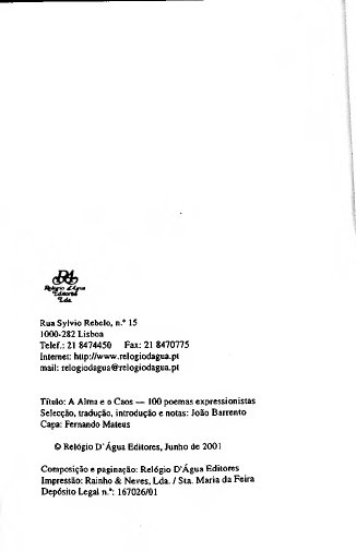 © Relógio D’Água Editores, Junho de 2001 io Rebelo, n.° 15 ’ Lisboa Rua Sylvic 1000-2821 Telef.: 21 8474450 Fax: 21 8470775 Internet: http://www.relogiodagua.pt mail: relogiodagua@relogiodagua.pt Composição e paginação: Relógio D’Água Editores Impressão: Rainho & Neves, Lda. / Sta. Maria da Feira Depósito Legal n.°: 167026/01 Título: A Alma e o Caos — 100 poemas expressionistas Selecção, tradução, introdução e notas: João Barrento Capa: Fernando Mateus http://www.relogiodagua.pt mailto:relogiodagua@relogiodagua.pt A Alma e o Caos 100 poemas expressionistas Selecção, tradução, introdução e notas de JOÃO BARRENTO Poesia SBD-FFLCH-USP 4 1 5 2 6 5 <^53^1 > Nota DEDALUS - Acervo - FFLCH ininnnnn 20900202414 A Alma e o Caos — 100 Poemas Expressionistas é uma versão revista actualizada e aumentada da antologia de poesia expressionista alemã que publiquei em 1978. Para a presente edição foi completamente refeita a ordenação dos poemas, organizados agora segundo os núcleos da poesia expressionista propostos na nova introdução. ! Primeira Estação: Fim do mundo1 Jakob van Hoddis WELTENDE (1911) 40 Der Sturm ist da, die wilden Meere hupfen An Land, um dicke Dãmme zu zerdrücken. Die meisten Menschen haben einen Schnupfen. Die Eisenbahnen fallen von den Brücken. Dem Bürger fliegt vom spitzen Kopf der Hut, In allen Lüften hallt es wie Geschrei, Dachdecker stürzen ab und gehn entzwei Und an den Kusten — liest man — steigt die Flut. Jakob van Hoddis FIM DO MUNDO 41 Voa o chapéu ao bicocéfalo burguês. Os ares enchem-se de gritos e rumores. Desintegrando-se, caem telhadores, E — segundo as notícias — sobem as marés. Chegou a tempestade, saltam mares ululantes Para terra: esmagar diques é sua intenção. Em quase toda a parte grassa constipação. Os comboios precipitam-se das pontes. DER VISIONARR (1918) 42 Lampe blõck nicht. Aus der Wand fuhr ein diinner Frauenarm. Er war bleich und blau geâdert. Die Finger waren mit kostbaren Ringen bepatzt. Ais ich die Hand küBte, erschrak ich: Sie war lebendig und warrn. Das Gesicht wurde mir zerkratzt. Ich nahm ein Küchenmesser und zerschnitt ein paar Adem. Eine groBe Katze leckte zierlich das Blut vom Boden auf. Ein Mann indes kroch mit gestrãubten Haaren Einen schrãg an die Wand gelegten Besenstiel hinauf. O VISIOTÁRIO 43 Lâmpada, não fumegues. Da parede saiu um braço magro de mulher. Era pálido e de veias azuladas. Os dedos carregados de preciosos anéis. Quando beijei a mão, assustei-me: Estava viva e quente. Arranhou-me a cara. Peguei numa faca de cozinha e cortei algumas veias. Um grande gato lambia graciosamente o sangue do chão. E entretanto um homem de cabelos em pé trepava Pelo cabo de uma vassoura encostada à parede. KINEMATOGRAPH (1911) 44 Es zieht ihr Pfad sich bald durch Lãrchenwãlder, Bald kriimmt er sich und drãuend steigt die schiefe Felswand empor. Die Aussicht in der Tiefe Beleben Kühe und Kartoffelfelder. Man zückt Revolver, Eifersucht wird rege, Herr Piefke duelliert sich ohne Kopf. Dann zeigt man uns mit Kiepe und mit Kropf Die Ãlplerin auf màchtig steilem Wege. Der Saal wird dunkel. Und wir sehn die Schnellen Der Ganga, Palmen, Tempel auch des Brahma, Ein lautlos tobendes Familiendrama Mit Lebemãnnem dann und Maskenbãllen. Und in den dunklen Raum - mir ins Gesicht - Flirrt das hinein, entsetzlich! nach der Reihe! Die Bogenlampe zischt zum Schluss nach Licht - Wir schieben geil und gãhnend und ins Freie. ANIMATÓGRAFO 45 Puxa-se do revólver, o ciúme investe, O senhor Piefke bate-se sem cabeça. Depois vemos, de cesta e de cabaça, A montanhesa pela encosta agreste. A sala escureceu. Passam os rápidos Do Ganges, palmeiras, templos de Brama, Numa família, um cruel e mudo drama, E logo foliões e mascarados. Segue o caminho, ora por pinheirais, Ora encostado à parede rochosa, E sinuoso. Em baixo, a vista goza Um quadro vivo de vacas e batatais. E sala adentro, mesmo à minha frente, Formiga aquilo sem parar! Mas que cruz! Enfim tremula a lâmpada, vem luz - E, bocejando cio, sai toda a gente.