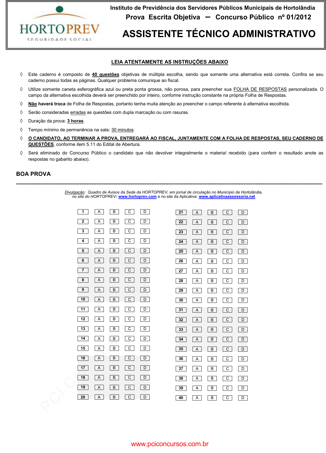pcimarkpci MjgwNDowZDQxOmU2NDM6YjQwMDoyMTBiOmQ1OWQ6MjU5MjpjNDFi:RnJpLCAzMSBNYXkgMjAyNCAwNzo0OTo1NSAtMDMwMA== www.pciconcursos.com.br Instituto de Previdência dos Servidores Públicos Municipais de Hortolândia Prova Escrita Objetiva – Concurso Público nº 01/2012 ASSISTENTE TÉCNICO ADMINISTRATIVO LEIA ATENTAMENTE AS INSTRUÇÕES ABAIXO Este caderno é composto de 40 questões objetivas de múltipla escolha, sendo que somente uma alternativa está correta. Confira se seu caderno possui todas as páginas. Qualquer problema comunique ao fiscal. Utilize somente caneta esferográfica azul ou preta ponta grossa, não porosa, para preencher sua FOLHA DE RESPOSTAS personalizada. O campo da alternativa escolhida deverá ser preenchido por inteiro, conforme instrução constante na própria Folha de Respostas. Não haverá troca de Folha de Respostas, portanto tenha muita atenção ao preencher o campo referente à alternativa escolhida. Serão consideradas erradas as questões com dupla marcação ou com rasuras. Duração da prova: 3 horas. Tempo mínimo de permanência na sala: 30 minutos O CANDIDATO, AO TERMINAR A PROVA, ENTREGARÁ AO FISCAL, JUNTAMENTE COM A FOLHA DE RESPOSTAS, SEU CADERNO DE QUESTÕES, conforme item 5.11 do Edital de Abertura. Será eliminado do Concurso Público o candidato que não devolver integralmente o material recebido (para conferir o resultado anote as respostas no gabarito abaixo). BOA PROVA ----------------------------------------------------------------------------------------------------------------------------------------------------------------------------------- Divulgação: Quadro de Avisos da Sede da HORTOPREV, em jornal de circulação no Município de Hortolândia, no site do HORTOPREV: www.hortoprev.com e no site da Aplicativa: www.aplicativaassessoria.net 1 A B C D 2 A B C D 3 A B C D 4 A B C D 5 A B C D 6 A B C D 7 A B C D 8 A B C D 9 A B C D 10 A B C D 11 A B C D 12 A B C D 13 A B C D 14 A B C D 15 A B C D 16 A B C D 17 A B C D 18 A B C D 19 A B C D 20 A B C D 21 A B C D 22 A B C D 23 A B C D 24 A B C D 25 A B C D 26 A B C D 27 A B C D 28 A B C D 29 A B C D 30 A B C D 31 A B C D 32 A B C D 33 A B C D 34 A B C D 35 A B C D 36 A B C D 37 A B C D 38 A B C D 39 A B C D 40 A B C D www.pciconcursos.com.br pcimarkpci MjgwNDowZDQxOmU2NDM6YjQwMDoyMTBiOmQ1OWQ6MjU5MjpjNDFi:RnJpLCAzMSBNYXkgMjAyNCAwNzo0OTo1NSAtMDMwMA== www.pciconcursos.com.br www.pciconcursos.com.br pcimarkpci MjgwNDowZDQxOmU2NDM6YjQwMDoyMTBiOmQ1OWQ6MjU5MjpjNDFi:RnJpLCAzMSBNYXkgMjAyNCAwNzo0OTo1NSAtMDMwMA== www.pciconcursos.com.br __________________________________________________________________________________________________________ Assistente Técnico Administrativo - Página 3 de 8 Instituto de Previdência dos Servidores Públicos Municipais de Hortolândia Prova Escrita Objetiva – Concurso Público nº 01/2012 ASSISTENTE TÉCNICO ADMINISTRATIVO CONHECIMENTOS BÁSICOS: PORTUGUÊS O texto a seguir é referência para as questões 1 e 2. CARTAS DE AMOR Eu era aluno do Júlio de Castilhos e estudava à tarde (as manhãs, naquela época, estavam reservadas às turmas femininas). Um dia cheguei para a aula, coloquei meus livros na carteira e ali estava, bem no fundo, um papel cuidadosamente dobrado. Era uma carta; dirigida não a mim, mas “ao colega da tarde”. E era uma carta de amor. De amor não; de paixão. Paixão fogosa, incontida, transbordante, a carta de uma alma sequiosa de afeto. À qual o jovem escritor não teve a menor dificuldade de responder. Iniciou-se assim uma correspondência que se prolongou pelo ano letivo, não se interrompendo nem com as provas, nem com as férias de julho. À medida que o ano ia chegando ao fim, os arroubos epistolares iam crescendo. Cheguei à conclusão de que precisava conhecer a minha misteriosa correspondente, aquela bela da manhã que me encantava com suas frases. Mas… Será realmente bela? A julgar pela letra, sim; eu até a imaginava como uma moça esguia, morena, de belos olhos verdes. Contudo, nem mesmo os grandes especialistas em grafologia estão imunes ao erro, e um engano poderia ser trágico. Além disto, eu já tinha uma namorada que não escrevia, mas era igualmente fogosa. Optei, portanto, pelo mistério, pelo “nunca te vi, sempre te amei”. A minha história de amor continuou somente na fantasia. Que é o melhor lugar para as grandes histórias de amor. (SCLAIR, Moacyr. “Cartas de Amor” in: Minha Mãe não Entende Nada. 2a. Edição. Porto Alegre, L&PM, 1996) 1) De acordo com o narrador, a fantasia é o melhor lugar para as grandes histórias de amor, porque: a) As grandes histórias de amor só existem na fantasia, que envolve a imaginação, a situação irreal, construída a partir do desejo daquilo que gostaríamos de ser ou ter e não da realidade. b) Verdadeiras histórias de amor embasam-se no “Nunca te vi, sempre te amei”. c) Ele já tinha uma namorada que não escrevia, mas era igualmente fogosa. d) Paixão fogosa, incontida, transbordante, só existe na fantasia onde o jovem escritor não tem a menor dificuldade de responder. 2) Considere as seguintes afirmações: I. O narrador quis manter a imagem que ele construiu por meio da letra e das frases que sua correspondente escrevia. II. Se o narrador conhecesse a sua correspondente, a realidade poderia não corresponder a sua fantasia então, optou pelo mistério, pelo “nunca te vi, sempre te amei”. III. A separação dos alunos por sexo e turno representa um modelo da organização escolar típica da educação atual. IV. O autor do texto encontrou uma carta endereçada ao colega da tarde, cujo tema era amor, paixão. Está correto o que se afirma em: a) I, II e III apenas. b) II, III e IV apenas. c) III e IV apenas. d) I, II e IV apenas. 3) A alternativa em que todas as palavras não levam acento gráfico é: a) gas, juri, nuvem. b) item, nuvem, rainha. c) heroglifo, javenes, urutu. d) ritimo, atras, garoa. 4) Identifique a alternativa em que todas as