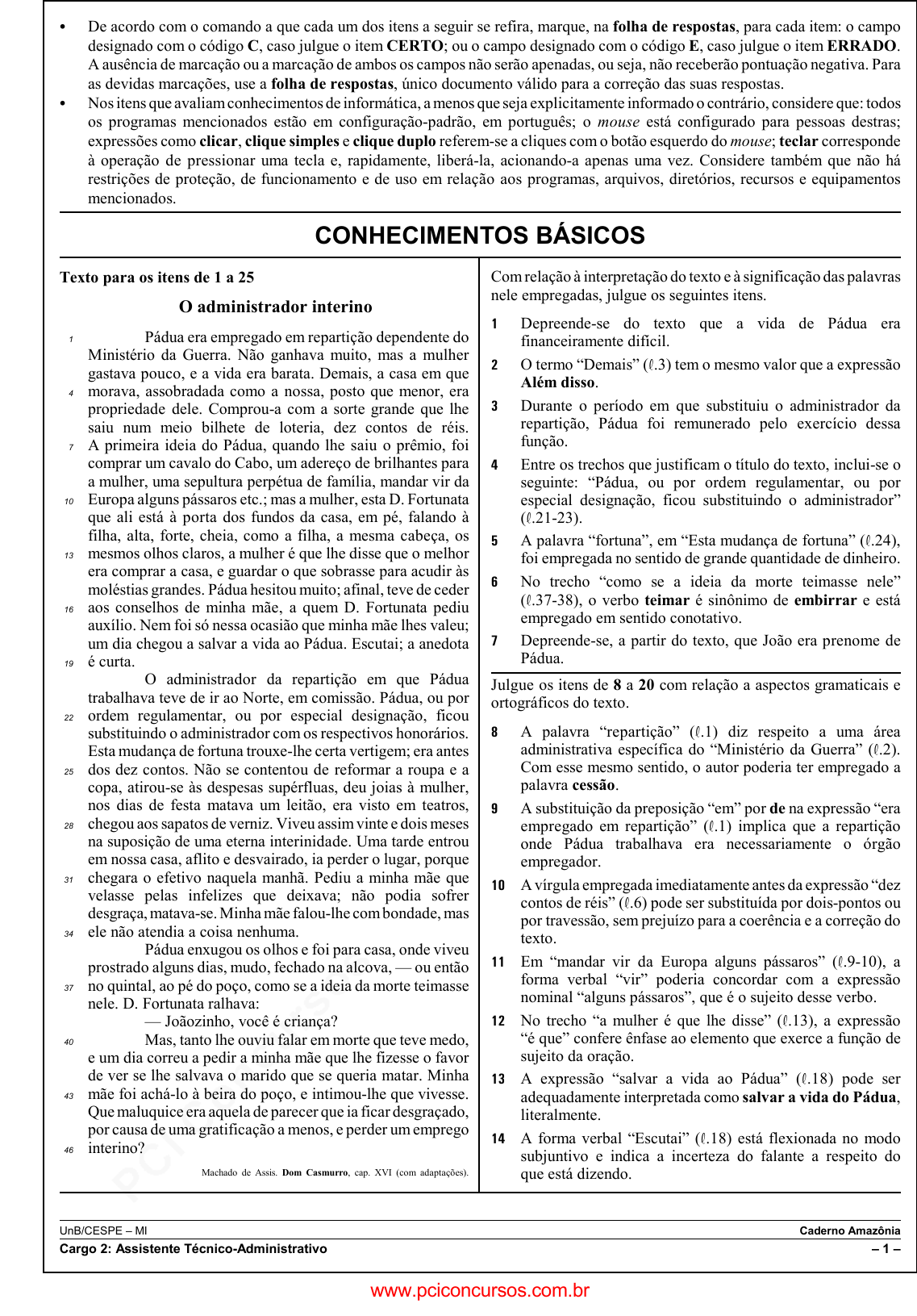 pcimarkpci MjgwNDowZDQxOmU2NDM6YjQwMDoyMTBiOmQ1OWQ6MjU5MjpjNDFi:RnJpLCAzMSBNYXkgMjAyNCAwNzo1NTowNCAtMDMwMA== www.pciconcursos.com.br UnB/CESPE – MI Caderno Amazônia Cargo 2: Assistente Técnico-Administrativo – 1 – De acordo com o comando a que cada um dos itens a seguir se refira, marque, na folha de respostas, para cada item: o campo designado com o código C, caso julgue o item CERTO; ou o campo designado com o código E, caso julgue o item ERRADO. A ausência de marcação ou a marcação de ambos os campos não serão apenadas, ou seja, não receberão pontuação negativa. Para as devidas marcações, use a folha de respostas, único documento válido para a correção das suas respostas. Nos itens que avaliam conhecimentos de informática, a menos que seja explicitamente informado o contrário, considere que: todos os programas mencionados estão em configuração-padrão, em português; o mouse está configurado para pessoas destras; expressões como clicar, clique simples e clique duplo referem-se a cliques com o botão esquerdo do mouse; teclar corresponde à operação de pressionar uma tecla e, rapidamente, liberá-la, acionando-a apenas uma vez. Considere também que não há restrições de proteção, de funcionamento e de uso em relação aos programas, arquivos, diretórios, recursos e equipamentos mencionados. CONHECIMENTOS BÁSICOS Texto para os itens de 1 a 25 O administrador interino Pádua era empregado em repartição dependente do1 Ministério da Guerra. Não ganhava muito, mas a mulher gastava pouco, e a vida era barata. Demais, a casa em que morava, assobradada como a nossa, posto que menor, era4 propriedade dele. Comprou-a com a sorte grande que lhe saiu num meio bilhete de loteria, dez contos de réis. A primeira ideia do Pádua, quando lhe saiu o prêmio, foi7 comprar um cavalo do Cabo, um adereço de brilhantes para a mulher, uma sepultura perpétua de família, mandar vir da Europa alguns pássaros etc.; mas a mulher, esta D. Fortunata10 que ali está à porta dos fundos da casa, em pé, falando à filha, alta, forte, cheia, como a filha, a mesma cabeça, os mesmos olhos claros, a mulher é que lhe disse que o melhor13 era comprar a casa, e guardar o que sobrasse para acudir às moléstias grandes. Pádua hesitou muito; afinal, teve de ceder aos conselhos de minha mãe, a quem D. Fortunata pediu16 auxílio. Nem foi só nessa ocasião que minha mãe lhes valeu; um dia chegou a salvar a vida ao Pádua. Escutai; a anedota é curta.19 O administrador da repartição em que Pádua trabalhava teve de ir ao Norte, em comissão. Pádua, ou por ordem regulamentar, ou por especial designação, ficou22 substituindo o administrador com os respectivos honorários. Esta mudança de fortuna trouxe-lhe certa vertigem; era antes dos dez contos. Não se contentou de reformar a roupa e a25 copa, atirou-se às despesas supérfluas, deu joias à mulher, nos dias de festa matava um leitão, era visto em teatros, chegou aos sapatos de verniz. Viveu assim vinte e dois meses28 na suposição de uma eterna interinidade. Uma tarde entrou em nossa casa, aflito e desvairado, ia perder o lugar, porque chegara o efetivo naquela manhã. Pediu a minha mãe que31 velasse pelas infelizes que deixava; não podia sofrer desgraça, matava-se. Minha mãe falou-lhe com bondade, mas ele não atendia a coisa nenhuma.34 Pádua enxugou os olhos e foi para casa, onde viveu prostrado alguns dias, mudo, fechado na alcova, — ou então no quintal, ao pé do poço, como se a ideia da morte teimasse37 nele. D. Fortunata ralhava: — Joãozinho, você é criança? Mas, tanto lhe ouviu falar em morte que teve medo,40 e um dia correu a pedir a minha mãe que lhe fizesse o favor de ver se lhe salvava o marido que se queria matar. Minha mãe foi achá-lo à beira do poço, e intimou-lhe que vivesse.43 Que maluquice era aquela de parecer que ia ficar desgraçado, por causa de uma gratificação a menos, e perder um emprego interino?46 Machado de Assis. Dom Casmurro, cap. XVI (com adaptações). Com relação à interpretação do texto e à significação das palavras nele empregadas, julgue os seguintes itens. 1 Depreende-se do texto que a vida de Pádua era financeiramente difícil. 2 O termo “Demais” ( .3) tem o mesmo valor que a expressão Além disso. 3 Durante o período em que substituiu o administrador da repartição, Pádua foi remunerado pelo exercício dessa função. 4 Entre os trechos que justificam o título do texto, inclui-se o seguinte: “Pádua, ou por ordem regulamentar, ou por especial designação, ficou substituindo o administrador” ( .21-23). 5 A palavra “fortuna”, em “Esta mudança de fortuna” ( .24), foi empregada no sentido de grande quantidade de dinheiro. 6 No trecho “como se a ideia da morte teimasse nele” ( .37-38), o verbo teimar é sinônimo de embirrar e está empregado em sentido conotativo. 7 Depreende-se, a partir do texto, que João era prenome de Pádua. Julgue os itens de 8 a 20 com relação a aspectos gramaticais e ortográficos do texto. 8 A palavra “repartição” ( .1) diz respeito a uma área administrativa específica do “Ministério da Guerra” ( .2). Com esse mesmo sentido, o autor poderia ter empregado a palavra cessão. 9 A substituição da preposição “em” por de na expressão “era empregado em repartição” ( .1) implica que a repartição onde Pádua trabalhava era necessariamente o órgão empregador. 10 A vírgula empregada imediatamente antes da expressão “dez contos de réis” ( .6) pode ser substituída por dois-pontos ou por travessão, sem prejuízo para a coerência e a correção do texto. 11 Em “mandar vir da Europa alguns pássaros” ( .9-10), a forma verbal “vir” poderia concordar com a expressão nominal “alguns pássaros”, que é o sujeito desse verbo. 12 No trecho “a mulher é que lhe disse” ( .13), a expressão “é que” confere ênfase ao elemento que exerce a função de sujei
