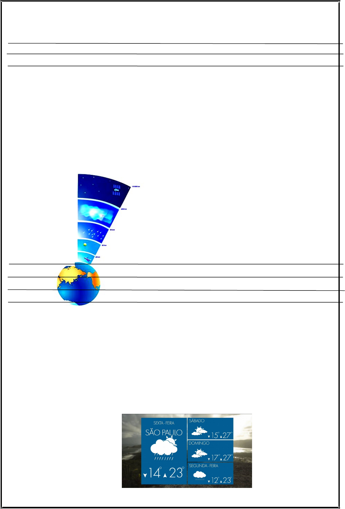 GEOGRAFIA 1) Explique o que é atmosfera. 2)Identifique as camadas da atmosfera na ilustração abaixo. 3)Qual a diferença existente entre clima e tempo? 4)Observe a imagem abaixo. a)O que a imagem está representando? b) Qual a importância do acompanhamento do fator representado na imagem acima para o desenvolvimento das atividades humanas? 5)Relacione as coluna. a) Altitude b) Latitude c) Maritimidade d) Correntes Marítimas e) Massa de ar ( ) São grandes porções de ar que se deslocam na atmosfera. Elas interferem no clima e nas condições de temperatura e umidade de um lugar. ( ) A temperatura também é influenciada pela maior ou menor distância de um lugar em relação aos oceanos. ( ) São grandes massas de água que circundam pelos oceanos e contribuem para a circulação e distribuição de calor no planeta. ( ) é a distância, em graus, de qualquer ponto da superfície terrestre em relação à Linha do Equador, o principal dos paralelos terrestres. ( ) é a distância vertical medida entre um determinado ponto, e o nível médio do mar. Aaltitude e a temperatura do local em que ela é mensurada são grandezas inversamente proporcionais, pois quando a altitude aumenta, a temperatura ambiente diminui aproximadamente 1 grau Celsius. 6) Clima é a sucessão habitual dos estados do tempo meteorológico. A grande variação climática no planeta é resultante da interação dos fatores climáticos, que são os responsáveis pela grande heterogeneidade climática da Terra e estão diretamente relacionados com a geografia de cada porção da superfície terrestre. Em qual das alternativas a seguir há APENAS fatores climáticos, isto é, aqueles que contribuem para determinar as condições climáticas de uma região do globo? a) Correntes marítimas, temperatura do ar, umidade relativa do ar e grau geotérmico. b) Temperatura do ar, pressão, altitude, hidrografia e massas de ar. c) Hidrografia, correntes marítimas, latitude e relevo. d) Altitude, massas de ar, maritimidade e latitude. e) Temperatura do ar, umidade relativa do ar, insolação e grau geotérmico. 7 - Caracterize as massas de ar quanto sua origem e influência nas áreas onde atuam: 8) Nesse tipo de clima a temperatura média anual é superior a 25°C. As chuvas são abundantes e bem distribuídas durante o ano todo. Portanto, é um tipo de clima quente e chuvoso. a) clima equatorial b) clima temperado c) clima polar d) clima semiárido e) clima subtropical 9) Nesse tipo de clima as temperaturas são elevadas, com temperaturas superiores a 26°C. As chuvas são escassas e irregulares, havendo longos períodos de seca. Portanto, é um clima quente e seco. a) clima equatorial b) clima temperado c) clima polar d) clima semiárido e) clima subtropical 10) Tipo de Clima muito quente durante o dia, com média de 30°C, e noites com temperaturas frias,. As chuvas são raras, quase não existem e podem demorar anos para acontecer: a- Desértico: b- Temperado: c- Polar: d- Equatorial 11) Tipo de Clima com frio extremo, com temperaturas sempre abaixo de 0°C, com umidade do ar muito alta em face da constante presença de neve o ano todo: a- Desértico: b- Temperado: c- Polar: d- Equatorial 12) É o único tipo de clima no planeta que apresenta as quatro estações do ano bem definidas. As chuvas, embora não abundantes, são bem distribuídas durante o ano todo. As temperaturas estão sempre abaixo dos 18°C. a) clima equatorial b) clima temperado c) clima polar d) clima semiárido e) clima tropical