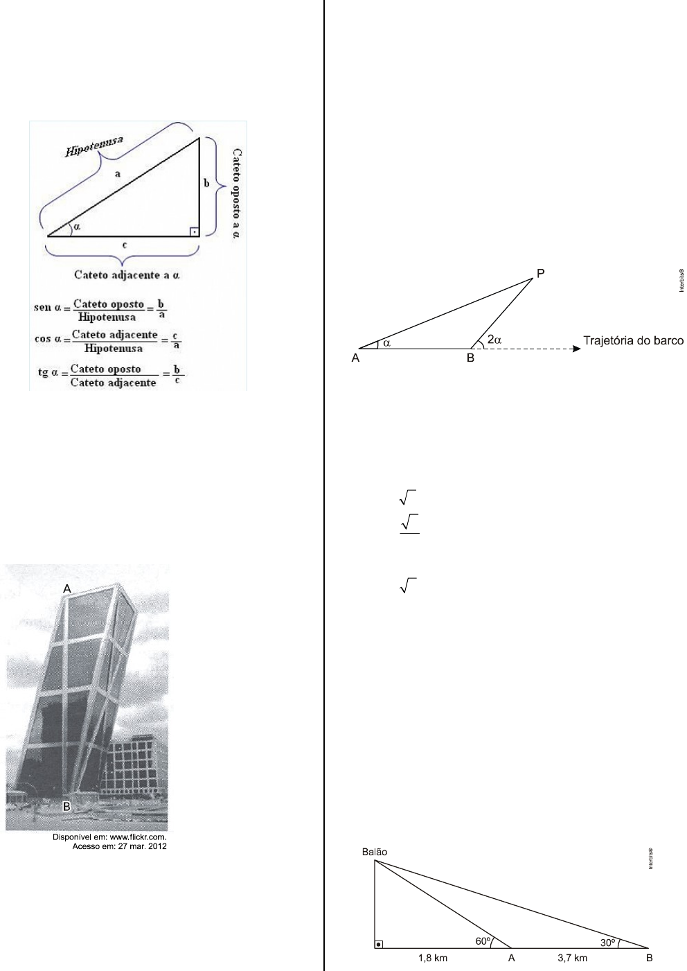 Trigonometria (Razões trigonométricas no triangulo retângulo) 1. (Enem) As torres Puerta de Europa são duas torres inclinadas uma contra a outra, construídas numa avenida de Madri, na Espanha. A inclinação das torres é de 15° com a vertical e elas têm, cada uma, uma altura de 114 m (a altura é indicada na figura como o segmento AB). Estas torres são um bom exemplo de um prisma oblíquo de base quadrada e uma delas pode ser observada na imagem. Utilizando 0,26 como valor aproximado para tangente de 15º e duas casas decimais nas operações, descobre-se que a área da base desse prédio ocupa na avenida um espaço a) menor que 100m2. b) entre 100m2 e 300m2. c) entre 300m2 e 500m2. d) entre 500m2 e 700m2. e) maior que 700m2. 2. (Enem) Para determinar a distância de um barco até a praia, um navegante utilizou o seguinte procedimento: a partir de um ponto A, mediu o ângulo visual a fazendo mira em um ponto fixo P da praia. Mantendo o barco no mesmo sentido, ele seguiu até um ponto B de modo que fosse possível ver o mesmo ponto P da praia, no entanto sob um ângulo visual . A figura ilustra essa situação: Suponha que o navegante tenha medido o ângulo e, ao chegar ao ponto B, verificou que o barco havia percorrido a distância . Com base nesses dados e mantendo a mesma trajetória, a menor distância do barco até o ponto fixo P será a) . b) . c) . d) . e) . 3. (Enem) Um balão atmosférico, lançado em Bauru (343 quilômetros a Noroeste de São Paulo), na noite do último domingo, caiu nesta segunda-feira em Cuiabá Paulista, na região de Presidente Prudente, assustando agricultores da região. O artefato faz parte do programa Projeto Hibiscus, desenvolvido por Brasil, Franca, Argentina, Inglaterra e Itália, para a medição do comportamento da camada de ozônio, e sua descida se deu após o cumprimento do tempo previsto de medição. Disponível em: http://www.correiodobrasil.com.br. Acesso em: 02 maio 2010. Na data do acontecido, duas pessoas avistaram o balão. Uma estava a 1,8 km da posição vertical do balão e o avistou sob um ângulo de 60°; a outra estava a 5,5 km da posição vertical do balão, alinhada com a primeira, e no mesmo sentido, conforme se vê na figura, e o avistou sob um ângulo de 30°. Qual a altura aproximada em que se encontrava o balão? a) 1,8 km b) 1,9 km c) 3,1 km d) 3,7 km e) 5,5 km 4. (Enem) Ao morrer, o pai de João, Pedro e José deixou como herança um terreno retangular de 3 km x 2 km que contém uma área de extração de ouro delimitada por um quarto de círculo de raio 1 km a partir do canto inferior esquerdo da propriedade. Dado o maior valor da área de extração de ouro, os irmãos acordaram em repartir a propriedade de modo que cada um ficasse com a terça parte da área de extração, conforme mostra a figura. Em relação à partilha proposta, constata-se que a porcentagem da área do terreno que coube a João corresponde, aproximadamente, a (considere = 0,58) a) 50%. b) 43%. c) 37%. d) 33%. e) 19%. 5. (Enem) Uma empresa precisa comprar uma tampa para o seu reservatório, que tem a forma de um tronco de cone circular reto, conforme mostrado na figura. Considere que a base do reservatório tenha raio r =m e que sua lateral faça um ângulo de 60° com o solo. Se a altura do reservatório é 12 m, a tampa a ser comprada deverá cobrir uma área de a) 12m2. b) 108m2. c) (12 +)2m2. d) 300m2. e) (24 +)2m2. 6. Uma escada faz um ângulo de 30° com a parede vertical de um prédio, ao tocar o topo distante 6m do solo. Determine o comprimento da escada. a) 4√3m b) √3m c) 2√3m d) 5√2m e) 4√2m 7. (FAAP-SP) Num trabalho pratico de topografia, um estudante de engenharia civil deve determinar a altura de um prédio situado em terreno plano. Instalado equipamento adequado num ponto do terreno, o topo do prédio é visto sob um ângulo de 60°. Afastando-se o equipamento mais 10 metros do edifício, seu topo passa a ser visto sob um ângulo de 45°. Desprezando-se a altura do aparelho, a altura do edifício (em metros) é: a) 10 + √3 b) √3/3 + 10 c) 10√3/√3 -1 d) 3√3/10 +√3 e) 10 + √3/3 8. Um avião decola segundo um ângulo de 30°. Pergunta-se: a) Qual será a distancia após voar 1500m? e após voar voar 3000? Dado: sen 30° = ½. b) Qual será a distancia percorrida pelo avião ao atingir 1000m de altura? c) Se o avião decolar segundo um ângulo de 20°, qual será a altura atingida por ele após percorrer 3000m? Dado: sen 20° = 0,3420. 9- Uma pessoa de 1,64m de altura observa o topo de uma arvore sob um ângulo de 30° com a horizontal. Conhecendo a distância de 6,0m do observador até a arvore, calcular a altura da arvore. Considere tg 30° = 0,58. 10- Uma escada faz um ângulo de 30° com a parede vertical de um prédio, ao tocar o topo distante 6m do solo. Determine o comprimento da escada: a) 4 b) 6 c) 8 d) 2 e) 11- Sendo a media de um ângulo agudo tal que sen = 24/25. Determine o cos ? a) 6/24 b) 7/25 c) 6/20 d) 7/20 e) ½ 12- Sendo a media de um ângulo agudo tal que sen = 24/25. Determine a tg ? a) 24/7 b) 25/7 c) 24/14 d) ½ e) 25/14 13- Num campeonato de asa delta, um participante se encontra a uma altura de 160m e vê o ponto de chegada a um ângulo de 60°, conforme a figura. Calcular o componente horizontal x da distância aproximada em que ele está desse ponto de chegada. a) 260 b) 252 c) 272 d) 282 e) 292 14- As medidas dos ângulos de um triangulo estão em P.A. de razão 20°. Calcule as medidas dos ângulos do triangulo. a) 20°, 40° e 90° b) 40°, 60° e 80° c) 30°, 60° e 90° d) 20°, 50° e 70° e) 20°, 50° e 90° 15- Uma pessoa está a 80m de um prédio e vê o topo do prédio sob um ângulo d 30°. O aparelho que mede o ângulo está a 1,6m do solo. Determine a altura do prédio. a) 81,6 m b) 80 m c) 79, 6 m d) 82 m e) 91,6 m 16- (Unesp 2012) O gol que Pelé não fez Na copa de 1970, na partida entre Brasil e Tchecoslováquia, Pelé pega a bola um pouco antes do meio de campo