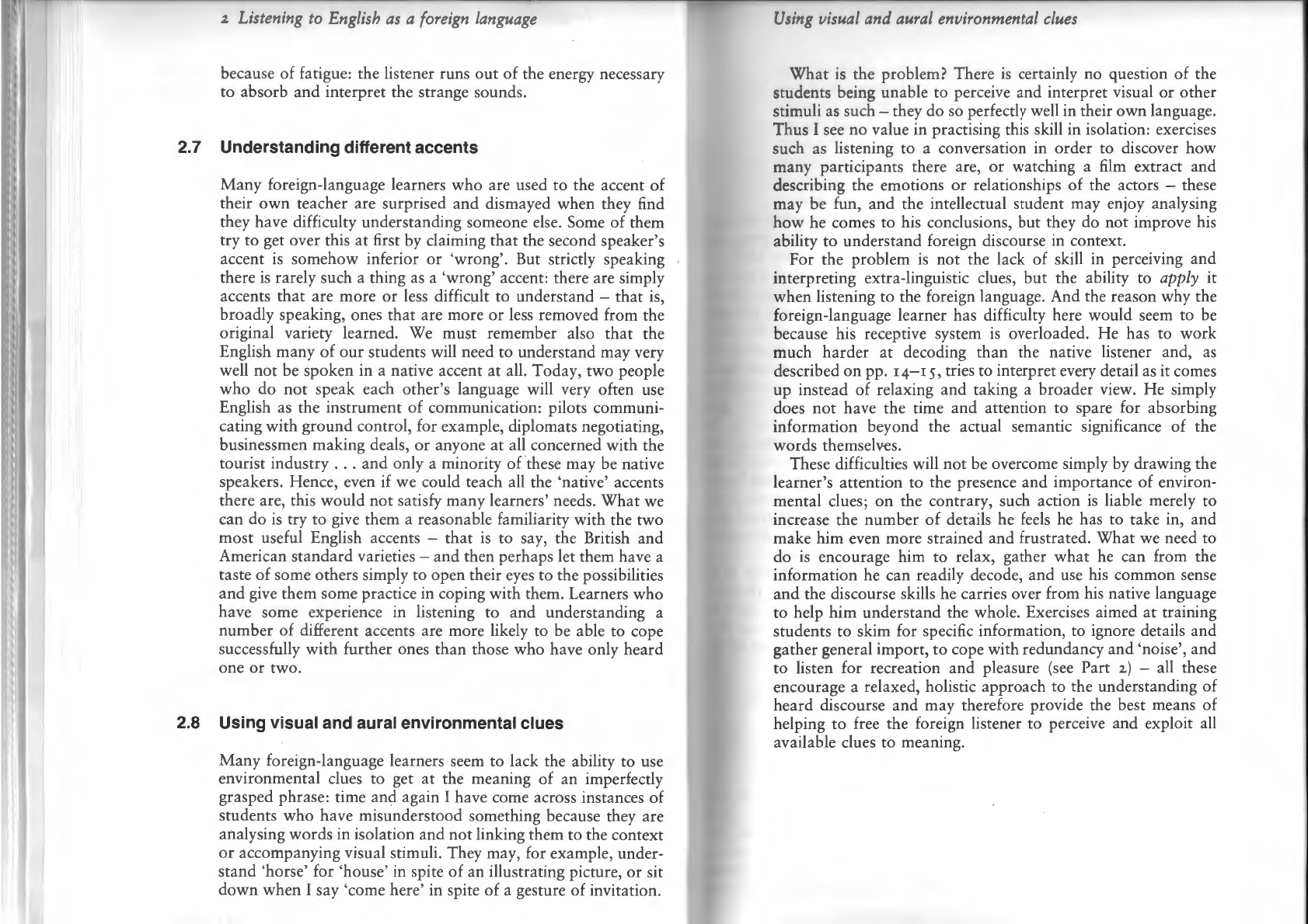 2 ""nglish as a foreign language because of fatigue: the listener runs out of the energy necessary to absorb and interpret the strange sounds. 2. 7 Understanding different accents Many foreign-language learners who are used to the accent of their own teacher are surprised and dismayed when they find they have difficulty understanding someone else. Some of them try to get over this at first by claiming that the second speaker's accent is somehow inferior or 'wrong'. But strictly speaking there is rarely such a thing as a 'wrong' accent: there are simply accents that are more or less difficult to understand - that is, broadly speaking, ones that are more or less removed from the original variety learned. We must remember also that the English many of our students will need to understand may very well not be spoken in a native accent at all. Today, two people who do not speak each other's language will very often use English as the instrument of communication: pilots communi cating with ground control, for example, diplomats negotiating, businessmen making deals, or anyone at all concerned with the tourist industry ... and only a minority of these may be native speakers. Hence, even if we could teach all the 'native' accents there are, this would not satisfy many learners' needs. What we can do is try to give them a reasonable familiarity with the two most useful English accents - that is to say, the British and American standard varieties- and then perhaps let them have a taste of some others simply to open their eyes to the possibilities and give them some practice in coping with them. Learners who have some experience in listening to and understanding a number of different accents are more likely to be able to cope successfully with further ones than those who have only heard one or two. 2.8 Using visual and aural environmental clues Many foreign-language learners seem to lack the ability to use environmental clues to get at the meaning of an imperfectly grasped phrase: time and again I have come across instances of students who have misunderstood something because they are analysing words in isolation and not linking them to the context or accompanying visual stimuli. They may, for example, under stand 'horse' for 'house' in spite of an illustrating picture, or sit down when I say 'come here' in spite of a gesture of invitation. I and aural environmental clues What is the problem? There is certainly no question of the students being unable to perceive and interpret visual or other stimuli as such- they do so perfectly well in their own language. Thus I see no value in practising this skill in isolation: exercises such as listening to a conversation in order to discover how many participants there are, or watching a film extract and describing the emotions or relationships of the actors - these may be fun, and the intellectual student may enjoy analysing how he comes to his conclusions, but they do not improve his ability to understand foreign discourse in context. For the problem is not the lack of skill in perceiving and interpreting extra-linguistic clues, but the ability to apply it when listening to the foreign language. And the reason why the foreign-language learner has difficulty here would seem to be because his receptive system is overloaded. He has to work much harder at decoding than the native listener and, as described on pp. 14-r 5, tries to interpret every detail as it comes up instead of relaxing and taking a broader view. He simply does not have the time and attention to spare for absorbing information beyond the actual semantic significance of the words themselves. These difficulties will not be overcome simply by drawing the learner's attention to the presence and importance of environ mental clues; on the contrary, such action is liable merely to increase the number of details he feels he has to take in, and make him even more strained and frustrated. What we need to do is encourage him to relax, gather what he can from the information he can readily decode, and use his common sense and the discourse skills he carries over from his native language to help him understand the whole. Exercises aimed at training students to skim for specific information, to ignore details and gather general import, to cope with redundancy and 'noise', and to listen for recreation and pleasure (see Part 2) - all these encourage a relaxed, holistic approach to the understanding of heard discourse and may therefore provide the best means of helping to free the foreign listener to perceive and exploit all available clues to meaning.