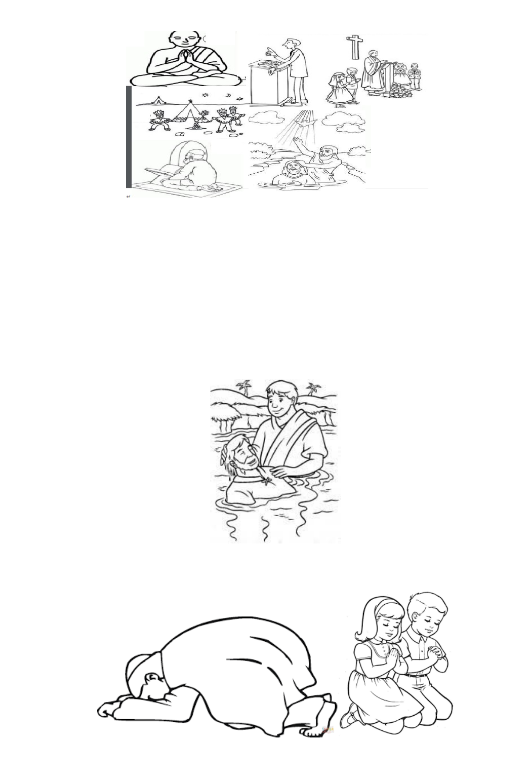 RITOS RELIGIOSOS As religiões surgem a partir do agrupamento de indivíduos que compartilham da mesma fé. É bem provável a existência em sua comunidade de pessoas que praticam outras religiões diferentes da sua, como, por exemplo, o catolicismo, o protestantismo, as religiões de origem indígena e africana, o budismo, o islamismo, dentre outras. A religião sempre esteve presente no cotidiano da humanidade, por isso, é comum observar ao nosso lado pessoas que possuem hábitos e crenças bem diversas e como elas levam tão a sério suas tradições. O Rito Religioso Os ritos religiosos são definidos como costumes que se repetem ao longo do dia ou de um período específico. Eles são símbolos que buscam expressar algum sentimento de fé e de devoção do fiel. A Bíblia Sagrada, livros dos cristãos, conta a história de um homem chamado Daniel que tinha o hábito diário de orar e dar graças a Deus. Essa prática era repetida com frequência, portanto, temos um rito religioso. O rito possui um caráter social ou individual, já que ele varia conforme a sociedade ou a cultura onde a pessoa está inserida. Rito Individual Geralmente, essa prática é realizada por uma única pessoa, onde o tempo e o lugar dedicado para esse hábito tornam-se em elementos sagrados. Fiéis com o costume de rezar ou orar em horários específicos estão praticando um rito individual sagrado. Rito Social Por outro lado, o rito social de caráter religioso é desenvolvido por um grupo de pessoas que compõem a religião. Nesse sentido, é possível diferenciar as crenças, pois o rito social difere em cada cultura religiosa. O batismo, os sacrifícios, a consagração de reis, padres e pastores, os casamentos, os velórios são considerados ritos sociais, já que sua prática depende de outros agentes religiosos. REFLETINDO: Portanto, os ritos religiosos são gestos, palavras, cantos, sinais e repetições presentes em uma cerimônia. O conjunto de todos esses gestos ou ações é definido como ritual, sendo esse o agrupamento de atitudes repetitivas que canalizam as emoções dos fiéis. Assim, cada pessoa tem o direito de exercer qualquer rito sagrado e ser respeitado pelo seu próximo, porque a tarefa de permitir e de tolerar é um ato de cidadania. Texto: Tudo Sala de Aula ATIVIDADE 1. Assinale a alternativa FALSA: a) A religião é a representação de um único pensamento de toda uma comunidade b) O agrupamento de pessoas que compartilham a mesma fé é o princípio da religião. c) A diversidade religiosa é bem presente no Brasil, já que todos têm o direito de escolher. d) O catolicismo, o protestantismo e as religiões africanas revelam a diversidade religiosa. 2. O que é um rito religioso? 3. Você e sua família praticam algum rito religioso? Se sim, qual? Você gosta dessa prática? 4. Escreva 2 ritos religiosos da religião que você segue. 5. Os ritos variam conforme a sociedade ou a cultura onde a pessoa está inserida. O rito pode ter um caráter social ou individual. Diferencie-os. a) Rito individual: b) Rito social: 6. A comemoração de uma criança que nasce, um batizado religioso e a celebração de um aniversário são considerados ritos de caráter a) social. b) individual. 7. Assinale a imagem que representa um rito individual. 8. Para você, qual a função dos ritos religiosos em uma comunidade? 9. Você acha que os ritos, tanto individual como social, devem ser respeitados? Por quê? image1.png image2.jpeg image3.png image4.png image5.gif