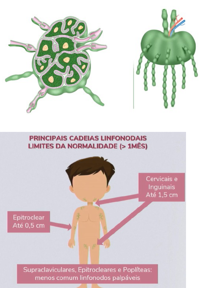 Adenomegalias- Abordagem Thaynara SIlva Objetivos: · Saber examinar linfonodos · Saber diferenciar o linfonodo normal do patológico Definição: Adenomegalia ou linfonodomegalia é quando se tem tamanho, consistÊncia e/ou número de linfonodos acima do normal # Os parâmetros de normalidade varia com idade, localização e tamanho Demais cadeias: tolera-se aumento até 1 cm # ATENÇÃO: se o linfonodo está aumentado mas não ultrapassou o limite de normalidade chama-se “adenopatia” e não “adenoMEGALIA” Classificação: Quanto a cronologia: · Aguda: até 2 semanas · Subaguda: 2-6 semanas · Crônica: > 6 semanas Quanto a apresentação: · Localizada/ regional: drenam para a mesma região anatômica · Generalizada: drenam para mais de uma região anatômica. 2 ou + cadeias não contíguas. · Nesses casos, atentar para hepato e esplenomegalia Causas de Adenomegalia na infância: Infecções: · Bactérias: · S. aureus · S. pyogenes · Anaeróbios (pós abscesso dentário) · Bartonella henselae (Doença da arranhadura do gato) → tratamento: Azitromicina, SMX-TMP · Síndrome oculoglandular de Parinaud · vírus: · Mononucleose infecciosa- EBV (febre, adenomegalia e faringite) · Citomegalovirose- CMV · HIV · Toxoplasmose · Micobactérias: adenomegalia crônica (semanas a meses), dolorosa, fibroelástica violácea · M. Avium · M. Scrofulaceum · M. kansaii · M. fortuitum · Protozoários: · Leishmaniose · Doença de Chagas · Fungos: · Histoplasmose · Paracoccidioides brasiliensis Doenças autoimunes: · Lúpus eritematoso Sistêmico · Artrite Idiopática Juvenil Doenças de acúmulo: · Doença de Gaucher; · Doença de Nieman-Pick Medicações: · Fenitoína · Alopurinol · DRESS Vacinas: · Varíola · BCG: BCGite Neoplasias: · Linfomas e leucemias · Tumor sólidos metastáticos Histiocitoses: · H. células de Langerhans · Sd hemofagocíticas · Histiocitoses malignas Imunodeficiências: · Doença granulomatosa crônica; · Def. adesão de leucócitos Miscelânea: · Sarcoidose; · Doença de kawasaki · Febre + conjuntivite + adenomegalia + rash + mucosite + alterações de extremidades · Doença de Kikuchi-Fujimoto · Doença de Castleman · Doença Rosai-Dorfman · PFAPA (Periodic fever, Aphtous stomatitis, pharyngitis, cervical adenitis) Linfonodos Quais linfonodos geralmente são patológicos e não reacionais? · Retroauriculares; · Supraclaviculares · Epitrocleanos · Poplíteos · Mediastinais; · Abdominais Quando se preocupar? SINAIS DE ALERTA Sintomas sistêmicos: · Febre > 1 semana · Sudorese noturna · Perda ponderal > 10% Acometimento supraclavicular ou generalizado Ausência de sintomas otorrinolaringológicos Linfonodos endurecidos, aderidos Em neonatos: Linfonodos > 1cm Nos demais: Linfonodo > 2 cm sem resposta a ATB Anamnese completa: · Idade · Sexo · Procedência · Localizada (75%) ou generalizada (25%)? · Tempo de evolução · Sintomas associados: · Perda de peso · Febre · sudorese · Alimentação · Animais em casa? gato? · moradia, saneamento · Viagens, exposição a paracoco · Contato com pessoas doentes, TB Exame físico: · Estado geral · Status nutricional · Sistema cardiovascular · Sistema respiratório: tosse, TB? · Sistema gastrointestinal: diarreia crônica? (perda de peso + Adenomegalia + diarreia crônica→ tem que pensar em HIV) · Oroscopia · Otoscopia · Achados cutâneos · Cadeias linfonodais: · https://youtu.be/-PalhyGoOwo?si=Xwqb5TTqO-v_svDD Existem basicamente 4 tipos de caracterização dos linfonodos, quanto a palpação: · Móveis e fibroelásticos (inflamatórios) · Hiperemiados, dolorosos e com áreas de flutuação (infeccioso) · Firmes, confluentes e indolores (Linfomas) · Endurecidos, aderidos, indolores e irregulares (metastáticos) Como descrever um linfonodo palpável? O linfonodo deve ser descrito de acordo com: Localização Cervical anterior occipital: couro cabeludo, piolho pré-auricular: conjuntivite, doença da arranhadura do gato retro-auricular: rubéola Supraclavicular Virchow: linfonodo supraclavicular esquerdo decorrente de neoplasia intra-abdominal Axilar: BCGite, CA de mama Inguinal: ISTs Lado direito ou esquerdo? Tempo de evolução Aguda (dias) subaguda (semas) Crônica (meses) Tamanho Tente estimar o diâmetro linfonodal em centímetros Consistência Mole Firme Elástico Duro (pétreo) Mobilidade Móvel Aderido a planos profundos Dor Doloroso Indolor Presença de fístula cutânea A fistulização cutânea com saída de material caseoso ou purulento é típica da adenite tuberculosa Exemplo: “Linfonodo na região supraclavicular esquerda, de evolução crônica, com diâmetro de cerca de 2 cm, consistência pétrea, imóvel, indolor, sem fistulização). Adenomegalia aguda bilateral Adenite cervical bacteriana: Reação locorregional à BCG: Diagnóstico diferencial de “caroço no pescoço” · Parotidites; · Cisto tireoglosso; · Cisto Branquial; · Tumor de esternocleidomastóideo; · Costela cervical; · Higroma cístico; · Hemangioma; · Linfangioma; · Laringocele; · Cisto dermoide. Manejo: Solicitar exames laboratoriais: · Hemograma Se quadro infeccioso terá leucocitose com neutrofilia Se quadro viral Linfocitose Doenças com comprometimento da medula óssea Pancitopenia · Provas inflamatórias: VHS, PCR · Ácido úrico · Aumenta no caso de neoplasias · DHL · O aumento da DHL representa lise celular · Sd hemolíticas · Função renal: Ur, Cr · Função hepática · Sorologias: · HIV · HCV · HBV · VDRL · Chagas · EBV · CMV · Bartonella henselae · PPD · Punção de medula óssea Solicitar exames de imagem: · raio-X tórax · USG com doppler Saber quando biopsiar Indicações para biópsia do linfonodo: · Tamanho > 2 cm (ou maior que 1,5 x 1,5 cm = 2,25 cm2) · Localização supraclavicular ou escalênica · Persistência > 4-6 semanas · Crescimento progressivo · Aderência a planos profundos, endurecido · Padrão rad