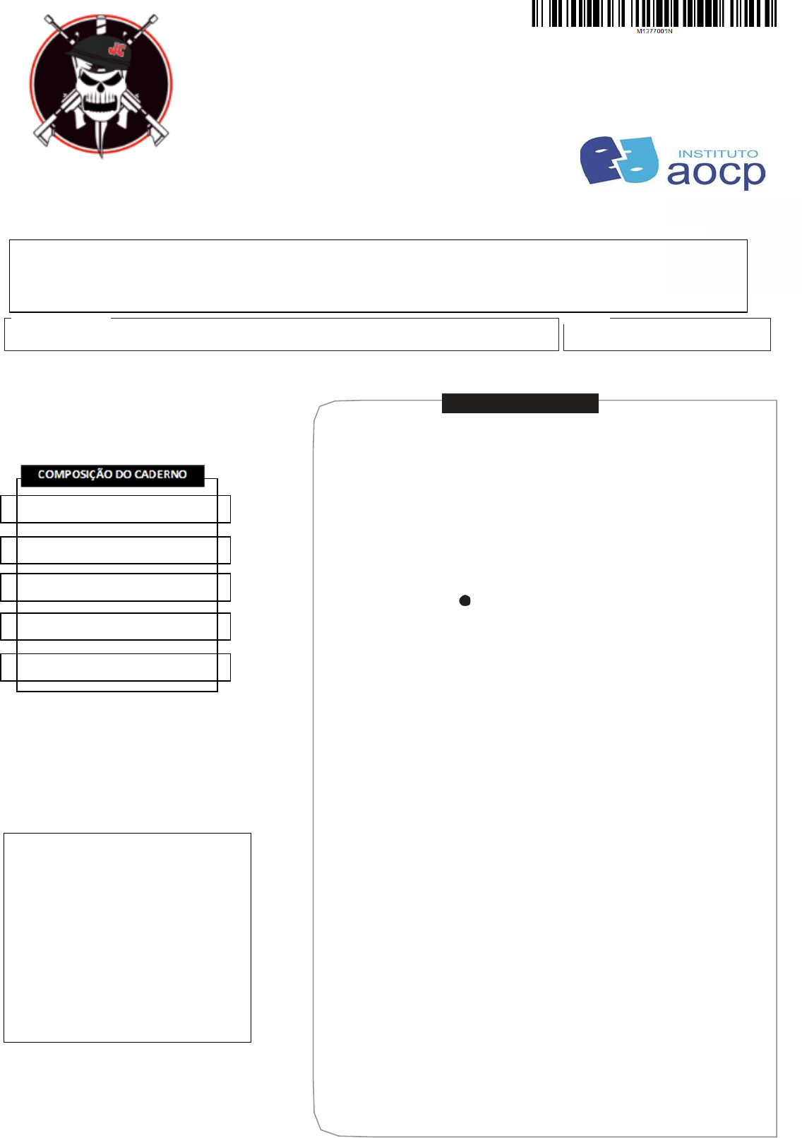 CONCURSO PÚBLICO EDITAL 01/2020 Nome do Candidato 1. Confira seu nome, o número do seu documento e o número de sua inscrição na folha de Respostas. Além disso, não se esqueça de conferir seu Caderno de Questões quanto a falhas de impressão e de numeração. Preencha os campos destinados à assinatura e ao número de inscrição. Qualquer divergência comunique ao fiscal. 2. O único documento válido para avaliação é a Folha de Respostas. Só é permitido o uso de caneta esferográfica transparente de cor azul ou preta para o preenchimento da Folha de Respostas. Leia atentamente cada item da prova objetiva, preenchendo a Folha de Respostas da seguinte maneira: 2.1 Conforme Edital, de acordo com os subitens 10.3 A Prova Objetiva será composta de 80 (oitenta) questões, distribuídas por áreas de conhecimento. Cada questão da Prova Objetiva terá 5 (cinco) alternativas, sendo que cada questão terá apenas 1 (uma) alternativa correta, pontuadas conforme Tabela 10.1. Será atribuída pontuação 0 (zero) às questões com mais de uma opção assinalada, questões sem opção assinalada, com rasuras ou preenchidas a lápis. 3. O prazo de realização da prova é de 5 (cinco) horas, incluindo a marcação da Folha de Respostas. Após 60 (sessenta) minutos do início da prova, o candidato estará liberado para utilizar o sanitário ou deixar definitivamente o local de aplicação. Os 3 (três) últimos candidatos só poderão retirar-se da sala juntos. 4. Ao término de sua prova, comunique ao fiscal, devolvendo-lhe a Folha de Respostas, devidamente preenchida e assinada. O candidato poderá levar consigo o Caderno de Questões, desde que aguarde em sala o término do prazo de realização da prova, estabelecido em edital para todos os candidatos. 5. As provas e os gabaritos preliminares estarão disponíveis no site do preparatório JC www.preparatoriojc.com.br em até 3h, após o término do prazo de realização da prova, estabelecido em edital para todos os candidatos. LÍNGUA PORTUGUESA MATEMÁTICA RACIOCÍNIO LÓGICO GEOGRAFIA Inscrição SEMANA 02 LEMBRE-SE DE MARCAR O NÚMERO CORRESPONDENTE A SUA PROVA NA FOLHA DE RESPOSTAS! SIMULINHO PREPRATÓRIO JC INSTRUÇÕES Licenciado para - Lucas S ilveira D am asceno C ondé - 17436247786 - P rotegido por E duzz.com SIMULINHO – SEMANA 01 PREPARATÓRIO JC pág. 3 1. A palavra que NÃO está separada corretamente é A) bar – rei – ra. B) pes – so – as. C) ci – en – tes. D) ne – u – ro – nal E) fi – ló – so – fos. 2. Assinale a alternativa que apresenta a correta divisão silábica das palavras “surrealismo” e “psicanálise”. Alternativas A) Sur.re.a.lis.mo e psi.ca.ná.li.se. B) Su.rre.a.lis.mo e p.si.ca.ná.li.se. C) Sur.rea.lis.mo e psi.ca.ná.li.se. D) Sur.re.a.lis.mo e p.si.ca.ná.li.se. E) Sur.rea.lis.mo e p.si.ca.ná.li.se. 3. Em relação às palavras “feiura”, “admissível”, “complexidade” e “ideológica” , retiradas do texto, assinale a alternativa que apresenta a correta divisão silábica delas. A) fei.u.ra – ad.mi.ssí.vel – com.plex.i.da.de – i.de.o.ló.gi.ca. B) fe.iu.ra – ad.mis.sí.vel – com.ple.xi.da.de – i.de.o.ló.gi.ca. C) fei.u.ra – ad.mi.ssí.vel – com.ple.xi.da.de – i.deo. ló.gi.ca. D) fei.u.ra – ad.mis.sí.vel – com.ple.xi.da.de – i.de.o.ló.gi.ca. E) fe.iu.ra – ad.mis.sí.vel – com.plex.i.da.de – i.deo. ló.gica. 4. Em relação às palavras “cachorra”, “companheira”, “excessivamente” e “apocalipse”, retiradas do texto, assinale a alternativa que apresenta a correta divisão silábica de todas elas. A) ca.chor.ra; com.pa.nhei.ra; ex.ces.si.va.men.te e a.po.ca.lip.se. B) ca.cho.rra; com.pa.nhei.ra; ex.ces.si.va.men.te e a.po.ca.li.pse. C) ca.chor.ra; com.pan.hei.ra; e.xce.ssi.va.men.te e a.po.ca.lip.se. D) ca.chor.ra; com.pa.nhei.ra; ex.ce.ssi.va.men.te e a.po.ca.li.pse. E) ca.cho.rra; com.pa.nhei.ra; ex.ce.ssi.va.men.te e a.po.ca.li.pse. 5. Assinale a alternativa que apresenta a divisão silábica correta. A) Tran – smi – ssí - veis. B) Pro – fi – ssi – o – nais. C) Sa – u – dá – ve - is D) Ob – es – i – da - de. E) Pos – si – bi – li – da - de. 6. Assinale a alternativa em que a divisão silábica de todas as palavras está correta A) In-sul-to; ex-pre-ssão; ques-ti-o-na-men-to. B) So-cie-da-des; exa-mi-no; o-bra. C) A-per-fe-i-ço-a-men-to; ques-tõ-es; con-tradi-tó- rio. D) A-va-li-a-ção; li-ber-da-de; ad-je-ti-van-do. CONHECIMENTOS BÁSICOS LÍNGUA PORTUGUESA Licenciado para - Lucas S ilveira D am asceno C ondé - 17436247786 - P rotegido por E duzz.com SIMULINHO – SEMANA 01 PREPARATÓRIO JC pág. 4 E) Ar-gui-dor; su-bs-tan-ti-vos; cer-ta-men-te. 7. Assinale a alternativa que apresenta a correta divisão silábica das palavras: amuado, abacateiro, hiperativo e depressão. A) a.mua.do – a.ba.ca.tei.ro – hi.per.a.ti.vo – de.pres.são. B) a.mu.a.do – a.ba.ca.te.i.ro – hi.pe.ra.ti.vo – de.pre.ssão. C) a.mu.a.do – a.ba.ca.tei.ro – hi.pe.ra.ti.vo – de.pre.ssão. D) a.mua.do – a.ba.ca.te.i.ro – hi.per.a.ti.vo – de.pres.são. E) a.mu.a.do – a.ba.ca.tei.ro - hi.pe.ra.ti.vo – de.pres.são. 8. Assinale a alternativa que apresenta divisão silábica correta. A) Sociedade: “so-cie-da-de”. B) Escravos: “es-cra-vo-s”. C) Nosso: “nos-so”. D) Psiquiátricas: “p-si-qui-á-tri-cas”. E) Pois: “po-is”. 9. Assinale a alternativa que apresenta a classificação correta quanto ao número de sílabas das seguintes palavras. A) “Carentes” é uma palavra dissílaba, formada, portanto, por duas sílabas (caren-tes). B) “Incluir” é exemplo de uma palavra dissílaba, formada por duas sílabas (in-cluir). C) “Ansiedade” é uma palavra polissílaba (an-si-e-da- de). D) “Uso” é uma palavra formada por, apenas, uma sílaba e é chamada de monossílaba. E) “Comprar” é uma palavra trissílaba (com-pr-ar). 10. Assinale a alternativa