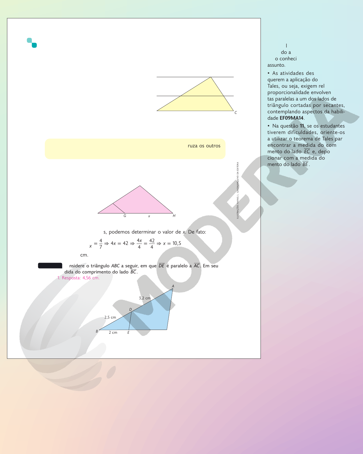 A ED CB s p I J HxF G 7 cm 4 cm 6 cm A D CB 3,2 cm 2,5 cm 2 cm E R ep ro du çã o pr oi bi da . A rt . 1 84 d o C ód ig o Pe na l e L ei 9 .6 10 d e 19 d e fe ve re iro d e 19 98 . 63 Teorema de Tales nos triângulos O teorema de Tales pode ser aplicado em situações que envolvam triângulos. Para com- preender melhor sua aplicação, considere o triângulo ABC e as retas que contêm seus lados. Ao traçarmos a reta: • s , paralela ao lado ‾ BC e que cruza os lados ‾ AB e ‾ AC , determinamos os pontos D e E ; • p paralela a s , passando pelo vértice A , temos um feixe de retas paralelas, que cruza 2 retas transversais. Com base no teorema de Tales, temos: AD ___ DB = AE ___ EC Toda reta paralela a um dos lados de um triângulo e que cruza os outros dois lados os divide em segmentos de reta proporcionais. No triângulo a seguir, _ JG é paralelo a _ IH . Utilizando o teorema de Tales, podemos determinar o valor de x. De fato: 6 __ x = 4 __ 7 ⇒ 4x = 42 ⇒ 4x ___ 4 = 42 ___ 4 ⇒ x = 10,5 Portanto, x = 10,5 cm . Considere o triângulo ABC a seguir, em que ‾ DE é paralelo a ‾ AC . Em seu caderno, calcule a medida do comprimento do lado ‾ BC . Questão 11. RA FA EL L . G AI O N /A RQ U IV O D A ED IT O RA IL U ST RA ÇÕ ES : R AF AE L L. G AI O N /A RQ U IV O D A ED IT O RA Questão 11. Resposta: 4,56 cm . 63 • Antes de apresentar o conteúdo desta página, verifique o conheci- mento dos estudantes relacionado a triângulos. Permita que eles deem suas explicações e conversem entre si, tendo a oportunidade de resga- tar o conhecimento prévio sobre o assunto. • As atividades deste tópico re- querem a aplicação do teorema de Tales, ou seja, exigem relações de proporcionalidade envolvendo re- tas paralelas a um dos lados de um triângulo cortadas por secantes, contemplando aspectos da habili- dade EF09MA14. • Na questão 11, se os estudantes tiverem dificuldades, oriente-os a utilizar o teorema de Tales para encontrar a medida do compri- mento do lado ‾ EC e, depois, adi- cionar com a medida do compri- mento do lado ‾ BE . A D CB 13,5 m 11 m 25 m 9 m E A D C B E 6 cm 8 cm 9 cm7,5 cm C D A B E 7 cm 14 cm 6 cm 5 cm A Q C BP x 15 m 12,5 m O M N QP 15 m 3,4 m 4,2 m S 5,8 m R ep ro du çã o pr oi bi da . A rt . 1 84 d o C ód ig o Pe na l e L ei 9 .6 10 d e 19 d e fe ve re iro d e 19 98 . 64 Atividades Faça as atividades no caderno. 52. Em cada item, determine a medida do perímetro do triângulo, sabendo que ‾ DE é paralelo a ‾ BC . A. B. C. Determine o valor de x no triângulo ABC , sabendo que: • ‾ PQ / / ‾ BC ; • o perímetro do triângulo mede 75 m ; • P é o ponto médio de ‾ AB . 54. O triângulo MNO é isósceles. O triângulo isósceles apresenta pelo menos 2 lados com medidas de comprimento iguais. Atenção! Considerando que ‾ MN / / ‾ PQ , OM = 25 m e ON = 25 m , determine OP e PM . 55. Em determinada hora do dia, as som- bras de um poste e de uma estátua projetadas no solo atingem o ponto S, como representado no esquema a seguir. Determine a medida da distância apro- ximada entre o poste e a estátua. H EL O ÍS A PI N TA RE LL I/A RQ U IV O D A ED IT O RA RA FA EL L . G AI O N /A RQ U IV O D A ED IT O RA 53. Considere o triângulo a seguir. IL U ST RA ÇÕ ES : R AF AE L L. G AI O N /A RQ U IV O D A ED IT O RA RA FA EL L . G AI O N /A RQ U IV O D A ED IT O RA 52. Respostas: A. 75 m ; B. 35,5 cm ; C. 40,4 cm . 53. Resposta: 20 m . 55. Resposta: 4,7 m . 54. Resposta: OP = 10 m ; PM = 15 m . 64 • Para a resolução da atividade 52, adote uma perspectiva exploratória e questione os estudantes sobre o processo para calcular a medida do perímetro de um triângulo, com quais segmentos de reta devem ob- ter a medida e como devem escre- ver as razões para utilizar o teore- ma de Tales. Caso eles confundam os segmentos de reta correspon- dentes, sane as dúvidas na lousa. • Na atividade 53, caso os estudan- tes não se lembrem, explique que o ponto médio divide o segmento de reta ao meio, de modo que per- cebam que AP = 12,5 m e possam aplicar o teorema de Tales para ob- ter a medida ‾ QC . • Na atividade 54, reforce com eles que um triângulo isósceles tem pelo menos dois lados com medi- das de comprimento iguais. Para tirar melhor proveito da atividade, retome as classificações dos tri- ângulos com relação à medida de seus lados. • Na atividade 55, os estudantes precisam apenas aplicar o teorema de Tales para obter a medida da distância aproximada entre o poste e a estátua. Oriente-os a considerar a estátua e o poste como segmen- tos de retas paralelas. 18 m 9 m 3 m 2x C D EA B 5x + 1 m 9 m 7,2 m 8,8 m B A C x M N a b c 75 m 152 m 65 m 50 m A D B C E 3 1,8 4 x R ep ro du çã o pr oi bi da . A rt . 1 84 d o C ód ig o Pe na l e L ei 9 .6 10 d e 19 d e fe ve re iro d e 19 98 . 65 H EL O ÍS A PI N TA RE LL I/A RQ U IV O D A ED IT O RA 56. Na figura a seguir, ‾ DE e ‾ CB são para- lelos. b ) De quantos metros de arame Dirceu vai precisar para que a parte da cerca que ele deseja trocar seja feita com 4 arames paralelos, como mostra a figura? 58. Determine os valores de a , b e c . a ) Determine a medida do comprimen- to de ‾ AB em metros. b ) Quanto mede o perímetro do triân- gulo ABC em metros? 57. Dirceu quer trocar o arame de parte da cerca de seu pasto, que está repre- sentado na figura a seguir. A parte da cerca que ele deseja trocar está indica- da pela medida x. Sabendo que a área do triângulo ADE mede 2,16 m 2 e que ‾ ED / / ‾ BC , determi- ne o valor de x. 60. Elabore um problema envolvendo triân- gulos e o teorema de Tales e, em segui- da, peça a um colega que o resolva. Por fim, verifique se a resposta obtida por ele está correta. 59. Na imagem, as medidas são dadas em metros. JA CQ U EL IN E AM AD IO /A RQ U IV O D A ED IT O RA a ) Sabendo que o pasto é dividido por uma cerca paralela à que está próxi- ma da estrada, calcule no caderno o valor de x. RA FA EL L . G AI O N 