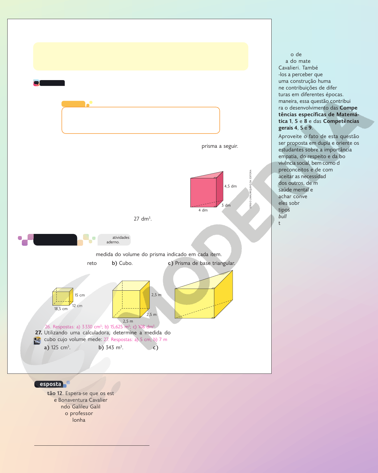 15 cm 18,5 cm 12 cm 2,5 m 2,5 m 2,5 m 4,5 dm 6 dm 8 dm 4,5 dm 4 dm 3 dm 253 Princípio de Cavalieri: Sejam F 1 e F 2 figuras geométricas espaciais. Se qualquer plano horizontal secciona F 1 e F 2 segundo figuras planas com mesma medida de área, então a medida do volume de F 1 é igual à medida de volume de F 2 . Junte-se a um colega e realizem uma pesquisa sobre a vida de Bonaventura Cavalieri. Depois, compartilhem com a turma os resultados que vocês obtiveram. Questão 12. Agora, acompanhe como podemos calcular a medida do volume do prisma a seguir. Inicialmente, calculamos a medida da área da base ( A b ) do prisma, que é um triângulo retângulo. A b = 4 ⋅ 3 _ 2 = 6 Em seguida, calculamos a medida do volume. V = A b ⋅ h = 6 ⋅ 4,5 = 27 Portanto, o volume desse prisma mede 27 d m 3 . 26. Calcule no caderno a medida do volume do prisma indicado em cada item. Atividades Faça as atividades no caderno. a ) Paralelepípedo reto retângulo. b ) Cubo. c ) Prisma de base triangular. 27. Utilizando uma calculadora, determine a medida do comprimento da aresta de um cubo cujo volume mede: a ) 125 cm 3 . b ) 343 m 3 . c ) 729 d m 3 . d ) 42,875 cm 3 . SE RG IO L IM A/ AR Q U IV O D A ED IT O RA IL U ST RA ÇÕ ES : S ER G IO L IM A/ AR Q U IV O D A ED IT O RA A pesquisa proposta na questão 12 pode ser feita em livros, revistas e sites. Mas cuidado! Devemos nos certificar de que as informações sejam pesquisadas em fontes atuais e confiáveis. Para encerrar, uma dica: confira as informações obtidas comparandoas com outras fontes. Atenção! 26. Respostas: a) 3330 cm 3 ; b) 15,625 m 3 ; c) 108 d m 3 . 27. Respostas: a) 5 cm ; b) 7 m ; c) 9 dm ; d) 3,5 cm . Questão 12. Resposta nas orientações ao professor. 253 • A questão 12 tem por objetivo levar os estudantes a trabalhar co- laborativamente, compartilhando informações e fazendo uso de fer- ramentas de pesquisa, com o pro- pósito de evidenciar aspectos da vida do matemático Bonaventura Cavalieri. Também pretende levá- -los a perceber que a Matemática é uma construção humana, que reú- ne contribuições de diferentes cul- turas em diferentes épocas. Dessa maneira, essa questão contribui pa- ra o desenvolvimento das Compe- tências específicas de Matemá- tica 1, 5 e 8 e das Competências gerais 4, 5 e 9. Aproveite o fato de esta questão ser proposta em dupla e oriente os estudantes sobre a importância da empatia, do respeito e da boa con- vivência social, bem como de não ter preconceitos e de compreender e aceitar as necessidades e limitações dos outros, de modo a promover a saúde mental e a cultura de paz. Se achar conveniente, converse com eles sobre o combate aos diversos tipos de violência, especialmente o bullying. Obtenha informações no tópico Cultura de paz e combate ao bullying nas orientações gerais deste manual. • Por envolver medidas decimais, verifique se os estudantes têm di- ficuldade em efetuar as multiplica- ções da atividade 26. Se achar ne- cessário, escreva alguns números decimais na lousa e mostre como efetuar multiplicações entre eles. No item c, uma possível solução é compor um paralelepípedo, cal- cular a medida do seu volume e dividi-la por 2. Explore essa solu- ção na lousa. • Na atividade 27, verifique se os estudantes sabem como calcular raí- zes cúbicas. As calculadoras comuns não têm a função raiz cúbica. Assim, sugira que utilizem calculadora cien- tífica, que inclusive é presente na maioria dos smartphones. Se neces- sário, escreva na lousa 3 √ _ 125 = 125 1 _ 3 e mostre como calcular a potência com expoente racional na calcula- dora científica. Outra possibilidade é fatorar a medida dos volumes dados e escrevê-la como uma potência de expoente 3. Questão 12. Espera-se que os estudantes descu- bram que Bonaventura Cavalieri nasceu em Milão na Itália, tendo Galileu Galilei como seu mestre, e atuou como professor de Matemática na Uni- versidade de Bolonha de 1629 até sua morte. Es- pera-se ainda que, em suas pesquisas, concluam que Cavalieri deixou uma obra vasta abrangendo Matemática, Óptica e Astronomia. Resposta 6 cm 6 cm 6 cm 3 cm 3 cm 3 cm 18 cm 45 cm 24 cm 1 m 1 m 1 m 2 m 2 m 4 m 4 m 30 cm 122 cm 30 cm 50 cm 40 cm 100 cm 60 cm 45 cm 254 R ep ro du çã o pr oi bi da . A rt . 1 84 d o C ód ig o Pe na l e L ei 9 .6 10 d e 19 d e fe ve re iro d e 19 98 . 28. O empilhamento a seguir é formado por cubos cujo comprimento da aresta mede 1 dm . Sabendo que não há cubos escondidos atrás do empilhamento, responda às questões. a ) Qual é a medida do volume desse empilhamento? b ) Quantos decímetros cúbicos faltam para que esse empilhamento tenha a mesma medida de volume de um paralelepípedo cujas dimensões me dem 6 dm , 6 dm e 4 dm ? 29. Na figura está representado um objeto feito de madeira que pode ser dividido em 6 cubos em que o volume de cada um deles mede 27 cm 3 . Qual é a quantidade máxima de objetos iguais a esse que podem ser colocados dentro de uma caixa como a represen tada a seguir? Dois desses objeto podem se encaixar formando um paralelepípedo reto retângulo. Atenção! Este objeto pode ser decomposto em paralelepípedos retos retângulos e cubos. Atenção! 30. Efetue os cálculos no caderno e deter mine a medida do volume do objeto a seguir. 31. De acordo com as medidas indicadas nas figuras geométricas espaciais a se guir, determine a medida do volume de cada uma delas. A. B. IL U ST RA ÇÕ ES : S ER G IO L IM A/ AR Q U IV O D A ED IT O RA SE RG IO L IM A/ AR Q U IV O D A ED IT O RA SE RG IO L IM A/ AR Q U IV O D A ED IT O RA IL U ST RA ÇÕ ES : J AC Q U EL IN E AM AD IO /A RQ U IV O D A ED IT O RA 28. Respostas: a) 85 cubos ou 85 d m 3 ; b) 59 d m 3 . 29. Resposta: 120 objetos. 30. Resposta: 31 m 3 . 31. Respostas: A. 77400 cm 3 ; B. 144000 cm 3 . 254 • Na atividade 28, se necessário, reforce aos estudantes que não há cubos escondidos atrás do empi- lhamento. No item b, se necessá- rio, peç