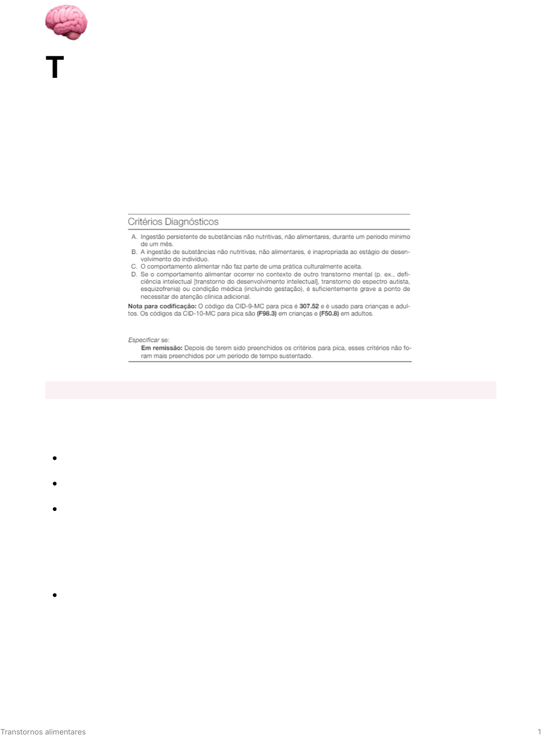 Transtornos alimentares 1 🧠 Transtornos alimentares Perturbações persistentes na alimentação ou no comportamento relacionado à alimentação que resulta no consumo ou na absorção alterada de alimentos Pica Características diagnósticas Característica essencial: ingestão de uma ou mais substâncias não nutritivas, não alimentares, de forma persistente por 1 mês Grave o suficiente para merecer atenção clínica Não alimentar: não se aplica a produtos com conteúdo nutritivo mínimo Inadequada para o estágio de desenvolvimento e não parte de uma prática cultural Substâncias típicas: papel, sabão, tecido, cabelo, fios, terra, giz, talco, tinta, cola, metal, pedras, carvão vegetal ou mineral, detergente ou gelo Geralmente não há aversão por alimentos em geral Transtornos alimentares 2 Idade mínima para diagnóstico: 2 anos, de modo a excluir a exploração de objetos com a boca → comumente ingeridos por crianças em desenvolvimento Características associadas que apoiam o diagnóstico Nenhuma outra anormalidade biológica é descrita além da deficiência de algumas vitaminas e minerais, como zinco e ferro. Em alguns casos a pica chega à atenção clínica somente acompanhando outras complicações médicas: problemas intestinais mecânicos, obstrução intestinal (como por bezoares), perfuração intestinal, infecções (ingestão de fezes ou sujeiras), intoxicações (como por tinta à base de chumbo) Prevalência, desenvolvimento e curso A prevalência aumenta conforme a gravidade de deficiência intelectual Ocorre em ambos os sexos Manifestação inicial: infância, adolescência ou na idade adulta Mais comum na infância Crianças: pode ocorrer em crianças com desenvolvimento normal em outras áreas Adultos: mais provável se houver deficiência intelectual ou outros transtornos mentais A ingestão de substâncias não nutritivas, não alimentares pode ocorrer na gestação quando há fissura específica (por giz ou gelo, por exemplo) O transtorno pode resultar em emergência médica e é potencialmente fatal Fatores de risco e prognóstico Transtornos alimentares 3 Ambientais: negligência, falta de supervisão e atraso do desenvolvimento podem aumentar o risco de desenvolver pica Valor espiritual: em algumas populações ingerir terra ou outras substâncias possui valor espiritual, medicinal ou outro valor social Pode ser ainda uma prática culturalmente aceita ou socialmente normal → não caracteriza diagnóstico de pica RX abdominal simples, US e outros métodos de imagem podem auxiliar o diagnóstico Exames de sangue podem ser solicitados para avaliar níveis de intoxicação ou a natureza da infecção Consequências funcionais Raramente a pica é a única causa de prejuízo funcional social, mas pode comprometer significativamente o funcionamento físico Diagnóstico diferencial Transtorno de ruminação Transtornos alimentares 4 Características diagnósticas Característica essencial: regurgitação repetida de alimentos depois de ingerido durante um período mínimo de 1 mês O alimento previamente deglutido (que pode estar parcialmente digerido) é trazido de volta à boca sem náusea aparente, ânsia de vômito ou repugnância O alimento pode ser remastigado e então ejetado da boca ou novamente deglutido Os indivíduos podem descrever o comportamento como habitual ou fora de seu controle A regurgitação deve ser frequente, ocorrendo várias vezes por semana Em geral, todos os dias Verificar se: o distúrbio não é mais bem explicado por uma condição gastrointestinal e não corre exclusivamente durante o curso de outros transtornos alimentares O diagnóstico pode ser feito durante toda a vida e principalmente em indivíduos com deficiência intelectual Lactentes: exibem posição características de tensionar e arquear as costas com a cabeça fletida para trás, com movimentos de sucção com a língua com impressão de obterem satisfação com a atividade → podem ficar irritados e famintos entre os episódios Perda ponderal e insucesso em ganhar peso Desnutrição Transtornos alimentares 5 Adolescentes e adultos talvez tentem disfarçar o comportamento de regurgitação cobrindo a boca com a mão ou tossindo Desenvolvimento e curso Manifestações iniciais: em lactentes, na infância, na adolescência ou na idade adulta Geralmente entre 312 meses Nos lactentes, o transtorno cede com frequência de forma espontânea A ruminação parece ter uma função calmante e estimulante semelhante à de outros comportamentos motores repetitivod, como balançar a cabeça ritmicamente Fatores de risco e prognóstico Ambientais: problemas psicossociais → falta de estimulação, negligência, situações de vida estressantes e problemas na relação pais-filhos Consequências funcionais e comorbidades Desnutrição secundária à regurgitação repetida → atraso no desenvolvimento e efeito negativo no processo de desenvolvimento e aprendizagem Alguns indivíduos restrigem a ingestão de alimentos por ser socialmente indesejável a regurgitação Perda ponderal e baixo peso Transtornos alimentares 6 Pode ocorrer no contexto de uma condição médica ou outro transtorno mental concomitante Diagnósticos diferenciais Transtorno de compulsão alimentar Características diagnósticas Característica essencial: episódios recorrentes de compulsão alimentar que devem ocorrer pelo menos 1x por semana durante 3 meses, em média Episódio de compulsão alimentar: ingestão, em um período determinado, de uma quantidade de alimento definitivamente maior do que a mioria das pessoas consumiria em um mesmo período sob circunstâncias semelhantes Período de tempo determinado: geralmente inferior a 2h Não é necessário que o episódio limite-se a um único contexto Transtornos alimentares 7 Lanches contínuos ao longo do dia não são considerados compulsão alimentar O consumo excessivo de alimento deve ser acompanhado por uma sensação de falta de contr