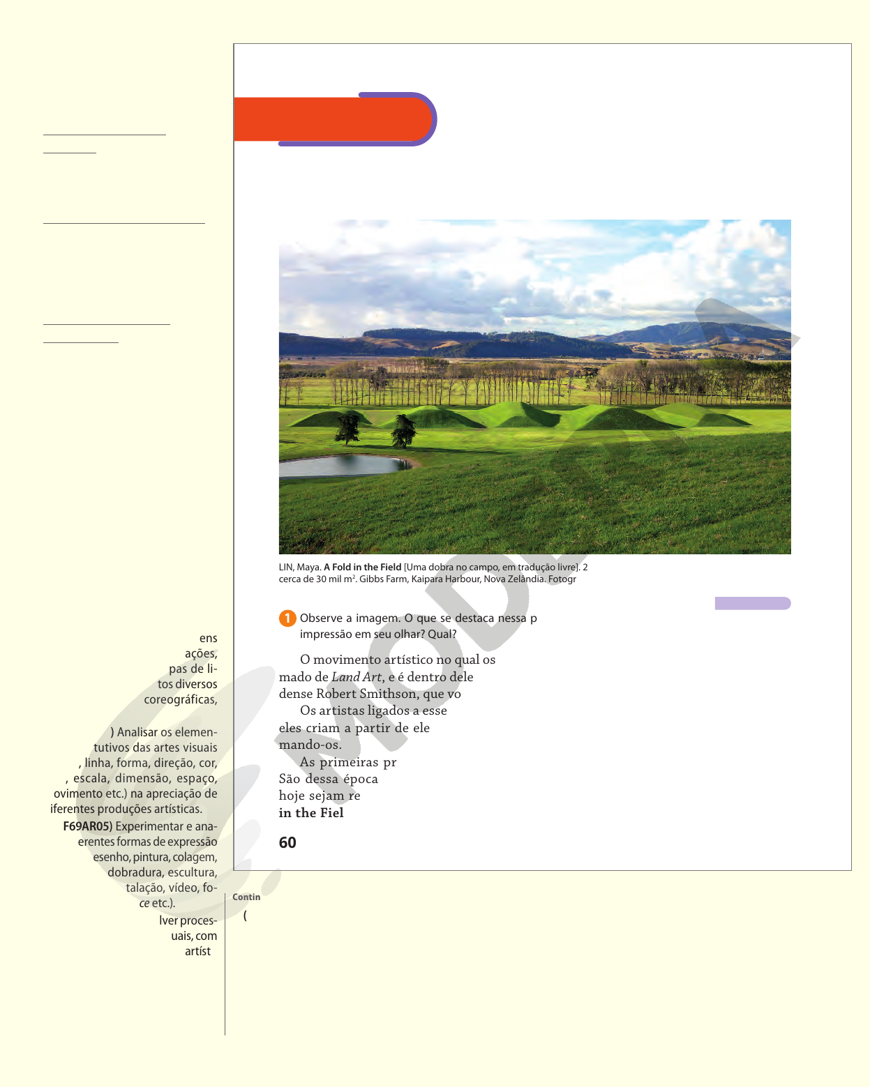 60 60 R ep ro du çã o pr oi bi da . A rt. 18 4 do C ód ig o Pe na l e L ei 9 .6 10 d e 19 d e fe ve re iro d e 19 98 . SOBREVOO A natureza como arte 1 Observe a imagem. O que se destaca nessa paisagem? O relevo nesse campo provoca alguma impressão em seu olhar? Qual? O movimento artístico no qual os artistas trabalham diretamente na natureza é cha- mado de Land Art, e é dentro dele que se integra a obra Spiral Jetty, do artista estaduni- dense Robert Smithson, que você conheceu na abertura deste capítulo. Os artistas ligados a esse movimento não limitam a natureza a um simples cenário: eles criam a partir de elementos naturais e de paisagens, modificando-os e transfor- mando-os. As primeiras produções consideradas Land Art são do final da década de 1960. São dessa época alguns dos trabalhos mais conhecidos do movimento, embora até hoje sejam realizados projetos que dialogam com ele, como evidencia a obra A Fold in the Field, da artista estadunidense Maya Lin (1959-). LIN, Maya. A Fold in the Field [Uma dobra no campo, em tradução livre]. 2013. 105 mil m3 de preenchimento de terra em cerca de 30 mil m2. Gibbs Farm, Kaipara Harbour, Nova Zelândia. Fotografia de Dan Chappe. D AN C H AP PE /P AC E G AL LE RY Faça no caderno. Esta seção apresenta referências de produções artísticas que se in- tegram à natureza ou fazem uso de recursos naturais. Unidades temáticas da BNCC Artes visuais; Música; Artes inte- gradas. Objetos de conhecimento Contextos e práticas; Elemen- tos da linguagem; Materialidades; Processos de criação; Patrimônio cultural. Habilidades em foco nesta seção (EF69AR01) Pesquisar, apreciar e analisar formas distintas das artes visuais tradicionais e contemporâ- neas, em obras de artistas brasi- leiros e estrangeiros de diferentes épocas e em diferentes matrizes estéticas e culturais, de modo a am- pliar a experiência com diferentes contextos e práticas artístico-vi- suais e cultivar a percepção, o ima- ginário, a capacidade de simbolizar e o repertório imagético. (EF69AR02) Pesquisar e ana- lisar diferentes estilos visuais, contextualizando-os no tempo e no espaço. (EF69AR03) Analisar situações nas quais as linguagens das artes visuais se integram às linguagens audiovisuais (cinema, animações, vídeos etc.), gráficas (capas de li- vros, ilustrações de textos diversos etc.), cenográficas, coreográficas, musicais etc. (EF69AR04) Analisar os elemen- tos constitutivos das artes visuais (ponto, linha, forma, direção, cor, tom, escala, dimensão, espaço, movimento etc.) na apreciação de diferentes produções artísticas. (EF69AR05) Experimentar e ana- lisar diferentes formas de expressão artística (desenho, pintura, colagem, quadrinhos, dobradura, escultura, modelagem, instalação, vídeo, fo- tografia, performance etc.). (EF69AR06) Desenvolver proces- sos de criação em artes visuais, com base em temas ou interesses artísti- cos, de modo individual, coletivo e colaborativo, fazendo uso de mate- riais, instrumentos e recursos con- vencionais, alternativos e digitais. (EF69AR18) Reconhecer e apreciar o papel de músicos e grupos de música brasileiros e estrangeiros que contribuíram para o desenvolvimento de formas e gêneros musicais. (EF69AR20) Explorar e analisar elementos constitutivos da música (altura, intensidade, timbre, melodia, ritmo etc.), por meio de recursos tecnológicos (games e plataformas digitais), jogos, canções e práticas diversas de composição/criação, execução e apreciação musicais. (EF69AR21) Explorar e analisar fontes e materiais sonoros em práticas de composição/criação, execução e apreciação musical, reconhecendo timbres e características de instrumentos musicais diversos. Continua Continuação Continua 61 61 R ep ro du çã o pr oi bi da . A rt. 18 4 do C ód ig o Pe na l e L ei 9 .6 10 d e 19 d e fe ve re iro d e 19 98 . Essa obra está no Gibbs Farm, um grande museu de escul- turas a céu aberto na Nova Zelândia, onde existem outras pro- duções de Land Art. Em um campo de aproximadamente 30 mil metros quadrados, Maya Lin manipulou o relevo natural, criando elevações que chegam a 11,5 metros de altura. Maya Lin é arquiteta de formação e pesquisa as relações entre arquitetura, ambiente e ciência em seus projetos. Arte e arquite- tura caminham juntas em sua vida profissional, mas seu interes- se está no meio ambiente, e seu objetivo é que as pessoas prestem atenção ao seu entorno. Uma das características da Land Art é a sua realização diretamen- te no espaço natural e, justamente por isso, as obras nem sempre são acessíveis presencialmente ao grande público, dependendo de regis- tros em vídeo ou fotografia para serem divulgadas. Os registros são importantes porque permitem a visualização integral das obras, cujas dimensões são grandiosas. Para realizar a manipulação da natureza e da paisagem em obras de grandes dimensões se faz necessário o uso de equipamentos e de muita estrutura material. Por causa disso, elas partem inicial- mente de projetos – e algumas vezes nem saem do papel. A criação do artista começa no planejamento das intervenções que pretende fazer no ambiente, um processo semelhante ao dos arquitetos, que conhecemos no capítulo 2. Para experimentar Projeto de Land Art O trabalho de criação dos artistas de Land Art se inicia muito antes de ir a campo. Pensando em uma situação hipotética, qual projeto de Land Art você faria? Você só vai precisar de lápis e papel para esboçar a ideia. Utilize seu diário de bordo. 1 Escolha um local onde seria produzida a sua obra (mar, rio, lago, campo, floresta, céu, montanha, planície, rocha etc.). 2 Qual transformação você faria na paisagem escolhida? 3 Com quais recursos materiais e humanos você contaria? 4 Como você imagina a interação do ser humano ou de animais com essa obra? 5 Como você faria o registro dela? 6 Anote todas as ideias e, se possível, esboce