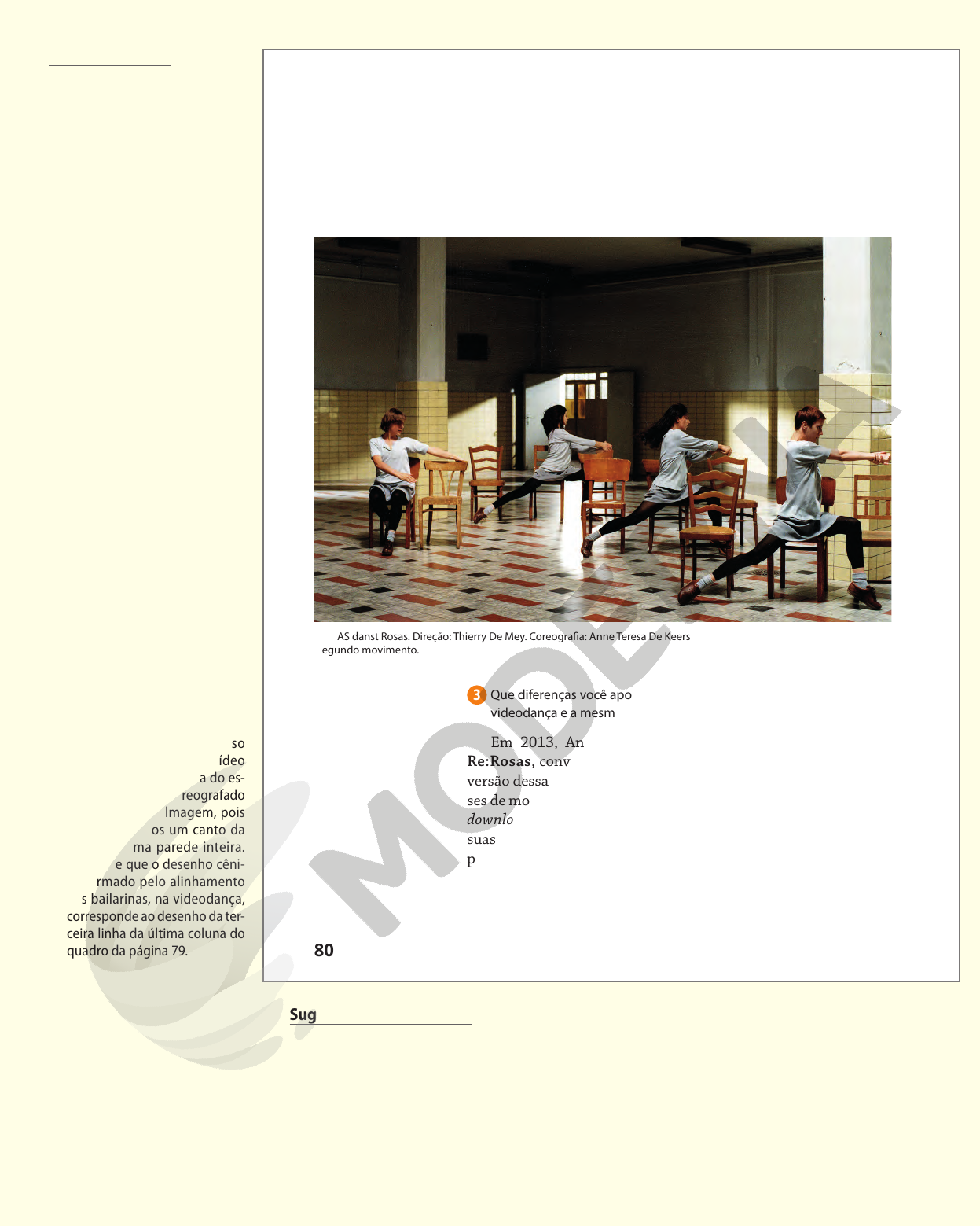 80 80 R ep ro du çã o pr oi bi da . A rt. 18 4 do C ód ig o Pe na l e L ei 9 .6 10 d e 19 d e fe ve re iro d e 19 98 . Em 1997, Thierry De Mey propôs fazer uma videodança de Rosas danst Rosas no pré- dio de uma escola. Gravar a coreografia em vídeo gerou a necessidade de escolher os movi- mentos das câmeras e de repensar como cada sequência de movimento seria gravada, para depois ser organizada e apreciada em vídeo. Para isso, cada parte da coreografia foi reali- zada em um ambiente diferente do prédio, de modo que a luz, em conjunto com as danças executadas, remetesse à ideia de passagem do dia, respeitando o roteiro original. ROSAS danst Rosas. Direção: Thierry De Mey. Coreografia: Anne Teresa De Keersmaeker. Bélgica, 1997. Fotograma do segundo movimento. 3 Que diferenças você apontaria entre uma coreografia criada para uma videodança e a mesma coreografia dançada ao vivo? Em 2013, Anne Teresa De Keersmaeker lançou o projeto Re:Rosas, convidando todos os interessados a montar a própria versão dessa dança. No site do projeto, a coreógrafa ensina as fra- ses de movimento e sua organização e disponibiliza a música para download, além de solicitar aos internautas que publiquem as suas versões da coreografia em uma plataforma virtual de com- partilhamento de vídeos. Com isso, a coreógrafa demonstra estar interessada em como as pessoas assimilam as ideias presentes na coreografia e as mo- dificam segundo a sua criatividade. C O M PA N H IA R O SA S Sobre a atividade 3. Na videodança é preciso coreo- grafar os movimentos das câ- meras juntamente com o dire- tor de fotografia. Depois, com o editor de vídeo, será feita uma nova composição com as ima- gens captadas. Ao vivo, quem está na plateia escolhe para qual área do palco quer olhar e qual intérprete quer acompa- nhar, tendo uma visão ampla do desenho do grupo de intér- pretes e da cenografia. Em uma videodança, os pontos de vista e as imagens que farão parte da edição final são escolhidos previamente na filmagem, e, apesar de serem os mesmos movimentos e figurinos, a co- reografia deixa de ser apenas o movimento que o intérprete dança. Na videodança, a coreo- grafia é parte de uma montagem de elementos que envolve os fotógrafos (ou operadores de câmera), além do editor de ví- deo que organiza as imagens. Peça aos estudantes que obser- vem as imagens das páginas 79 e 80: mostre-lhes que a coreó- grafa desenhou as linhas volta- das para a diagonal do espaço; então, no palco, as bailarinas não ficavam de frente para a plateia. Contudo, na videodan- ça, em alguns momentos, a câ- mera, que se desloca ao redor das intérpretes, se coloca de frente para elas. Quando isso acontece, a imagem do vídeo mostra que a geometria do es- paço inicialmente coreografado foi mantida na filmagem, pois ao fundo vemos um canto da sala, não uma parede inteira. Destaque que o desenho cêni- co formado pelo alinhamento das bailarinas, na videodança, corresponde ao desenho da ter- ceira linha da última coluna do quadro da página 79. Sugestão para o professor Visite o site do projeto Re:Rosas (2013), e acesse a aba “vídeos” para ver os trabalhos de crianças, adoles- centes, adultos e idosos que aceitaram o convite da coreógrafa Anne Teresa De Keersmaeker e montaram as suas versões da dança (em inglês). Disponível em: http://www.rosasdanstrosas.be/en-home/. Acesso em: 3 maio 2022. (Recomendamos os vídeos 298, 299, 336 e 366.) 81 81 R ep ro du çã o pr oi bi da . A rt. 18 4 do C ód ig o Pe na l e L ei 9 .6 10 d e 19 d e fe ve re iro d e 19 98 . Para experimentar Criação de uma frase de movimento Após ter conhecido o projeto Re:Rosas e ter visto as frases de movimento criadas por Anne Teresa De Keersmaeker com base em ações cotidianas, agora é a sua vez de criar uma frase de movimento. 1 Pense em momentos do seu dia, por exemplo: arrumar-se para ir à escola, tomar lanche, fazer a lição de casa etc. Escolha oito movimentos que costuma fazer nessas situações; você pode inventar algum também. 2 Escolha uma das músicas sugeridas pelo professor e escute-a, tentando identificar os sons de cada um dos instrumentos. Note também a intensidade e a duração dos sons que você perceber, se são fortes ou fracos, longos ou curtos. 3 Crie sua frase acompanhando a música, com movimentos mais intensos quando o som for forte e mais leves quando o som for fraco. Faça o movimento durar mais quando o som for longo ou menos quando o som for curto. 4 Com o auxílio do professor, faça dupla com um colega que tenha escolhido a mesma música que você. Então, apresente e ensine a sua frase para seu par e observe e aprenda a dele também. 5 Para concluir, converse com os colegas e com o professor a respeito das seguintes questões. a) Qual foi o momento do dia que você tomou como referência para a criação de sua frase de movimento? De que modo ter se baseado em diferentes momentos do dia ajudou a criar a frase de movimento? b) Ao ver o colega dançando a sua frase de movimento, você percebeu se ele fez algo diferente de você ao dançar? Você acha que isso modifica a sua frase de movimento? Por quê? AN D R EA E BE RT /A R Q U IV O D A ED IT O R A Orientações: Para experimentar O projeto Re:Rosas nasceu de um embate entre Anne Teresa De Keersmaeker e a cantora Beyoncé, que no videoclipe da música “Countdown” utilizou trechos das obras Rosas danst Rosas (1993) e Achterland (1990), da coreógrafa belga. A discussão sobre o plágio terminou com um pedido de desculpas da cantora, que se justificou dizendo que sua intenção fora homenagear Anne Teresa. Apresente para a turma o videoclipe de “Countdown” (2011) e depois os trechos das coreografias Achterland (1990) e Rosas danst Rosas (1983) e da videodança, ambas citadas neste capítulo. Identifique com os estudantes os elementos das coreografias ali presentes. Explique o que são plágio e falácia e, a partir daí, proponha 