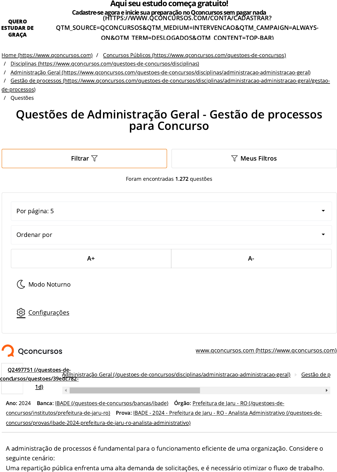 Home (https://www.qconcursos.com) / Concursos Públicos (https://www.qconcursos.com/questoes-de-concursos) / Disciplinas (https://www.qconcursos.com/questoes-de-concursos/disciplinas) / Administração Geral (https://www.qconcursos.com/questoes-de-concursos/disciplinas/administracao-administracao-geral) / Gestão de processos (https://www.qconcursos.com/questoes-de-concursos/disciplinas/administracao-administracao-geral/gestao- de-processos) / Questões Questões de Administração Geral - Gestão de processos para Concurso Filtrar Meus Filtros Foram encontradas 1.272 questões www.qconcursos.com (https://www.qconcursos.com) Ano: 2024 Banca: IBADE (/questoes-de-concursos/bancas/ibade) Órgão: Prefeitura de Jaru - RO (/questoes-de- concursos/institutos/prefeitura-de-jaru-ro) A administração de processos é fundamental para o funcionamento e�ciente de uma organização. Considere o seguinte cenário: Uma repartição pública enfrenta uma alta demanda de solicitações, e é necessário otimizar o �uxo de trabalho. Modo Noturno Con�gurações Por página: 5 Ordenar por A+ A- 1 Q2497751 (/questoes-de- concursos/questoes/39edc782- 1d) Administração Geral (/questoes-de-concursos/disciplinas/administracao-administracao-geral) Gestão de p Prova: IBADE - 2024 - Prefeitura de Jaru - RO - Analista Administrativo (/questoes-de- concursos/provas/ibade-2024-prefeitura-de-jaru-ro-analista-administrativo) Aqui seu estudo começa gratuito! Cadastre-se agora e inicie sua preparação no Qconcursos sem pagar nada QUERO ESTUDAR DE GRAÇA (HTTPS://WWW.QCONCURSOS.COM/CONTA/CADASTRAR? QTM_SOURCE=QCONCURSOS&QTM_MEDIUM=INTERVENCAO&QTM_CAMPAIGN=ALWAYS- ON&QTM TERM=DESLOGADOS&QTM CONTENT=TOP-BAR) https://www.qconcursos.com/ https://www.qconcursos.com/ https://www.qconcursos.com/ https://www.qconcursos.com/questoes-de-concursos https://www.qconcursos.com/questoes-de-concursos https://www.qconcursos.com/questoes-de-concursos https://www.qconcursos.com/questoes-de-concursos/disciplinas https://www.qconcursos.com/questoes-de-concursos/disciplinas https://www.qconcursos.com/questoes-de-concursos/disciplinas https://www.qconcursos.com/questoes-de-concursos/disciplinas/administracao-administracao-geral https://www.qconcursos.com/questoes-de-concursos/disciplinas/administracao-administracao-geral https://www.qconcursos.com/questoes-de-concursos/disciplinas/administracao-administracao-geral https://www.qconcursos.com/questoes-de-concursos/disciplinas/administracao-administracao-geral/gestao-de-processos https://www.qconcursos.com/questoes-de-concursos/disciplinas/administracao-administracao-geral/gestao-de-processos https://www.qconcursos.com/questoes-de-concursos/disciplinas/administracao-administracao-geral/gestao-de-processos https://www.qconcursos.com/questoes-de-concursos/disciplinas/administracao-administracao-geral/gestao-de-processos https://www.qconcursos.com/ https://www.qconcursos.com/questoes-de-concursos/bancas/ibade https://www.qconcursos.com/questoes-de-concursos/bancas/ibade https://www.qconcursos.com/questoes-de-concursos/institutos/prefeitura-de-jaru-ro https://www.qconcursos.com/questoes-de-concursos/institutos/prefeitura-de-jaru-ro https://www.qconcursos.com/questoes-de-concursos/institutos/prefeitura-de-jaru-ro https://www.qconcursos.com/questoes-de-concursos/questoes/39edc782-1d https://www.qconcursos.com/questoes-de-concursos/disciplinas/administracao-administracao-geral https://www.qconcursos.com/questoes-de-concursos/disciplinas/administracao-administracao-geral/gestao-de-processos https://www.qconcursos.com/questoes-de-concursos/provas/ibade-2024-prefeitura-de-jaru-ro-analista-administrativo https://www.qconcursos.com/questoes-de-concursos/provas/ibade-2024-prefeitura-de-jaru-ro-analista-administrativo https://www.qconcursos.com/questoes-de-concursos/provas/ibade-2024-prefeitura-de-jaru-ro-analista-administrativo https://www.qconcursos.com/conta/cadastrar?qtm_source=qconcursos&qtm_medium=intervencao&qtm_campaign=always-on&qtm_term=deslogados&qtm_content=top-bar Descreva três estratégias e�cazes para melhorar os processos administrativos, considerando a agilidade, e�ciência e qualidade do serviço prestado. A Implementação de um sistema informatizado de gestão; B Treinamento contínuo dos servidores para lidar com demandas complexas; C Aumento do número de etapas no processo para garantir a precisão das decisões; D Terceirização de todas as atividades administrativas; E Manutenção do processo atual, sem alterações. Ano: 2024 Banca: FIOCRUZ (/questoes-de-concursos/bancas/�ocruz) Órgão: FIOCRUZ (/questoes-de-concursos/institutos/�ocruz) Na gestão de projetos, o grá�co de Gantt é amplamente utilizado para: A representar visualmente o cronograma do projeto, incluindo a duração das tarefas, suas relações de dependência e a sobreposição de atividades. B mapear a dependência entre as atividades, mostrando quais tarefas devem ser concluídas para que outras possam começar, através de linhas verticais. C detalhar exclusivamente os custos associados a cada etapa do projeto, sem representar sua duração. D oferecer uma análise detalhada de riscos do projeto, substituindo a necessidade de uma matriz de risco. Responder 2 Q2495712 (/questoes-de- concursos/questoes/7fe1a6c1- 1c) Administração Geral (/questoes-de-concursos/disciplinas/administracao-administracao-geral) Gestão de p Prova: FIOCRUZ - 2024 - FIOCRUZ - Analista em Gestão em Saúde - Gestão da Inovação (/questoes-de-concursos/provas/�ocruz-2024- �ocruz-analista-em-gestao-em-saude-gestao-da-inovacao) Gabarito Comentado (0) Aulas Comentários (0) Estatísticas Cadernos Criar an https://www.qconcursos.com/questoes-de-concursos/bancas/fiocruz https://www.qconcursos.com/questoes-de-concursos/bancas/fiocruz https://www.qconcursos.com/questoes-de-concursos/institutos/fiocruz https://www.qconcursos.com/questoes-de-concursos/institutos/fiocruz https://www.qconcursos.com/questoes-de-concursos/ques