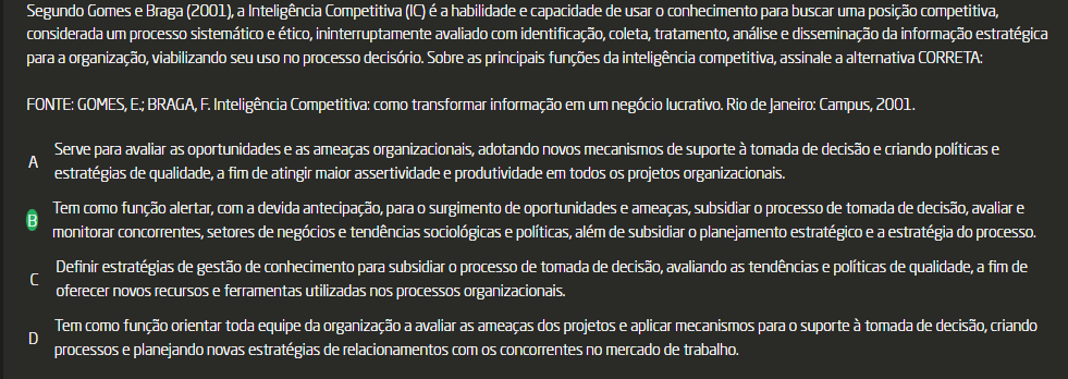 Segundo Gomes e Braga a Inteligência Competitiva (IC) é a habilidade e capacidade de usar conhecimento para buscar uma posição competitiva, considerada um processo sistemático e ético, ininterruptamente avaliado com identificação, coleta, tratamento, análise e disseminação da informação estratégica para a organização, viabilizando seu no processo decisório. Sobre as principais funções da inteligência competitiva, assinale a alternativa CORRETA: A - Serve para avaliar as oportunidades e as ameaças organizacionais, adotando novos mecanismos de suporte à tomada de decisão e criando políticas e estratégias de qualidade, a fim de atingir maior assertividade e produtividade em todos projetos organizacionais. B - Tem como função alertar, com a devida antecipação, para surgimento de oportunidades e ameaças, subsidiar processo de tomada de decisão, avaliar e monitorar concorrentes, setores de negócios e tendências sociológicas e políticas, além de subsidiar planejamento estratégico e a estratégia do processo. C - Definir estratégias de gestão de conhecimento para subsidiar processo de tomada de decisão, avaliando as tendências e políticas de qualidade, a fim de oferecer novos recursos e ferramentas utilizadas nos processos organizacionais. D - Tem como função orientar toda equipe da organização a avaliar as ameaças dos projetos e aplicar mecanismos para suporte à tomada de decisão, criando processos e planejando novas estratégias de relacionamentos com os concorrentes no mercado de trabalho.