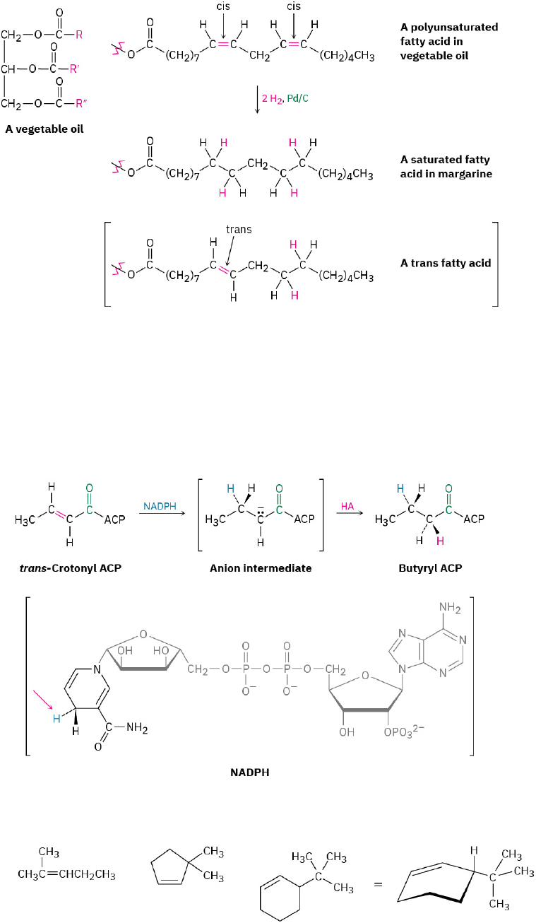 FIGURE 8.8 Catalytic hydrogenation of polyunsaturated fats leads primarily to saturated products, along with a small amount of isomerized trans fats. Double-bond reductions are very common in biological pathways, although the mechanism is completely different from that of laboratory catalytic hydrogenation over palladium. As with biological hydrations (Section 8.4), biological reductions usually occur in two steps and require that the double bond be adjacent to a carbonyl group. In the first step, the biological reducing agent NADPH (reduced nicotinamide adenine dinucleotide phosphate), adds a hydride ion (H:−) to the double bond to give an anion. In the second, the anion is protonated by acid HA, leading to overall addition of H2. An example is the reduction of trans-crotonyl ACP to yield butyryl ACP, a step involved in the biosynthesis of fatty acids (FIGURE 8.9). FIGURE 8.9 Reduction of the carbon–carbon double bond in trans-crotonyl ACP, a step in the biosynthesis of fatty acids. One hydrogen is delivered from NADPH as a hydride ion, H:−; the other hydrogen is delivered by protonation of the anion intermediate with an acid, HA. PROBLEM 8-12 What product would you obtain from catalytic hydrogenation of the following alkenes? (a) (b) (c) 258 8 • Alkenes: Reactions and Synthesis Access for free at openstax.org 8.7 Oxidation of Alkenes: Epoxidation and Hydroxylation Like the word reduction used in the previous section for the addition of hydrogen to a double bond, the word oxidation has a slightly different meaning in organic chemistry than what you might have previously learned. In general chemistry, an oxidation is defined as the loss of one or more electrons by an atom. In organic chemistry, however, an oxidation is a reaction that results in a loss of electron density for carbon, caused either by bond formation between carbon and a more electronegative atom—usually oxygen, nitrogen, or a halogen—or by bond-breaking between carbon and a less electronegative atom—usually hydrogen. Note that an oxidation often adds oxygen, while a reduction often adds hydrogen. In the laboratory, alkenes are oxidized to give epoxides on treatment with a peroxyacid, RCO3H, such as meta-chloroperoxybenzoic acid. An epoxide, also called an oxirane, is a cyclic ether with an oxygen atom in a three-membered ring. For example: Peroxyacids transfer an oxygen atom to the alkene with syn stereochemistry—both C−O bonds form on the same face of the double bond—through a one-step mechanism without intermediates. The oxygen atom farthest from the carbonyl group is the one transferred. Another method for the synthesis of epoxides involves the use of halohydrins, prepared by electrophilic addition of HO−X to alkenes (Section 8.3). When a halohydrin is treated with base, HX is eliminated and an epoxide is produced. Epoxides undergo an acid-catalyzed ring-opening reaction with water (a hydrolysis) to give the corresponding 1,2-dialcohol, or diol, also called a glycol. Thus, the net result of the two-step alkene epoxidation/hydrolysis is hydroxylation—the addition of an −OH group to each of the two double-bond carbons. In fact, approximately 204 million tons of ethylene glycol, HOCH2CH2OH, most of it used for automobile antifreeze, are produced worldwide each year by the epoxidation of ethylene and subsequent hydrolysis. 8.7 • Oxidation of Alkenes: Epoxidation and Hydroxylation 259 Acid-catalyzed epoxide opening begins with protonation of the epoxide to increase its reactivity, followed by nucleophilic addition of water. This nucleophilic addition is analogous to the final step of alkene bromination, in which a cyclic bromonium ion is opened by a nucleophile (Section 8.2). That is, a trans-1,2-diol results when an epoxycycloalkane is opened by aqueous acid, just as a trans-1,2-dibromide results when a cycloalkene is brominated. We’ll look at epoxide chemistry in more detail in Section 18.6. Hydroxylation can also be carried out directly (without going through an intermediate epoxide) by treating an alkene with osmium tetroxide, OsO4. The reaction occurs with syn stereochemistry and does not involve a carbocation intermediate. Instead, it takes place through an intermediate cyclic osmate, which is formed in a single step by addition of OsO4 to the alkene. This cyclic osmate is then cleaved using aqueous sodium bisulfite, NaHSO3. Because OsO4 is both very expensive and very toxic, the reaction is usually carried out using only a small, catalytic amount of OsO4 in the presence of a stoichiometric amount of a safe and inexpensive co-oxidant such as N-methylmorpholine N-oxide, abbreviated NMO. The initially formed osmate intermediate reacts rapidly with NMO to yield the product diol plus N-methylmorpholine and reoxidized OsO4, which reacts with more alkene in a catalytic cycle. 260 8 • Alkenes: Reactions and Synthesis Access for free at openstax.org PROBLEM 8-13 What product would you expect from reaction of cis-2-butene with meta-chloroperoxybenzoic acid? Show the stereochemistry. PROBLEM 8-14 Starting with an alkene, how would you prepare each of the following compounds? (a) (b) (c) 8.8 Oxidation of Alkenes: Cleavage to Carbonyl Compounds In all the alkene addition reactions we’ve seen thus far, the carbon–carbon double bond has been converted into a single bond but the carbon skeleton has been unchanged. There are, however, powerful oxidizing reagents that will cleave bonds and produce two carbonyl-containing fragments. Ozone (O3) is perhaps the most useful double-bond cleavage reagent. Prepared by passing a stream of oxygen through a high-voltage electrical discharge, ozone adds rapidly to a bond at low temperature to give a cyclic intermediate called a molozonide. Once formed, the molozonide spontaneously rearranges to form an ozonide. Although we won’t study the mechanism of this rearrangement in detail, it involves the molozonide coming apart into two fragments that then recombine 