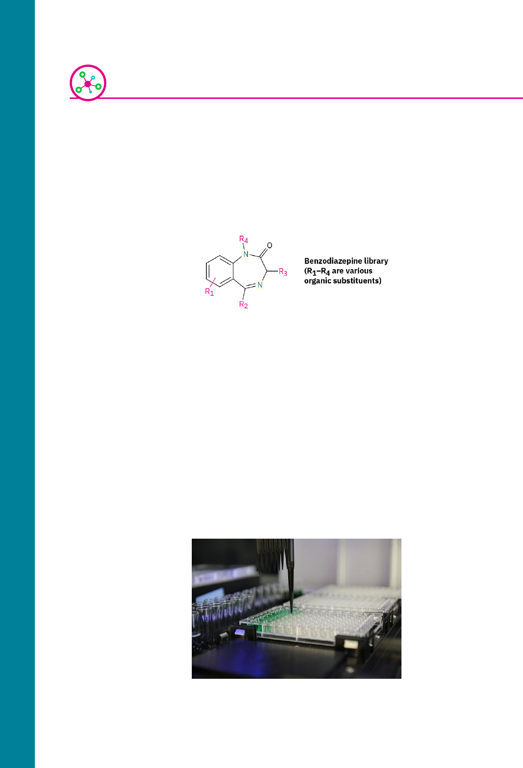 CHEMISTRY MATTERS Combinatorial Chemistry Traditionally, organic compounds have been synthesized one at a time. This works well for preparing large amounts of a few substances, but it doesn’t work so well for preparing small amounts of a great many substances. This latter goal is particularly important in the pharmaceutical industry, where vast numbers of structurally similar compounds must be synthesized and screened to find an optimum drug candidate. To speed the process of drug discovery, combinatorial chemistry has been developed to prepare what are called combinatorial libraries, in which anywhere from a few dozen to several hundred thousand substances are prepared simultaneously. Among the early successes of combinatorial chemistry is the development of a benzodiazepine library, a class of aromatic compounds commonly used as antianxiety agents. Two main approaches to combinatorial chemistry are used—parallel synthesis and split synthesis. In parallel synthesis, each compound is prepared independently. Typically, a reactant is first linked to the surface of polymer beads, which are then placed into small wells on a 96-well glass plate. Programmable robotic instruments add different sequences of building blocks to the different wells, thereby making 96 different products. When the reaction sequences are complete, the polymer beads are washed and their products are released. In split synthesis, the initial reactant is again linked to the surface of polymer beads, which are then divided into several groups. A different building block is added to each group of beads, the different groups are combined, and the reassembled mix is again split to form new groups. Another building block is added to each group, the groups are again combined and redivided, and the process continues. If, for example, the beads are divided into four groups at each step, the number of compounds increases in the progression 4 → 16 → 64 → 256. After 10 steps, more than 1 million compounds have been prepared (FIGURE 16.23). Of course, with so many different final products mixed together, the problem is to identify them. What structure is linked to what bead? Several approaches to this problem have been developed, all of which involve the attachment of encoding labels to each polymer bead to keep track of the chemistry each has undergone. Encoding labels used thus far have included proteins, nucleic acids, halogenated aromatic compounds, and even computer chips. FIGURE 16.22 Organic chemistry by robot means no spilled flasks! 558 16 • Chemistry Matters Access for free at openstax.org FIGURE 16.23 The results of split combinatorial synthesis. Assuming that 4 different building blocks are used at each step, 64 compounds result after 3 steps, and more than one million compounds result after 10 steps. Key Terms • acyl group • acylation • alkylation • benzyne • combinatorial chemistry • electrophilic aromatic substitution • Friedel–Crafts reaction • inductive effect • nucleophilic aromatic substitution • resonance effect Summary We’ve continued the coverage of aromatic molecules in this chapter, shifting focus to concentrate on reactions. In particular, we’ve looked at the relationship between aromatic structure and reactivity, a relationship critical to understanding how numerous biological molecules and pharmaceutical agents are synthesized and why they behave as they do. An electrophilic aromatic substitution reaction takes place in two steps—initial reaction of an electrophile, E+, with the aromatic ring, followed by loss of H+ from the resonance-stabilized carbocation intermediate to regenerate the aromatic ring. Many variations of the reaction can be carried out, including halogenation, nitration, and sulfonation. Friedel–Crafts alkylation and acylation reactions, which involve reaction of an aromatic ring with carbocation electrophiles, are particularly useful. They are limited, however, by the fact that the aromatic ring must be at least as reactive as a halobenzene. In addition, polyalkylation and carbocation rearrangements often occur in Friedel–Crafts alkylation. Substituents on the benzene ring affect both the reactivity of the ring toward further substitution and the orientation of that substitution. Groups can be classified as ortho- and para-directing activators, ortho- and para-directing deactivators, or meta-directing deactivators. Substituents influence aromatic rings by a combination of resonance and inductive effects. Resonance effects are transmitted through π bonds; inductive effects are transmitted through σ bonds. 16 • Key Terms 559 Halobenzenes undergo nucleophilic aromatic substitution through either of two mechanisms. If the halobenzene has a strongly electron-withdrawing substituent in the ortho or para position, substitution occurs by addition of a nucleophile to the ring, followed by elimination of halide from the intermediate anion. If the halobenzene is not activated by an electron-withdrawing substituent, substitution can occur by elimination of HX to give a benzyne, followed by addition of a nucleophile. The benzylic position of an alkylbenzene can be brominated by reaction with N-bromosuccinimide, and the entire side chain can be degraded to a carboxyl group by oxidation with aqueous KMnO4. Aromatic rings can also be reduced to cyclohexanes by hydrogenation over a platinum or rhodium catalyst, and aryl alkyl ketones are reduced to alkylbenzenes by hydrogenation over a platinum catalyst. Summary of Reactions 1. Electrophilic aromatic substitution a. Fluorination (Section 16.2) b. Bromination (Section 16.1) c. Chlorination (Section 16.2) d. Iodination (Section 16.2) e. Nitration (Section 16.2) f. Sulfonation (Section 16.2) g. Friedel–Crafts alkylation (Section 16.3) h. Friedel–Crafts acylation (Section 16.3) 2. Reduction of aromatic nitro groups (Section 16.2) 560 16 • Summary of Reactions Access for free at openstax.org 3. Nucleophilic