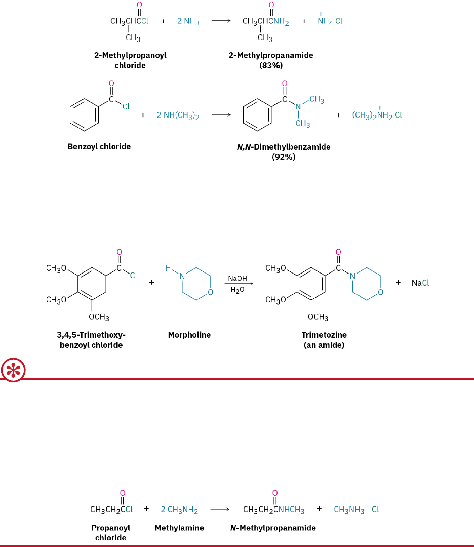 Because HCl is formed during the reaction, two equivalents of the amine must be used. One equivalent reacts with the acid chloride, and one equivalent reacts with the HCl by-product to form an ammonium chloride salt. If, however, the amine component is valuable, amide synthesis is often carried out using one equivalent of the amine plus one equivalent of an inexpensive base such as NaOH. For example, the sedative trimetozine is prepared commercially by reaction of 3,4,5-trimethoxybenzoyl chloride with the amine morpholine in the presence of one equivalent of NaOH. WORKED EXAMPLE 21.3 Synthesizing an Amide from an Acid Chloride How might you prepare N-methylpropanamide by reaction of an acid chloride with an amine? Strategy As its name implies, N-methylpropanamide can be made by reaction of methylamine with the acid chloride of propanoic acid. Solution PROBLEM 21-11 Write the mechanism of the reaction just shown between 3,4,5-trimethoxybenzoyl chloride and morpholine to form trimetozine. Use curved arrows to show the electron flow in each step. PROBLEM 21-12 How could you prepare the following amides using an acid chloride and an amine or ammonia? (a) CH3CH2CONHCH3 (b) N,N-Diethylbenzamide (c) Propanamide Conversion of Acid Chlorides into Alcohols: Reduction and Grignard Reaction Acid chlorides are reduced by LiAlH4 to yield primary alcohols. The reaction is of little practical value, however, because the parent carboxylic acids are generally more readily available and can themselves be reduced by LiAlH4 to yield alcohols. 21.4 • Chemistry of Acid Halides 763 Reduction occurs via a typical nucleophilic acyl substitution mechanism in which a hydride ion (H:–) adds to the carbonyl group, yielding a tetrahedral intermediate that expels Cl–. The net effect is a substitution of –Cl by –H to yield an aldehyde, which is then further reduced by LiAlH4 in a second step to yield the primary alcohol. Grignard reagents react with acid chlorides to yield tertiary alcohols with two identical substituents. The mechanism of the reaction is similar to that of LiAlH4 reduction. The first equivalent of Grignard reagent adds to the acid chloride, loss of Cl– from the tetrahedral intermediate yields a ketone, and a second equivalent of Grignard reagent immediately adds to the ketone to produce an alcohol. Conversion of Acid Chlorides into Ketones: Diorganocopper Reaction The ketone intermediate formed in the reaction of an acid chloride with a Grignard reagent can’t usually be isolated because addition of the second equivalent of organomagnesium reagent occurs too rapidly. A ketone can, however, be isolated from the reaction of an acid chloride with a lithium diorganocopper (Gilman) reagent, Li+ R′2Cu–. The reaction occurs by initial nucleophilic acyl substitution on the acid chloride by the diorganocopper anion to yield an acyl diorganocopper intermediate, followed by loss of R′Cu and formation of the ketone. The reaction is generally carried out at –78 °C in ether solution, and yields are often excellent. For example, manicone, a substance secreted by male ants to coordinate ant pairing and mating, has been synthesized by reaction of lithium diethylcopper with (E)-2,4-dimethyl-2-hexenoyl chloride. Note that the diorganocopper reaction occurs only with acid chlorides. Carboxylic acids, esters, acid anhydrides, and amides do not react with lithium diorganocopper reagents. PROBLEM 21-13 How could you prepare the following ketones by reaction of an acid chloride with a lithium diorganocopper reagent? 764 21 • Carboxylic Acid Derivatives: Nucleophilic Acyl Substitution Reactions Access for free at openstax.org (a) (b) 21.5 Chemistry of Acid Anhydrides Preparation of Acid Anhydrides Acid anhydrides are typically prepared by nucleophilic acyl substitution reaction of an acid chloride with a carboxylate anion, as we saw in the previous section. Both symmetrical and unsymmetrical acid anhydrides can be prepared in this way. Reactions of Acid Anhydrides The chemistry of acid anhydrides is similar to that of acid chlorides, although anhydrides react more slowly. Thus, acid anhydrides react with water to form acids, with alcohols to form esters, with amines to form amides, and with LiAlH4 to form primary alcohols. Only the ester- and amide-forming reactions are commonly used, however. Conversion of Acid Anhydrides into Esters Acetic anhydride is often used to prepare acetate esters from alcohols. For example, aspirin (acetylsalicylic acid) is prepared commercially by the acetylation of o-hydroxybenzoic acid (salicylic acid) with acetic anhydride. 21.5 • Chemistry of Acid Anhydrides 765 Conversion of Acid Anhydrides into Amides Acetic anhydride is also commonly used to prepare N-substituted acetamides from amines. For example, acetaminophen, a drug used in over-the-counter analgesics such as Tylenol, is prepared by reaction of p-hydroxyaniline with acetic anhydride. Only the more nucleophilic –NH2 group reacts rather than the less nucleophilic –OH group. Notice in both of the previous reactions that only “half” of the anhydride molecule is used, while the other half acts as the leaving group during the nucleophilic acyl substitution step and produces acetate ion as a by-product. Thus, anhydrides are inefficient, and acid chlorides are normally preferred for introducing acyl substituents other than acetyl groups. PROBLEM 21-14 Write the mechanism of the reaction between p-hydroxyaniline and acetic anhydride to prepare acetaminophen. PROBLEM 21-15 What product would you expect from reaction of one equivalent of methanol with a cyclic anhydride, such as phthalic anhydride (1,2-benzenedicarboxylic anhydride)? What is the fate of the second “half” of the anhydride? 21.6 Chemistry of Esters Esters are among the most widespread of all naturally occurring compounds. Many simple esters are pleasant- smelling liquids that are responsible for the fragrant odors of fruits and flowers. For exam