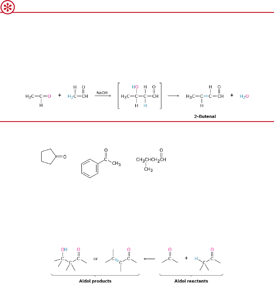 WORKED EXAMPLE 23.2 Predicting the Product of an Aldol Reaction What is the structure of the enone obtained from aldol condensation of acetaldehyde? Strategy In the aldol reaction, H2O is eliminated and a double bond is formed by removing two hydrogens from the acidic α position of one partner and the carbonyl oxygen from the second partner. The product is thus an α,β-unsaturated aldehyde or ketone. Solution PROBLEM 23-3 What enone product would you expect from aldol condensation of each of the following compounds? (a) (b) (c) PROBLEM 23-4 Aldol condensation of 3-methylcyclohexanone leads to a mixture of two enone products, not counting double-bond isomers. Draw them. 23.4 Using Aldol Reactions in Synthesis The aldol reaction yields either a β-hydroxy aldehyde/ketone or an α,β-unsaturated aldehyde/ketone, depending on the experimental conditions. By learning how to work backward, it’s possible to predict when the aldol reaction might be useful in synthesis. Whenever the target molecule contains either a β-hydroxy aldehyde/ ketone or a conjugated enone functional group, it might come from an aldol reaction. We can extend this kind of reasoning even further by imagining that subsequent transformations might be carried out on the aldol products. For example, a saturated ketone might be prepared by catalytic hydrogenation of the enone product. A good example can be found in the industrial preparation of 2-ethyl-1-hexanol, an alcohol used in the synthesis of plasticizers for polymers. Although 2-ethyl-1-hexanol bears little resemblance to an aldol product at first glance, it is in fact prepared commercially from butanal by an aldol reaction. Working backward, we can reason that 2-ethyl-1-hexanol might come from 2-ethylhexanal by a reduction. 2-Ethylhexanal, in turn, might be prepared by catalytic reduction of 2-ethyl-2-hexenal, which is the aldol condensation product of butanal. The reactions that follow show the sequence in reverse order. 23.4 • Using Aldol Reactions in Synthesis 833 PROBLEM 23-5 Which of the following compounds are aldol condensation products? What is the aldehyde or ketone precursor of each? (a) 2-Hydroxy-2-methylpentanal (b) 5-Ethyl-4-methyl-4-hepten-3-one PROBLEM 23-6 1-Butanol is prepared commercially by a route that begins with an aldol reaction. Show the steps that are likely to be involved. PROBLEM 23-7 Show how you would synthesize the following compound using an aldol reaction: 23.5 Mixed Aldol Reactions Until now, we’ve considered only symmetrical aldol reactions, in which the two carbonyl components have been the same. What would happen, though, if an aldol reaction were carried out between two different carbonyl partners? In general, a mixed aldol reaction between two similar aldehyde or ketone partners leads to a mixture of four possible products. For example, base treatment of a mixture of acetaldehyde and propanal gives a complex product mixture containing two “symmetrical” aldol products and two “mixed” aldol products. Clearly, such a reaction is of no practical value. On the other hand, mixed aldol reactions can lead cleanly to a single product if either of two conditions is met: • If one of the carbonyl partners contains no α hydrogens (and thus can’t form an enolate ion to become a donor), but does contain an unhindered carbonyl group (and so is a good acceptor of nucleophiles), then a mixed aldol reaction is likely to be successful. This is the case, for instance, when either benzaldehyde or 834 23 • Carbonyl Condensation Reactions Access for free at openstax.org formaldehyde is used as one of the carbonyl partners. Neither benzaldehyde nor formaldehyde can form an enolate ion to add to another partner, yet both compounds have an unhindered carbonyl group. The ketone 2-methylcyclohexanone, for instance, gives the mixed aldol product on reaction with benzaldehyde. • If one of the carbonyl partners is much more acidic than the other, and is thus transformed into its enolate ion in preference to the other, then a mixed aldol reaction is likely to be successful. Ethyl acetoacetate, for instance, is completely converted into its enolate ion in preference to enolate ion formation from monocarbonyl partners. Thus, aldol condensations of monoketones with ethyl acetoacetate occur preferentially to give the mixed product. The situation can be summarized by saying that a mixed aldol reaction leads to a mixture of products unless one of the partners either has no α hydrogens but is a good electrophilic acceptor (such as benzaldehyde) or is an unusually acidic nucleophilic donor (such as ethyl acetoacetate). PROBLEM 23-8 Which of the following compounds can probably be prepared by a mixed aldol reaction? Show the reactants you would use in each case. (a) (b) (c) 23.6 Intramolecular Aldol Reactions The aldol reactions we’ve seen thus far have all been intermolecular, meaning that they have taken place between two different molecules. When certain dicarbonyl compounds are treated with base, however, an intramolecular aldol reaction can occur, leading to the formation of a cyclic product. For example, base treatment of a 1,4-diketone such as 2,5-hexanedione yields a cyclopentenone product, and base treatment of a 1,5-diketone such as 2,6-heptanedione yields a cyclohexenone. 23.6 • Intramolecular Aldol Reactions 835 The mechanism of intramolecular aldol reactions is similar to that of intermolecular reactions. The only difference is that both the nucleophilic carbonyl anion donor and the electrophilic carbonyl acceptor are now in the same molecule. One complication, however, is that intramolecular aldol reactions might lead to a mixture of products, depending on which enolate ion is formed. For example, 2,5-hexanedione might yield either the five-membered-ring product 3-methyl-2-cyclopentenone or the three-membered-ring product (2-methylcyclopropenyl) ethanone (FIGURE 23.4). In practice, though, only the cyclopentenone is formed. FIGURE