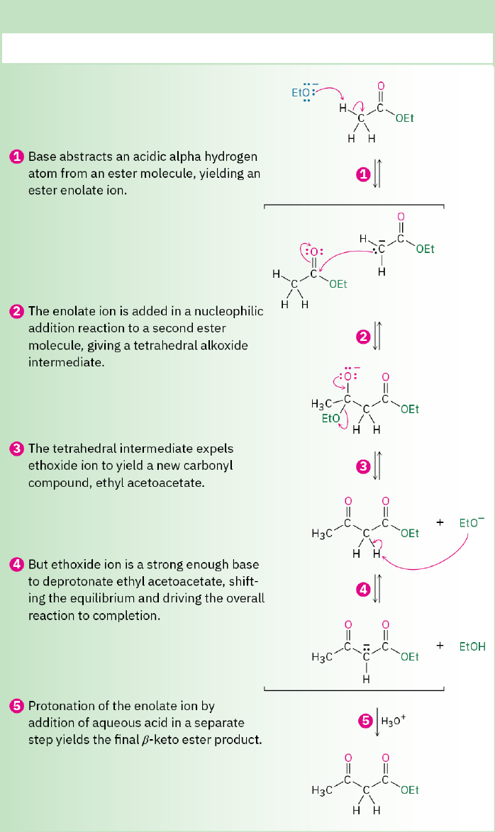 FIGURE 23.5 MECHANISM Mechanism of the Claisen condensation reaction. If the starting ester has more than one acidic α hydrogen, the product β-keto ester has a highly acidic, doubly activated hydrogen atom that can be abstracted by base. This deprotonation of the product requires the use of a full equivalent of base rather than a catalytic amount. Furthermore, the deprotonation serves to drive the equilibrium completely to the product side so that high yields are usually obtained in Claisen condensations. 838 23 • Carbonyl Condensation Reactions Access for free at openstax.org WORKED EXAMPLE 23.3 Predicting the Product of a Claisen Condensation Reaction What product would you obtain from Claisen condensation of ethyl propanoate? Strategy The Claisen condensation of an ester results in loss of one molecule of alcohol and formation of a product in which an acyl group of one reactant bonds to the α carbon of the second reactant. The product is a β-keto ester. Solution PROBLEM 23-11 Show the products you would expect to obtain by Claisen condensation of the following esters: (a) (CH3)2CHCH2CO2Et (b) Ethyl phenylacetate (c) Ethyl cyclohexylacetate PROBLEM 23-12 As shown in Figure 23.5, the Claisen reaction is reversible. That is, a β-keto ester can be cleaved by base into two fragments. Using curved arrows to indicate electron flow, show the mechanism by which this cleavage occurs. 23.8 Mixed Claisen Condensations The mixed Claisen condensation of two different esters is similar to the mixed aldol condensation of two different aldehydes or ketones (Section 23.5). Mixed Claisen reactions are successful only when one of the two ester components has no α hydrogens and thus can’t form an enolate ion. For example, ethyl benzoate and ethyl formate can’t form enolate ions and thus can’t serve as donors. They can, however, act as the electrophilic acceptor components in reactions with other ester anions to give mixed β-keto ester products. Mixed Claisen-like reactions can also be carried out between an ester and a ketone, resulting in the synthesis of a β-diketone. The reaction works best when the ester component has no α hydrogens and thus can’t act as the nucleophilic donor. For example, ethyl formate gives high yields in mixed Claisen condensations with ketones. 23.8 • Mixed Claisen Condensations 839 WORKED EXAMPLE 23.4 Predicting the Product of a Mixed Claisen Condensation Reaction Diethyl oxalate, (CO2Et)2, often gives high yields in mixed Claisen reactions. What product would you expect to obtain from a mixed Claisen reaction of ethyl acetate with diethyl oxalate? Strategy A mixed Claisen reaction is effective when only one of the two partners has an acidic α hydrogen atom. In the present case, ethyl acetate can be converted into its enolate ion, but diethyl oxalate cannot. Thus, ethyl acetate acts as the donor and diethyl oxalate as the acceptor. Solution PROBLEM 23-13 What product would you expect from the following mixed Claisen-like reaction? 23.9 Intramolecular Claisen Condensations: The Dieckmann Cyclization Intramolecular Claisen condensations can be carried out with diesters, just as intramolecular aldol condensations can be carried out with diketones (Section 23.6). Called the Dieckmann cyclization, this reaction works best on 1,6-diesters and 1,7-diesters. Intramolecular Claisen cyclization of a 1,6-diester gives a five-membered cyclic β-keto ester, and cyclization of a 1,7-diester gives a six-membered cyclic β-keto ester. 840 23 • Carbonyl Condensation Reactions Access for free at openstax.org The mechanism of the Dieckmann cyclization, shown in FIGURE 23.6, is the same as that of the Claisen condensation. One of the two ester groups is converted into an enolate ion, which carries out a nucleophilic acyl substitution on the second ester group at the other end of the molecule. A cyclic β-keto ester product results. FIGURE 23.6 MECHANISM Mechanism of the Dieckmann cyclization of a 1,7-diester to yield a cyclic β-keto ester product. The cyclic β-keto ester produced in a Dieckmann cyclization can be further alkylated and decarboxylated by a series of reactions analogous to those used in the acetoacetic ester synthesis (Section 22.7). Alkylation and 23.9 • Intramolecular Claisen Condensations: The Dieckmann Cyclization 841 subsequent decarboxylation of ethyl 2-oxocyclohexanecarboxylate, for instance, yields a 2-alkylcyclohexanone. The overall sequence of (1) Dieckmann cyclization, (2) β-keto ester alkylation, and (3) decarboxylation is a powerful method for preparing 2-substituted cyclopentanones and cyclohexanones. PROBLEM 23-14 What product would you expect from the following reaction? PROBLEM 23-15 Dieckmann cyclization of diethyl 3-methylheptanedioate gives a mixture of two β-keto ester products. What are their structures, and why is a mixture formed? 23.10 Conjugate Carbonyl Additions: The Michael Reaction We saw in Section 19.13 that certain nucleophiles, such as amines, react with α,β-unsaturated aldehydes and ketones to give a conjugate addition product, rather than a direct addition product. Exactly the same kind of conjugate addition can occur when a nucleophilic enolate ion reacts with an α,β-unsaturated carbonyl compound—a process known as the Michael reaction after Arthur Michael at Tufts College and Harvard University. The best Michael reactions are those that take place when a particularly stable enolate ion, such as that derived from a β-keto ester or other 1,3-dicarbonyl compound, adds to an unhindered α,β-unsaturated ketone. For example, ethyl acetoacetate reacts with 3-buten-2-one in the presence of sodium ethoxide to yield the conjugate addition product. Michael reactions take place by addition of a nucleophilic enolate ion donor to the β carbon of an α,β-unsaturated carbonyl acceptor, according to the mechanism shown in FIGURE 23.7. 842 23 • Carbonyl Condensation Reactions Access for free at openstax.org Chapter 23 Carbon
