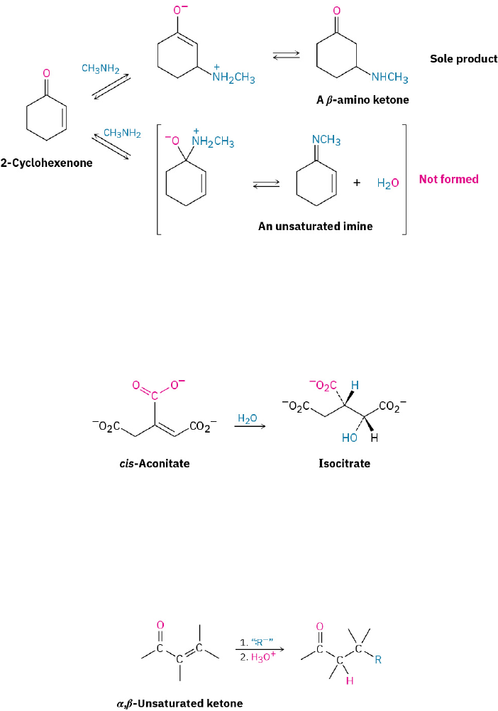 rapidly. But because the reactions are reversible, they generally proceed with thermodynamic control rather than kinetic control (Section 14.3), so the more stable conjugate addition product is often obtained with the complete exclusion of the less stable direct addition product. Conjugate Addition of Water Water can add reversibly to α,β-unsaturated aldehydes and ketones to yield β-hydroxy aldehydes and ketones, although the position of the equilibrium generally favors unsaturated reactant rather than saturated adduct. Related additions to α,β-unsaturated carboxylic acids occur in numerous biological pathways, such as the citric acid cycle of food metabolism in which cis-aconitate is converted into isocitrate by conjugate addition of water to a double bond. PROBLEM 19-20 Assign R or S stereochemistry to the two chirality centers in isocitrate, and tell whether OH and H add to the Si face or the Re face of the double bond. Conjugate Addition of Alkyl Groups: Organocopper Reactions The conjugate addition of an alkyl or other organic group to an α,β-unsaturated ketone (but not aldehyde) is one of the more useful 1,4-addition reactions, just as direct addition of a Grignard reagent is one of the more useful 1,2-additions. Conjugate addition of an organic group is carried out by treating the α,β-unsaturated ketone with a lithium diorganocopper reagent, R2CuLi. As we saw in Section 10.7, lithium diorganocopper (Gilman) reagents are prepared by reaction between 1 equivalent of copper(I) iodide and 2 equivalents of an organolithium regent, RLi. The organolithium reagent, in turn, is formed by reaction of lithium metal with an organohalide in the same way that a Grignard reagent is prepared by reaction of magnesium metal with an organohalide. 688 19 • Aldehydes and Ketones: Nucleophilic Addition Reactions Access for free at openstax.org Primary, secondary, and even tertiary alkyl groups undergo the conjugate addition reaction, as do aryl and alkenyl groups. Alkynyl groups, however, react poorly in the conjugate addition process. Diorganocopper reagents are unique in their ability to give conjugate addition products. Other organometallic reagents, such as Grignard reagents and organolithiums, normally result in direct carbonyl addition on reaction with α,β-unsaturated ketones. The mechanism of this reaction is thought to involve conjugate nucleophilic addition of the diorganocopper anion, R2Cu–, to the unsaturated ketone to give a copper-containing intermediate. Transfer of an R group from copper to carbon, followed by elimination of a neutral organocopper species, RCu, gives the final product. WORKED EXAMPLE 19.4 Using a Conjugate Addition Reaction How might you use a conjugate addition reaction to prepare 2-methyl-3-propylcyclopentanone? Strategy A ketone with a substituent group in its β position might be prepared by a conjugate addition of that group to an α,β-unsaturated ketone. In the present instance, the target molecule has a propyl substituent on the β carbon and might therefore be prepared from 2-methyl-2-cyclopentenone by reaction with lithium dipropylcopper. 19.13 • Conjugate Nucleophilic Addition to α,β‑Unsaturated Aldehydes and Ketones 689 Solution PROBLEM 19-21 Treatment of 2-cyclohexenone with HCN/KCN yields a saturated keto nitrile rather than an unsaturated cyanohydrin. Show the structure of the product, and propose a mechanism for the reaction. PROBLEM 19-22 How might conjugate addition reactions of lithium diorganocopper reagents be used to synthesize the following compounds? (a) (b) (c) (d) 19.14 Spectroscopy of Aldehydes and Ketones Infrared Spectroscopy Aldehydes and ketones show a strong bond absorption in the IR region from 1660 to 1770 cm–1, as the spectra of benzaldehyde and cyclohexanone demonstrate (FIGURE 19.15). In addition, aldehydes show two characteristic C–H absorptions between 2700–2760 and 2800–2860 cm–1. These absorbances are important for distinguishing between aldehydes and ketones. The higher-frequency absorbance is sometimes obscured in cases where the compound has numerous saturated C–H groups, but the lower-frequency peak is almost always visible. 690 19 • Aldehydes and Ketones: Nucleophilic Addition Reactions Access for free at openstax.org FIGURE 19.15 Infrared spectra of (a) benzaldehyde and (b) cyclohexanone. The exact position of the absorption is diagnostic of the nature of the carbonyl group. As the data in TABLE 19.2 indicate, saturated aldehydes usually show carbonyl absorptions near 1730 cm–1 in the IR spectrum, but conjugation of the aldehyde to an aromatic ring or a double bond lowers the absorption by 25 cm–1 to near 1705 cm–1. Saturated aliphatic ketones and cyclohexanones both absorb near 1715 cm–1, and conjugation with a double bond or an aromatic ring again lowers the absorption by 30 cm–1 to 1685–1690 cm–1. Angle strain in the carbonyl group, caused by reducing the ring size of cyclic ketones to four or five, raises the absorption position. Cyclohexanone has its stretch absorbance at 1715 cm–1 while cyclopentanone’s carbonyl stretch is at 1750 cm–1 and cyclobutanone’s is at 1785 cm–1. TABLE 19.2 Infrared Absorptions of Some Aldehydes and Ketones Carbonyl type Example Absorption (cm–1) Saturated aldehyde CH3CHO 1730 Aromatic aldehyde PhCHO 1705 α,β-Unsaturated aldehyde 1705 Saturated ketone CH3COCH3 1715 Cyclohexanone 1715 Cyclopentanone 1750 Cyclobutanone 1785 Aromatic ketone PhCOCH3 1690 α,β-Unsaturated ketone 1685 19.14 • Spectroscopy of Aldehydes and Ketones 691 The values given in TABLE 19.2 are remarkably constant from one aldehyde or ketone to another. As a result, IR spectroscopy is a powerful tool for identifying the kind of a carbonyl group in a molecule of unknown structure. An unknown that shows an IR absorption at 1730 cm–1 is almost certainly an aldehyde rather than a ketone; an unknown that shows an IR absorption at 1750 cm–1 is almost certainly a 