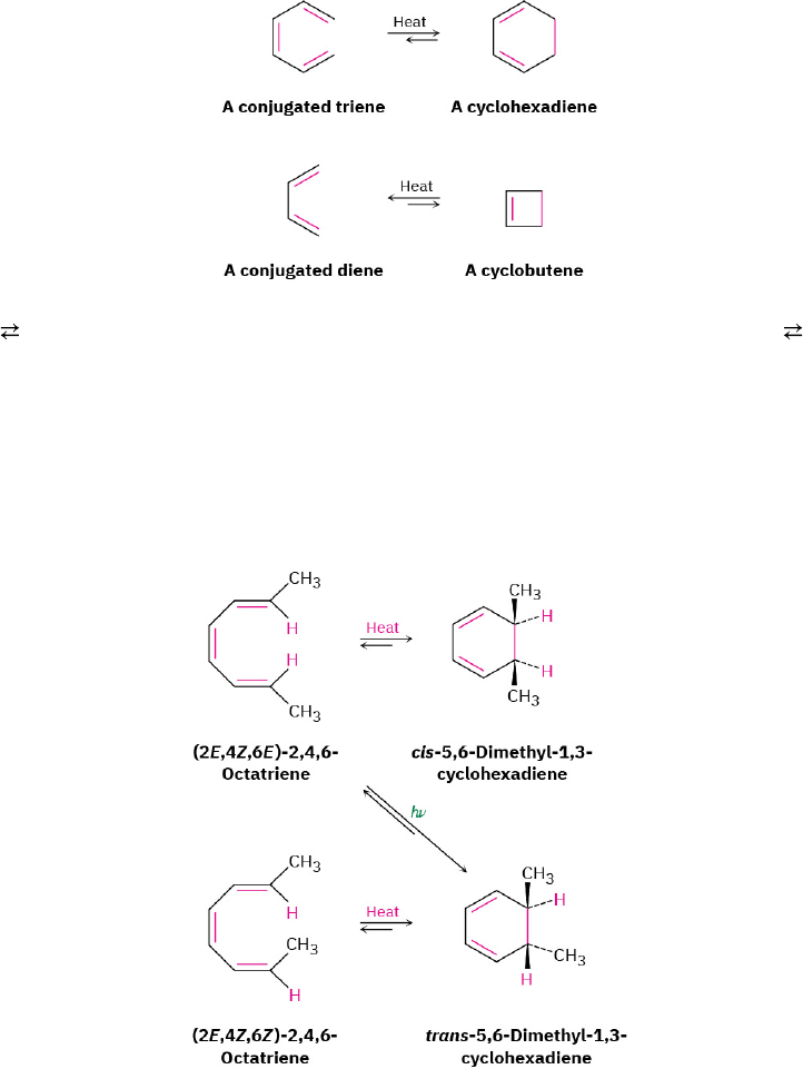 Pericyclic reactions are reversible, and the position of the equilibrium depends on the specific case. In general, the triene cyclohexadiene equilibrium favors the cyclic product, whereas the diene cyclobutene equilibrium favors the less strained open-chain product. The most striking feature of electrocyclic reactions is their stereochemistry. For example, (2E,4Z,6E)-2,4,6-octatriene yields only cis-5,6-dimethyl-1,3-cyclohexadiene when heated, and (2E,4Z,6Z)-2,4,6-octatriene yields only trans-5,6-dimethyl-1,3-cyclohexadiene. Remarkably, however, the stereochemical results change completely when the reactions are carried out under what are called photochemical, rather than thermal, conditions. Irradiation of (2E,4Z,6E)-2,4,6-octatriene with ultraviolet light (denoted hν) yields trans-5,6-dimethyl-1,3-cyclohexadiene (FIGURE 30.4). FIGURE 30.4 Electrocyclic interconversions of 2,4,6-octatriene isomers and 5,6-dimethyl-1,3-cyclohexadiene isomers. A similar result is obtained for the thermal electrocyclic ring-opening of 3,4-dimethylcyclobutene. The trans isomer yields only (2E,4E)-2,4-hexadiene when heated, and the cis isomer yields only (2E,4Z)-2,4-hexadiene. On UV irradiation, however, the results are opposite. Cyclization of the 2E,4E isomer under photochemical conditions yields cis product (FIGURE 30.5). 1108 30 • Orbitals and Organic Chemistry: Pericyclic Reactions Access for free at openstax.org FIGURE 30.5 Electrocyclic interconversions of 2,4-hexadiene isomers and 3,4-dimethylcyclobutene isomers. To account for these results, we need to look at the two outermost lobes of the polyene MOs—the lobes that interact when cyclization occurs. There are two possibilities: lobes of like sign can be either on the same side of the molecule or on opposite sides. For a bond to form, the outermost π lobes must rotate so that favorable bonding interaction is achieved—a positive lobe with a positive lobe or a negative lobe with a negative lobe. If two lobes of like sign are on the same side of the molecule, the two orbitals must rotate in opposite directions—one clockwise and one counterclockwise. This kind of motion is referred to as disrotatory. Conversely, if lobes of like sign are on opposite sides of the molecule, both orbitals must rotate in the same direction, either both clockwise or both counterclockwise. This kind of motion is called conrotatory. 30.2 • Electrocyclic Reactions 1109 30.3 Stereochemistry of Thermal Electrocyclic Reactions How can we predict whether conrotatory or disrotatory motion will occur in a given case? According to frontier orbital theory, the stereochemistry of an electrocyclic reaction is determined by the symmetry of the polyene HOMO. The electrons in the HOMO are the highest-energy, most loosely held electrons and are therefore most easily moved during reaction. For thermal reactions, the ground-state electron configuration is used to identify the HOMO; for photochemical reactions, the excited-state electron configuration is used. Let’s look again at the thermal ring-closure of conjugated trienes. According to FIGURE 30.3, the HOMO of a conjugated triene in its ground state has lobes of like sign on the same side of the molecule, a symmetry that predicts disrotatory ring-closure. This disrotatory cyclization is precisely what is observed in the thermal cyclization of 2,4,6-octatriene. The 2E,4Z,6E isomer yields cis product; the 2E,4Z,6Z isomer yields trans product (FIGURE 30.6). FIGURE 30.6 Thermal cyclizations of 2,4,6-octatrienes occur by disrotatory ring-closures. In the same way, the ground-state HOMO of conjugated dienes (FIGURE 30.2) has a symmetry that predicts conrotatory ring-closure. In practice, however, the conjugated diene reaction can be observed only in the reverse direction (cyclobutene diene) because of the position of the equilibrium. We therefore find that the 3,4-dimethylcyclobutene ring opens in a conrotatory fashion. cis-3,4-Dimethylcyclobutene yields (2E,4Z)-2,4-hexadiene, and trans-3,4-dimethylcyclobutene yields (2E,4E)-2,4-hexadiene by conrotatory opening (FIGURE 30.7). FIGURE 30.7 Thermal ring-openings of cis- and trans-dimethylcyclobutene occur by conrotatory paths. 1110 30 • Orbitals and Organic Chemistry: Pericyclic Reactions Access for free at openstax.org Note that a conjugated diene and a conjugated triene react with opposite stereochemistry. The diene opens and closes by a conrotatory path, whereas the triene opens and closes by a disrotatory path. This is due to the different symmetries of the diene and triene HOMOs. It turns out that there is an alternating relationship between the number of electron pairs (double bonds) undergoing bond reorganization and the stereochemistry of ring-opening or -closure. Polyenes with an even number of electron pairs undergo thermal electrocyclic reactions in a conrotatory sense, whereas polyenes with an odd number of electron pairs undergo the same reactions in a disrotatory sense. PROBLEM 30-2 Draw the products you would expect from conrotatory and disrotatory cyclizations of (2Z,4Z,6Z)-2,4,6-octatriene. Which of the two paths would you expect the thermal reaction to follow? PROBLEM 30-3 trans-3,4-Dimethylcyclobutene can open by two conrotatory paths to give either (2E,4E)-2,4-hexadiene or (2Z,4Z)-2,4-hexadiene. Explain why both products are symmetry- allowed, and then account for the fact that only the 2E,4E isomer is obtained in practice. 30.4 Photochemical Electrocyclic Reactions We noted previously that photochemical electrocyclic reactions take a different stereochemical course than their thermal counterparts, and we can now explain this difference. Ultraviolet irradiation of a polyene causes an excitation of one electron from the ground-state HOMO to the ground-state LUMO, thus changing their symmetries. But because electronic excitation changes the symmetries of HOMO and LUMO, it also changes the reaction stereochemistry. (2E,4E)-2,4-Hexadiene, for instance, undergoes photo