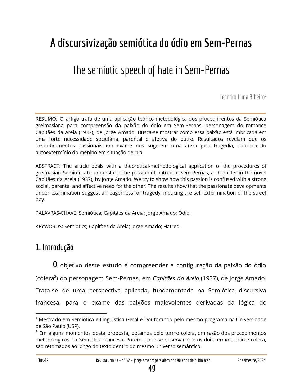 A discursivização semiótica do ódio em Sem-Pernas The semigtic speech of hate in Sem-Pernas Leandro Lima Ribeiro* RESUMO: O artigo trata de uma aplicagdo tedrico-metodolégica dos procedimentos da Semidtica greimasiana para compreensdo da paixdo do 6dio em Sem-Pernas, personagem do romance Capitdes da Areia (1937), de Jorge Amado. Busca-se mostrar como essa paixdo estd imbricada em uma forte necessidade societdria, parental e afetiva do outro. Resultados revelam que os desdobramentos passionais em exame nos sugerem uma ansia pela tragédia, indutora do autoexterminio do menino em situagdo de rua. ABSTRACT: The article deals with a theoretical-methodological application of the procedures of greimasian Semiotics to understand the passion of hatred of Sem-Pernas, a character in the novel Capitdes da Areia (1937), by Jorge Amado. We try to show how this passion is confused with a strong social, parental and affective need for the other. The results show that the passionate developments under examination suggest an eagerness for tragedy, inducing the self-extermination of the street boy. PALAVRAS-CHAVE: Semiética; Capitdes da Areia; Jorge Amado; Odio. KEYWORDS: Semiotics; Capitdes da Areia; Jorge Amado; Hatred. 1. Introdução 0 objetivo deste estudo é compreender a configuragdo da paixdo do 6dio (cólera?) do personagem Sem-Pernas, em Capitdes da Areia (1937), de Jorge Amado. Trata-se de uma perspectiva aplicada, fundamentada na Semidtica discursiva francesa, para o exame das paixdes malevolentes derivadas da légica do " Mestrado em Semiética e Linguistica Geral e Doutorando pelo mesmo programa na Universidade de São Paulo (USP). ? Em alguns momentos desta proposta, optamos pelo termo célera, em razdo dos procedimentos metodoldgicos da Semiética francesa. Porém, pode-se observar que os dois termos, édio e cdlera, sdo retomados ao longo do texto dentro do mesmo universo semantico. Dossiê Revista Crioula - nº 32 - Jorge Amado: para além dos 90 anos de publicação 2º semestre/2023 49 @ Leandro Lima Ribeiro reconhecimento, que podem desencadear o desamparo, a depresséo etc. Busca-se contribuir, no horizonte dos estudos linguistico-discursivos, com o exame da célera no romance amadiano que tem sido objeto de investigacdo de sociólogos, psicdlogos, antropdlogos, nas diferentes areas do conhecimento. Afinal, as paixões estdo discursivizadas na linguagem: são, antes de mais nada, resultantes do cédigo simbdlico. Para tanto, escolhemos um personagem emblematico que nos permite visualizar a construgdo discursiva da paixdo: Sem-Pernas, vitima de uma série de injusticas sociais, que se mata por se considerar propriedade privada diante da incompletude das ações humanas. Do ponto de vista teérico-metodolégico, como ja destacado em linhas anteriores, ancoramos esta analise na esteira dos estudos de Algirdas Julien Greimas (2014), fundador da Semidtica discursiva francesa (ou greimasiana), que apresenta uma metodologia analitica, de acordo com decomposições e vicissitudes patémicas do sujeito encolerizado. Porém, antes de passarmos ao exame desses procedimentos, algumas questdes sdo apontadas em relagdo ao romance Capitdes da Areia, entre elas o desmerecimento e/ou ocultagdo deste no cenario académico brasileiro. Basta atentarmos ao fato de que Jorge Amado, escritor de ampla penetragdo e capilaridade nacional e internacional, pouco desperta o interesse de pesquisadores no campo das ciéncias da linguagem até os dias de hoje. Não sem razéo, diante dos modelos de andlise formal e do comportamento conservador de nossos estudiosos, nosso sujeito oculto tenha pouco ou quase nenhum estatuto de cidadania académica, permanecendo a margem da intensa produção de conhecimento, no campo linguistico, quando comparado aos canones da literatura nacional, de quem nos valemos como objeto de compreensé&o. Dossiê Revista Crioula - nº 32 - Jorge Amado: para além dos 90 anos de publicação 2° semestre/2023 50 A discursivização semiótica do ódio em Sem-Pernas O que não se entende, ainda, é que Jorge Amado não mede esforços para uma elaboração linguística com profunda identificação não apenas com a coloquialidade popular e a linguagem em seu uso real e concreto enquanto projeto estético, mas também não deixa de alinhá-lo à denúncia das profundas assimetrias de direitos em contextos de vulnerabilidade social e racial enquanto projeto ideológico (LAFETÁ, 2020). Os personagens de Capitães da Areia, por exemplo, são seres de intensas paixões humanas, que sofrem, amam, revoltam-se, encantam-se e desencantam-se com a vida e, na medida em que são tutelados pelos aparelhos e mecanismos de poder, mostram-se autênticos diante das soluções encontradas para a disfórica sobrevivência. Essa particularidade dos personagens amadianos, entre eles Sem-Pernas, permite-nos diferenciarmos, em certa medida, de outras abordagens sobre essas paixões presentes em obras literárias, dada a discursivização frente às experiências traumáticas vividas por sujeitos que sofrem intensas práticas de violência e exigências desmedidas. A miséria, o patriarcado , a família são elementos centrais de tematização do romance e, não sem razão, fatores causais do autoextermínio. Nas próximas linhas, após a apresentação dos procedimentos teórico-metodológicos, dois aspectos estão sendo considerados: a configuração léxico-semântica e a sintaxe modal da cólera à luz do Esquema Passional Canônico. 2. Procedimentos teórico-metodológicos Para o exame aqui desenvolvido, selecionamos um conjunto de textos extraídos do Capitães da Areia, onde se evidencia desdobramentos patêmicos que configuram o percurso passional da cólera em Sem-Pernas, criança órfã, em situação de rua e com deficiência física. A hipótese aqui desenvolvida é a de que a Dossiê Revista Crioula - nº 32 - Jorge Amado: para além dos 90 anos de publicação 2° semestre/2023 51 @ Leandro Lima 