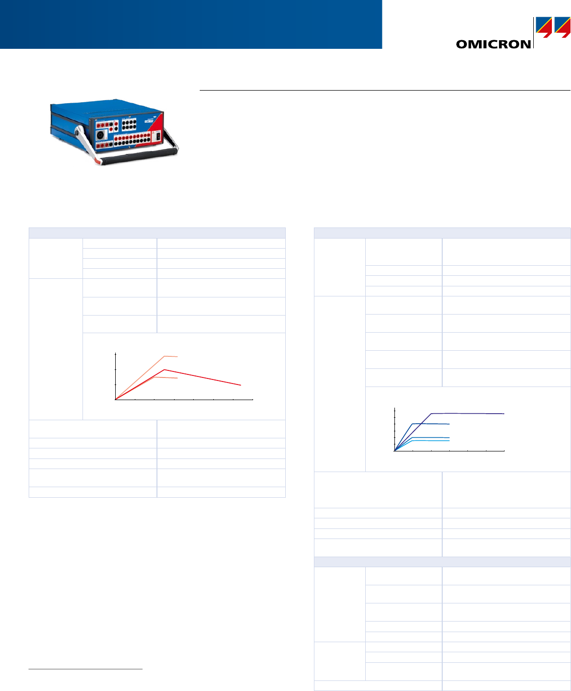Geradores de corrente Range de ajuste 3 fases de CA (L-N) 3 x 0... 32 A 1 fase de CA (L-L) 1 x 0... 32 A 1 fase de CA (LL-LN) 1 x 0... 64 A CC (LL-LN) 1 x 0... ±90 A Potência2, 3 3 fases de CA (L-N) 3 x 430 VA tip. em 25 A 3 x 250 W gar. em 20 A 1 fase de CA (L-L) 1 x 870 VA tip. em 25 A 1 x 530 W gar. em 20 A CC (LL-LN) 1 x 700 W tip. em ±40 A 1 x 500 W gar. em ±40 A 3-phase AC (L-N) 1-phase AC (L-L) 1-phase AC (LL-LN) 0 50 60 70 600 900 300 0 10 20 30 40 Output current / AO ut pu t p ow er (t yp .) / VA Precisão 4 Erro < 0,05% rd. 5 + 0,02% rg. 5 tip. Erro < 0,15% rd. + 0,05% rg. gar. Distorção Harmônica (THD+N) 6 < 0,05% tip., < 0,15% gar. Resolução 1 mA Tensão máx. de conformidade (L-N)/(L-L) 35 Vpk/70 Vpk Conexão por soquetes banana 4 mm soquetes banana (32 A continuamente) Conexão por soquete combinado 25 A máx. continuamente Geradores de Tensão Range de ajuste CA de 4 fases (L-N) 4 x 0... 300 V (VL4(t) automaticamente calculado: VL4 = (VL1+VL2+VL3)*c ou programável livremente) CA de 3 fases (L-N) 3 x 0... 300 V CA de 1 fase (L-L) 1 x 0... 600 V CC (L-N) 4 x 0... ±300 V Potência3 CA de 3 fases (L-N) 3 x 100 VA tip. em 100... 300 V 3 x 85 VA gar. em 85... 300 V CA de 4 fases (L-N) 4 x 75 VA tip. em 100... 300 V 4 x 50 VA gar. em 85... 300 V CA de 1 fase (L-N) 1 x 200 VA tip. em 100... 300 V 1 x 150 VA gar. em 75... 300 V CA de 1 fase (L-L) 1 x 275 VA tip. em 200... 600 V 1 x 250 VA gar. em 200... 600 V CC (L-N) 1 x 420 W tip. em ±300 V 1 x 360 W gar. em ±300 V Output voltage / VO ut pu t p ow er (t yp .) / VA 1-phase AC (L-L) 1-phase AC (L-N) 3-phase AC (L-N) 4-phase AC (L-N) 300 250 200 150 100 50 0 0 100 200 300 400 500 600 Precisão Erro < 0,03% rd. 5 + 0,01% rg. 5 tip. em 0... 300 V Erro < 0,08% rd. + 0,02% rg. gar. em 0... 300 V Distorção Harmônica (THD+N) 6 0,015% tip., < 0,05% gar. Ranges 150 V/300 V Resolução 5 mV/10 mV no range de 150 V/300 V Conexão Soquetes banana de 4 mm /soquete de combinação (1,2,3,N) Geradores, geral Frequência Range de sinais senoidais 7 10... 1000 Hz Harmônicas da range / inter-harmônicas Tensão: 10... 3000 Hz 8 Corrente: 10... 1000 Hz Range de sinais transitórios CC... 3,1 kHz 8 Precisão/drift ±0,5 ppm/±1 ppm Resolução < 5 µHz Range Range de ângulo -360°... +360° Resolução 0,001° Erro em 50/60 Hz Tensão: 0,02° tip., < 0,1° gar. Corrente: 0,05° tip., < 0,2° gar. 4 Largura de banda (-3 dB) 3,1 kHz Dados técnicos1 1 Todos os dados especificados são garantidos, salvo indicação em contrário. A OMICRON garante os dados especificados por um ano após a calibração de fábrica, dentro de 23 °C ± 5 °C, na range de frequência de 10 a 100 Hz e após uma fase de aquecimento > 25 minutos 2 Valores típicos CA válidos para cargas indutivas (por exemplo, relés e/m) 3 Operação contínua com potência total de saída possível por 15 minutos 4 R carga: 0... 0,5 Ω 5 rd. = leitura, rg. = range 6 THD+N: Valores em 50/60 Hz, > 1 A/20 V com largura de banda de 20 kHz 7 Para saídas de corrente, depreciação da amplitude em > 380 Hz 8 Depreciação de amplitude em > 1.000 Hz CMC 353 – Ferramenta potente para testes de proteção trifásica Com seu design compacto e leve, possuindo apenas 13,3 kg (29,3 lb), o CMC 353 fornece a combinação perfeita de portabilidade e potência. É o equipamento de teste ideal para testes de proteção trifásicos e o comissionamento de sistemas SCADA. As poderosas saídas de corrente (3 x 32 A/430 VA) sustentam testes de relé de 5 A, bem como teste de relés eletromecânicos de forma otimizada. O design portátil torna este equipamento uma excelente escolha para o comissionamento e tarefas de manutenção, particularmente na indústria, em geração distribuída e aplicações de média e baixa tensão. Ele atende uma ampla variedade de desafios na engenharia de proteção — desde testes de relés eletromecânicos aos testes mais recentes de IEDs IEC 61850. Dados técnicos do CMC 353 (continuação) Saídas de baixo nível 1 Número de saídas 6 (12 com Opção LLO-2) Range de ajuste 0... ±10 Vpk Corrente máx. de saída 1 mA Precisão Erro < 0,025% tip., < 0,07% gar. em 1... 10 Vpk Resolução 250 µV Distorção Harmônica (THD+N) 2 < 0,015% tip., < 0,05% gar. Simulação TC/TP não convencionais Linear, Rogowski (transitório e senoidal) Indicação de sobrecarga Sim Isolação SELV Usabilidade Completamente independente das saídas dos amplificadores internos Conexão Soquete de combinação com 16 pinos (traseira) Alimentação auxiliar de CC Ranges de tensão 0... 264 VDC, 0,2 A/0... 132 VDC, 0,4 A/0... 66 VDC, 0,8 A Potência Máx. 50 W Precisão Erro < 2% tip., < 5% gar. Entradas binárias Número 10 Critérios de trigger Alternância entre contatos livres de potencial ou tensão CC comparada à tensão limiar Características da entrada binária 0... ±300 VDC limiar ou livre de potencial Ranges 20 V/300 V Resolução do limiar 50 mV (0... 20 V), 500 mV (20 V... 300 V) Taxa da amostragem 10 kHz (resolução 100 µs) Precisão da marcação do tempo ±0,00015% de rd.3 ±70 µs Tempo máx. de medição Infinito Tempo de debounce/deglitch 0... 25 ms/0... 25 ms Função de contagem < 3 kHz em largura de pulso > 150 µs Isolação galvânica 5 grupos isolados galvanicamente (2+2+2+2+2) Tensão máx. de entrada CAT IV/150 V, CAT III/300 V, imunidade transitória 2 kV Entradas de contador 100 kHz Número 2 Frequência máx. de contagem 100 kHz Largura de pulso > 3 µs Tensão limiar 6 V Histerese da tensão 2 V Tensão máx. de entrada ±30 V Isolação SELV Conexão Soquete de combinação com 16 pinos (traseira) Trigger em sobrecarga Geradores suportados Geradores de corrente Precisão do temporizador Erro < 1 ms Saídas binárias, relés Tipo Contatos de relé livres de potencial, controlado por software Número 4 Capacidade de interrupção de CA Vmáx: 300 VAC/Imax: 8 A/Pmax: 2000 VA Capacidade de interrupção de CC Vmáx: 300 VDC/Imax: 8 A/Pmax: 50 W Saídas