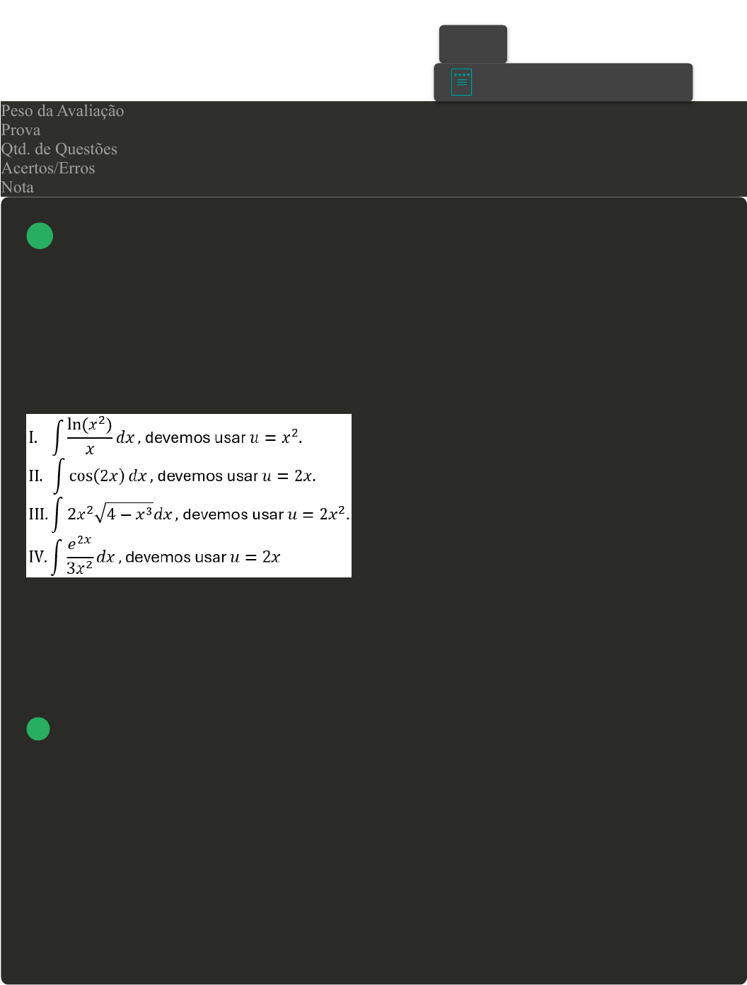 Prova Impressa GABARITO | Avaliação Final (Objetiva) - Individual (Cod.:956704) Peso da Avaliação 4,00 Prova 83484480 Qtd. de Questões 10 Acertos/Erros 9/1 Nota 9,00 No cálculo, a integral de uma função foi criada originalmente para determinar a área sob uma curva no plano cartesiano e também surge naturalmente em dezenas de problemas da física, como na determinação da posição em todos os instantes de um objeto, se for conhecida a sua velocidade instantânea em todos os instantes. Para resolver estas integrais, podemos recorrer a alguns métodos de resolução. Um deles é o método da integração por substituição. Sobre o exposto, analise as sentenças a seguir: É correto o que se afirma em: A I, II e IV, apenas. B I e II, apenas. C II, III e IV, apenas. D II e III, apenas. E I, III e IV, apenas. VOLTAR A+ Alterar modo de visualização 1 01/06/2024, 13:01 Avaliação Final (Objetiva) - Individual about:blank 1/8 O cálculo integral desempenha um papel fundamental em uma ampla gama de disciplinas, desde a física e a engenharia até a economia e as ciências naturais. Sua versatilidade e poder analítico permitem modelar e resolver problemas complexos que envolvem taxas de variação e acumulação contínua. Ele abrange dois aspectos principais: as integrais definidas e as indefinidas. Sobre o exposto, analise as sentenças a seguir: I. Uma integral definida tem limites de integração, enquanto uma integral indefinida não os tem. II. A integral indefinida, tem como princípio, encontrar uma função cuja derivada seja igual à função original. III. Um indicador que podemos usar para definir se a integral é definida ou indefinida, é o diferencial de integração, presente no final da integral. IV. As integrais indefinidas, resultam em uma família de funções cuja derivada é igual à função original. É correto o que se afirma em: A I e III, apenas. B II, III e IV, apenas. C I, II, III e IV. D II e III, apenas. E I, II e IV, apenas. As operações inversas: adição e subtração, multiplicação e divisão, potenciação e radiciação, exponenciação e logaritmação, já são bastante conhecidas. A integração indefinida é basicamente a operação inversa da diferenciação. Assim, dada a derivada de uma função, o processo que consiste em achar a função que a originou, ou seja, achar a sua primitiva denomina-se de antiderivação. Baseado nisso, analise as opções que apresentam f(x), sendo que f'(x) = 3x² - 6x + 2 para todo x e com f(1) = 2: I. f(x) = 6x² - 6 II. f(x) = x³ - 3x² + 2x + 2 III. f(x) = x³ - 6x² + 2x IV. f(x) = 3x² - 2x - 3 É correto apenas o que se afirma em 2 3 01/06/2024, 13:01 Avaliação Final (Objetiva) - Individual about:blank 2/8 A I e II, apenas. B II e IV, apenas. C II e III, apenas. D II, apenas. E I, apenas. A compreensão das derivadas parciais desempenha um papel crucial na análise de funções de várias variáveis. Ao calcular as derivadas parciais em relação a cada uma das variáveis independentes, podemos determinar a taxa de variação da função em direções específicas do espaço multidimensional. Dessa forma, sobre a função f(x, y) = 2x²y – xy, analise as sentenças a seguir: É correto o que se afirma em: A II, III e IV, apenas. B I, III e IV, apenas. C II e III, apenas. D I e II, apenas. 4 01/06/2024, 13:01 Avaliação Final (Objetiva) - Individual about:blank 3/8 E I e IV, apenas. O limite de uma função com duas variáveis indica o comportamento da função em torno de um ponto específico no espaço bidimensional. Ele descreve como os valores da função se aproximam ou se afastam desse ponto à medida que suas variáveis independentes se aproximam ou se distanciam. Em certos casos, calcular o limite de uma função é direto, enquanto em outros, demanda manipulações ou estratégias específicas para sua determinação. Assinale a alternativa que apresenta o resultado do limite a seguir: A O limite é 7/3. B O limite não existe. C O limite é 2. D O limite é 11/5. E O limite é 2/3. Para resolver essa questão, considere que o valor médio de uma função, denominado Vmf, em um dado intervalo [a, b], a qual seja diferenciável neste intervalo, é dado por: Seja uma empresa que produz e vende kits de jardinagem urbana. Seus clientes recebem um kit completo com vasos, terra, sementes e ferramentas para cultivar ervas, vegetais e flores em pequenos espaços, como varandas e jardins verticais. O valor do custo de produção para uma certa quantidade de kits (x), é definido pela função C(x) = 0,08x³ - 0,9x² + 1,4x + 5. Assim, o valor médio do custo de produção, em de reais para um intervalo de 20 a 30 kits é: Revisar Conteúdo do Livro 5 6 01/06/2024, 13:01 Avaliação Final (Objetiva) - Individual about:blank 4/8 A R$ 630,00. B R$ 770,00. C R$ 810,00. D R$ 540,00. E R$ 530,00. Para calcular a área de interseção entre curvas usando integrais, é fundamental definir corretamente os limites de integração ao longo do eixo x, que em alguns casos é definido pelos pontos de intersecção das curvas. Dessa forma, observe o setor de área definido pelas funções f e g na ilustração a seguir Considerando as informações apresentadas, avalie as asserções a seguir e a relação proposta entre elas. I. Para calcular a área deste setor, é necessário aplicar a integral 7 01/06/2024, 13:01 Avaliação Final (Objetiva) - Individual about:blank 5/8 PORQUE II. A integral que envolve o cálculo de área entre curvas, é sempre definido pela diferença da curva que está por baixo (ao quadrado) com a curva que está por acima (também quadrado). A respeito dessas asserções, assinale a opção correta: A As asserções I e II são verdadeiras, e a II é uma justificativa correta da I. B A asserção I é uma proposição falsa e a II é uma proposição verdadeira. C A asserção I é uma proposição verdadeira e a II é uma proposição falsa. D As asserções I e II são verdadeir
