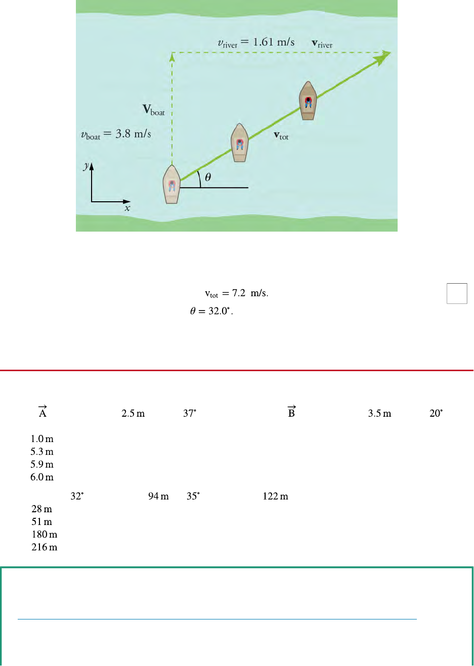 Figure 5.16 A boat attempts to travel across a river. What is the total velocity and direction of the boat? Solution By using a ruler, we find that the length of the resultant vector is 7.2 cm, which means that the magnitude of the total velocity is By using a protractor to measure the angle, we find Discussion If the velocity of the boat and river were equal, then the direction of the total velocity would have been 45°. However, since the velocity of the river is greater than that of the boat, the direction is less than 45° with respect to the shore, or x axis. Practice Problems 1. Vector , having magnitude , pointing south of east and vector having magnitude , pointing north of east are added. What is the magnitude of the resultant vector? a. b. c. d. 2. A person walks north of west for and east of south for . What is the magnitude of his displacement? a. b. c. d. 5.5 Virtual Physics Vector Addition In this simulation (https://archive.cnx.org/specials/d218bf9b-e50e-4d50-9a6c-b3db4dad0816/vector-addition/) , you will experiment with adding vectors graphically. Click and drag the red vectors from the Grab One basket onto the graph in the middle of the screen. These red vectors can be rotated, stretched, or repositioned by clicking and dragging with your mouse. Check the Show Sum box to display the resultant vector (in green), which is the sum of all of the red vectors placed on the 152 Chapter 5 • Motion in Two Dimensions Access for free at openstax.org. https://archive.cnx.org/specials/d218bf9b-e50e-4d50-9a6c-b3db4dad0816/vector-addition/ Check Your Understanding 3. While there is no single correct choice for the sign of axes, which of the following are conventionally considered positive? a. backward and to the left b. backward and to the right c. forward and to the right d. forward and to the left 4. True or False—A person walks 2 blocks east and 5 blocks north. Another person walks 5 blocks north and then two blocks east. The displacement of the first person will be more than the displacement of the second person. a. True b. False 5.2 Vector Addition and Subtraction: Analytical Methods Section Learning Objectives By the end of this section, you will be able to do the following: • Define components of vectors • Describe the analytical method of vector addition and subtraction • Use the analytical method of vector addition and subtraction to solve problems Section Key Terms analytical method component (of a two-dimensional vector) Components of Vectors For the analytical method of vector addition and subtraction, we use some simple geometry and trigonometry, instead of using a ruler and protractor as we did for graphical methods. However, the graphical method will still come in handy to visualize the problem by drawing vectors using the head-to-tail method. The analytical method is more accurate than the graphical method, which is limited by the precision of the drawing. For a refresher on the definitions of the sine, cosine, and tangent of an angle, see Figure 5.17. graph. To remove a red vector, drag it to the trash or click the Clear All button if you wish to start over. Notice that, if you click on any of the vectors, the is its magnitude, is its direction with respect to the positive x-axis, Rx is its horizontal component, and Ry is its vertical component. You can check the resultant by lining up the vectors so that the head of the first vector touches the tail of the second. Continue until all of the vectors are aligned together head-to-tail. You will see that the resultant magnitude and angle is the same as the arrow drawn from the tail of the first vector to the head of the last vector. Rearrange the vectors in any order head-to-tail and compare. The resultant will always be the same. Click to view content (https://archive.cnx.org/specials/d218bf9b-e50e-4d50-9a6c-b3db4dad0816/vector-addition/) GRASP CHECK True or False—The more long, red vectors you put on the graph, rotated in any direction, the greater the magnitude of the resultant green vector. a. True b. False 5.2 • Vector Addition and Subtraction: Analytical Methods 153 https://archive.cnx.org/specials/d218bf9b-e50e-4d50-9a6c-b3db4dad0816/vector-addition/ Figure 5.17 For a right triangle, the sine, cosine, and tangent of θ are defined in terms of the adjacent side, the opposite side, or the hypotenuse. In this figure, x is the adjacent side, y is the opposite side, and h is the hypotenuse. Since, by definition, , we can find the length x if we know h and by using . Similarly, we can find the length of y by using . These trigonometric relationships are useful for adding vectors. When a vector acts in more than one dimension, it is useful to break it down into its x and y components. For a two-dimensional vector, a component is a piece of a vector that points in either the x- or y-direction. Every 2-d vector can be expressed as a sum of its x and y components. For example, given a vector like in Figure 5.18, we may want to find what two perpendicular vectors, and , add to produce it. In this example, and form a right triangle, meaning that the angle between them is 90 degrees. This is a common situation in physics and happens to be the least complicated situation trigonometrically. Figure 5.18 The vector , with its tail at the origin of an x- y-coordinate system, is shown together with its x- and y-components, and These vectors form a right triangle. and are defined to be the components of along the x- and y-axes. The three vectors, , , and , form a right triangle. If the vector is known, then its magnitude (its length) and its angle (its direction) are known. To find and , its x- and y-components, we use the following relationships for a right triangle: and where is the magnitude of A in the x-direction, is the magnitude of A in the y-direction, and is the angle of the resultant with respect to the x-axis, as shown in Figure 5.19. 154 Chapter 5 • Motion in Two Dimensions Access for free at openstax.org. F