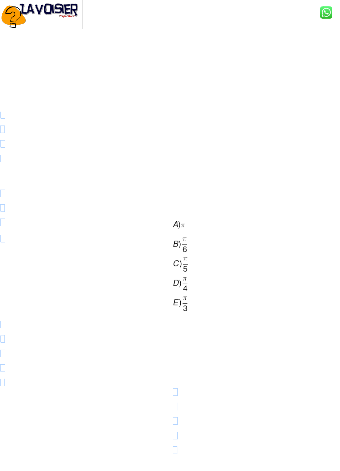 99 99165-2562 1. Quais os menores valores não negativos côngruos aos seguintes arcos: a) 1125° b) 1035° c) -840° d) -300° e) 410º 2. Calcule o valor de: a) sen 150° b) sen 120° c) sen 300° d) sen 270º 3. Calcule o valor de: a) cos 150o b) cos 120o c) cos 300o d) cos 270º Calcule o valor de: a) tg 150o b) tg 120o c) tg 300o d) tg 270o Se β é um ângulo pertencente ao primeiro quadrante do círculo trigonométrico, de tal forma que: cos β = 3/5, então, qual é o valor de “sen β”? A 0,25 B 0,60 C 0,80 D 0,90 - Se x - y = 60°, então o valor de (senx + seny)² + (cosx + cosy)² é igual a: O valor da tg 1665º é: A 0 B 1 C D Dada a função f(x) = sen x + 3, o valor numérico da função para x = 3π/2 é: A) 0. B) 1. C) 2. D) 3. E) 4. Sabendo que sen(x) = 8/17 e que “x” é um arco do primeiro quadrante, então o valor de cos(x) será: A −8/17 B −15/17 C 15/17 D 17/15 E 8/15 Sabendo que x é um arco do primeiro quadrante e que sen x = 0,8, determine cos x e tg x. Sabendo que cosx = 4/5, qual é o valor de sen2x? a) 24/25 b) 24/50 c) 24/2 d) 4/5 e) 3/5 - Qual o valor de y na expressão abaixo: 𝑦 = 𝑐𝑜𝑠²10° + 𝑐𝑜𝑠²20° + 𝑐𝑜𝑠²30° + 𝑐𝑜𝑠²40° + 𝑐𝑜𝑠²50° + 𝑐𝑜𝑠²60° + 𝑐𝑜𝑠²70° + 𝑐𝑜𝑠²80° + 𝑐𝑜𝑠²90° Uma função trigonométrica possui lei de formação igual a f(x) = 2cos(x) – 1. O valor numérico dessa função quando x = π/3 é: A) -2 B) -1 C) 0 D) 1 E) 2 Dada a função f(x) = 1 + 2cos(x), seja x um ângulo do primeiro quadrante, então o valor de x que faz com que f(x) = 2 é: Dada a função f(x) = sen²(x) + 2cos(x), o valor numérico da função para x = π/4 é: A) 0,5 + √2. B) 1 + √2. C) 4. D) 4 – √2. E) 0,5 + √3. Sabendo que x pertence ao 4º quadrante e que cos x = 0,8, pode- se afirmar que o valor de sen 2x é igual a: A 0,28. B –0,96. C –0,28. D 0,96. E 1. Conhecendo a função trigonométrica y = 2cos²(x) – √2sen(x), o valor da função quando x = π/4 é: A) -2 B) -1 C) 0 D) 1 E) 2 É CORRETO afirmar que um arco de medida 7π/4 𝑟𝑎𝑑𝑖𝑎𝑛𝑜𝑠 tem: A Seno e cosseno positivos. B Seno positivo e cosseno negativo. C Seno negativo e cosseno positivo. D Seno e cosseno negativos. Em um sorteio, usa-se uma roda dividida em 360 números, como o ciclo trigonométrico. Ao ser girado, o marcador do número ganhador, que estava originalmente no zero, formou um ângulo de 2 190°. Dessa forma, o número que foi sorteado foi A 3. B 30 C 60 D 90 Sabendo que x pertence ao 4º quadrante e que cos x = 0,8, pode- se afirmar que o valor de sen 2x é igual a: A 0,28. B –0,96. C –0,28. D 0,96. E 1. Qual é o resultado do produto senπ/8·cosπ/8? a) ½ b) √2/2 c) 2√2 d) ¼ e) √2/4 Se sen x = cos 10° e cos x = −sen 10°, um possível valor para x é: A 80° B 100° C 170° D 260° E 280° Quando os ponteiros de um relógio marcam 1h50min, qual a medida do ângulo central formado por eles? A) 120° B) 115° C) 110° D) 95° Se o ponteiro dos minutos de um relógio mede 12 centímetros, o número que MELHOR aproxima a distância em centímetros percorrida por sua extremidade em 20 minutos é (Considere π = 3,14): A) 37,7 cm. B) 25,1 cm. C) 20 cm. D) 12 cm. E) 3,14 cm. Um arco de circunferência mede 300° e seu comprimento é 2 km. Qual o número inteiro mais próximo da medida do raio, em metros? A) 157 B) 284 C) 382 D) 628 E) 764 As rodas traseiras de um veículo têm 4,25 metros de circunferência cada uma. Enquanto as rodas dianteiras dão 15 voltas, as traseiras dão somente 12 voltas. A circunferência de cada roda dianteira mede: A) 2,125 metros. B) 2,25 metros. C) 3,4 metros. D) 3,75 metros. Os ponteiros de um relógio marcam duas horas e vinte minutos. O MENOR ângulo entre os ponteiros é: A) 45° B) 50° C) 55° D) 60° E) 65° Um ciclista de uma prova de resistência deve percorrer 500 km em torno de uma pista circular de raio 200 m. O número aproximado de voltas que ele deve dar é: A) 100 B) 200 C) 300 D) 400 E) 500 Considerando pi = 3,14, o número de voltas completas que uma roda de raio igual a 40 cm, incluindo o pneu, dará para que o automóvel se desloque 1 quilômetro será de: A) 290; B) 398; C) 2 000; D) 3 980 Um relógio marca que faltam 15 minutos para as duas horas. Então, o mENoR dos dois ângulos formados pelos ponteiros das horas e dos minutos mede: A) 142°30’; B) 150°; C) 157°30’; D) 135°; E) 127°30’ Em uma circunferência de 5 cm de raio, marca-se um arco de 8 cm de comprimento. Em radianos, esse arco vale: A) 5π; B) 8π; C) 8; D) ; E) Nos X-Games Brasil, em maio de 2004, o skatista brasileiro Sandro Dias, apelidado “Mineirinho”, conseguiu realizar a manobra denominada “900”, na modalidade skate vertical, tornando-se o segundo atleta no mundo a conseguir esse feito. A denominação “900” refere-se ao número de graus que o atleta gira no ar em torno de seu próprio corpo, que, no caso, corresponde a: A) uma volta completa. B) uma volta e meia. C) duas voltas completas. D) duas voltas e meia. E) cinco voltas completas. Qual é o valor de A, sabendo que A = (cosx – cosy)2 + (senx + seny)2 e que x e y são complementares? a) A = 2 b) A = 3 c) A = 4 d) A = 5 e) A = 6 Utilizando as transformações trigonométricas, qual dos valores a seguir é o resultado de sen75°? a) √6 4 d) √2 + √6 4 c) √3 d) √6 + √2 e) √8 4 O valor de (sen22°30’ + cos22°30’)2 é: a) 3 2 b) 2 + √3 2 c) 2 + √2 2 d) 1 e) 12 Por meio de transformações trigonométricas, é possível determinar o valor de ângulos resultantes da soma ou da subtração entre os ângulos notáveis. A partir dessa informação, qual é o sen2985°? a) √8 4 b) √3 + √2 c) 4√6 d) √2 + √6 4 e) √6 Segundo o Instituto Brasileiro de Geografia e Estatística (IBGE), produtos sazonais são aqueles que apresentam ciclos bem definidos de produção, consumo e preço. Resumidamente, existem épocas do ano em