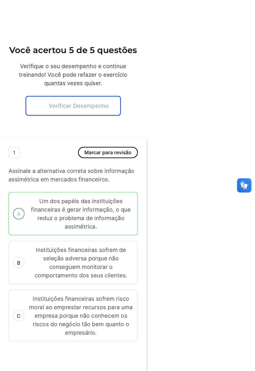 Você acertou 5 de 5 questões Verifique o seu desempenho e continue treinando! Você pode refazer o exercício quantas vezes quiser. Verificar Desempenho A B C 1 Marcar para revisão Assinale a alternativa correta sobre informação assimétrica em mercados financeiros. Um dos papéis das instituições financeiras é gerar informação, o que reduz o problema de informação assimétrica. Instituições financeiras sofrem de seleção adversa porque não conseguem monitorar o comportamento dos seus clientes. Instituições financeiras sofrem risco moral ao emprestar recursos para uma empresa porque não conhecem os riscos do negócio tão bem quanto o empresário. D E Risco moral afeta apenas instituições financeiras de pequeno porte. Informação assimétrica pode ser inteiramente mitigada por agências de classificação de risco. Resposta correta Parabéns, você selecionou a alternativa correta. Confira o gabarito comentado! Gabarito Comentado A informação assimétrica ocorre quando uma das partes envolvidas em uma transação tem mais ou melhor informação do que a outra. Isso pode criar um desequilíbrio de poder em transações, o que pode resultar em falhas de mercado, uma forma de ineficiência de mercado. As instituições financeiras, como bancos e seguradoras, têm como um de seus papéis a geração de informações, o que contribui para a redução do problema de informação assimétrica, pois permite que as partes envolvidas em uma transação tenham acesso a informações mais precisas e completas, promovendo um ambiente de negócios mais justo e eficiente. 2 Marcar para revisão O chamado "Problema dos Limões" está também presente no mercado de títulos privados e ações, sendo prejudicial ao seu A B C D E funcionamento. Assinale a alternativa correta a respeito desse problema. É um problema de seleção adversa, podendo ser mitigado, mas não eliminado, com informações produzidas pelas agências de classificação de risco. É um problema de risco moral, podendo ser facilmente resolvido pelos bancos. É um problema de risco moral, podendo ser inteiramente mitigado com informações produzidas por agências de classificação de risco. É um problema de seleção adversa e não há nada que o governo possa fazer. É um problema de seleção adversa e a exigência de um colateral por parte da instituição financeira não reduz em nada esse problema. Resposta correta Parabéns, você selecionou a alternativa correta. Confira o gabarito comentado! Gabarito Comentado O "Problema dos Limões" é um exemplo clássico de seleção adversa, um fenômeno que ocorre quando uma das partes de uma transação tem mais informações do que a outra. No caso do mercado de títulos privados e ações, os vendedores desses títulos geralmente têm mais informações sobre seu valor real do que os compradores. Isso pode levar a uma situação em que apenas títulos de baixa qualidade, ou "limões", são oferecidos para venda. As agências de classificação de risco podem ajudar a mitigar esse problema, fornecendo informações independentes sobre a qualidade dos títulos. No entanto, mesmo com essas informações, o problema não pode ser completamente eliminado, pois sempre haverá algum grau de incerteza. Portanto, a alternativa correta é: "É um problema de seleção adversa, podendo ser mitigado, mas não eliminado, com informações produzidas pelas agências de classificação de risco". 3 Marcar para revisão O Acordo da Basileia II representou uma mudança de pensamento regulatório, passando de uma postura prescrita e reativa para uma prudencial e proativa. Assinale a alternativa que contenha os ideais dos três pilares do Acordo de Basileia II. A B C D E Necessidades mínimas de capital, alteração do capital necessário conforme o perfil de risco da instituição e disciplina de mercado. Restrições sobre aquisição de ativos, necessidades mínimas de capital e restrição à competição. Proteção ao consumidor, restrições sobre aquisição de ativos, necessidades mínimas de capital. Requerimentos de transparência, disciplina de mercado, necessidades mínimas de capital. Alteração do capital necessário conforme o perfil de risco da instituição, proteção ao consumidor, restrições sobre aquisição de ativos. Resposta correta Parabéns, você selecionou a alternativa correta. Confira o gabarito comentado! Gabarito Comentado O Acordo de Basileia II é estruturado em três pilares: necessidades mínimas de capital, processo de revisão de supervisão e disciplina de mercado. A alternativa correta, portanto, é a que menciona esses três pilares. No primeiro pilar, as instituições financeiras devem manter um nível mínimo de capital para cobrir os riscos a que estão expostas. No segundo pilar, as Questão 5 de 5 Corretas �5� Em branco �0� 1 2 3 4 5 Exercicio Teorias Das Instituições Financeiras Sair A B C autoridades de supervisão avaliam se as instituições estão adequadamente gerenciando seus riscos e se possuem capital suficiente para cobri-los. O terceiro pilar incentiva a disciplina de mercado através de divulgação de informações que permitam ao mercado avaliar o perfil de risco de uma instituição. Portanto, a alternativa: "Necessidades mínimas de capital, alteração do capital necessário conforme o perfil de risco da instituição e disciplina de mercado" é a correta. 4 Marcar para revisão Assinale a alternativa correta sobre as características de uma firma que afetam sua capacidade de obter recursos no sistema financeiro. Firmas pequenas em geral têm maior facilidade para se financiar. Firmas grandes têm dificuldade para obter financiamento porque, em geral, precisam de grandes volumes de recursos. O tamanho de uma firma não afeta sua capacidade de financiamento. D E Quanto mais conhecida é uma firma, menores são os problemas de assimetria informacional, o que leva a melhores condições de financiamento. 