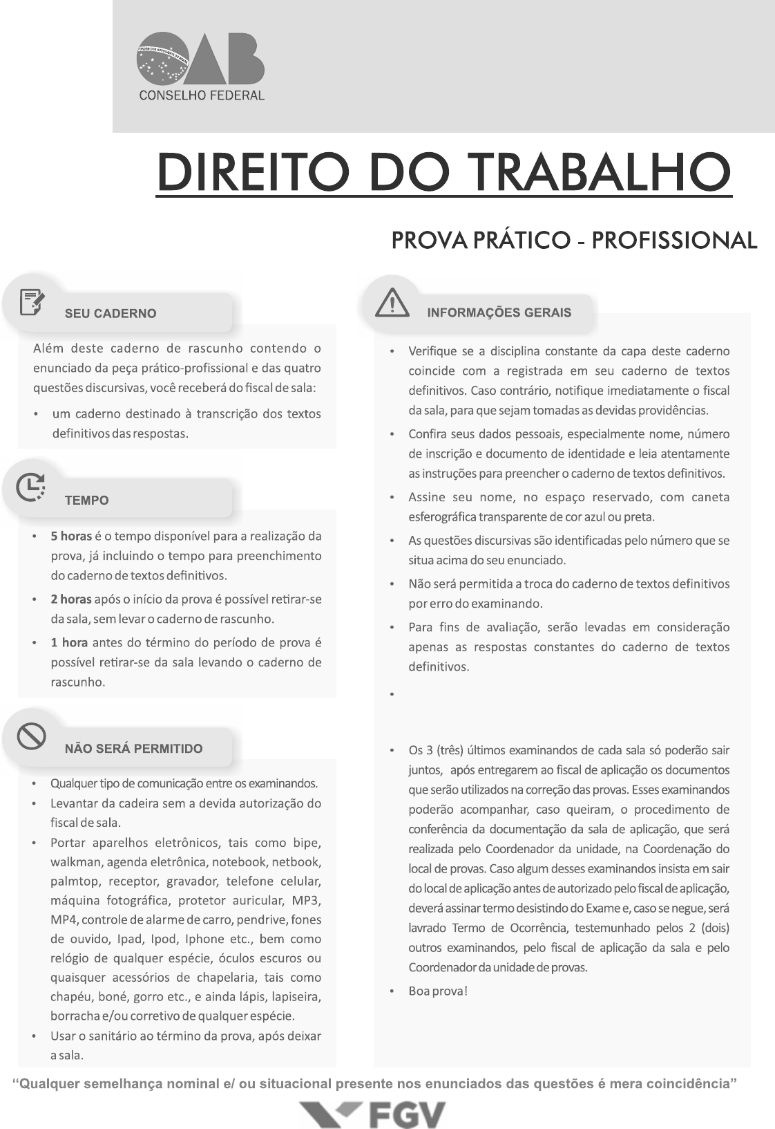 XXXVI EXAME DE ORDEM UNIFICADO– PROVA PRÁTICO-PROFISSIONAL – DIREITO DO TRABALHO Página 2 *ATENÇÃO: ANTES DE INICIAR A PROVA, VERIFIQUE SE TODOS OS SEUS APARELHOS ELETRÔNICOS FORAM ACONDICIONADOS E LACRADOS DENTRO DA EMBALAGEM PRÓPRIA. CASO, A QUALQUER MOMENTO DURANTE A REALIZAÇÃO DO EXAME, VOCÊ SEJA FLAGRADO PORTANDO QUAISQUER EQUIPAMENTOS PROIBIDOS PELO EDITAL, SUAS PROVAS PODERÃO SER ANULADAS, ACARRETANDO SUA ELIMINAÇÃO DO CERTAME. ------------------------------------------------------------------------- PEÇA PRÁTICO-PROFISSIONAL Evelyn Calabresa ajuizou reclamação trabalhista contra a sociedade empresária Pizzaria Chapa Quente Ltda., em 30 de janeiro de 2022, requerendo o pagamento do adicional de insalubridade em grau máximo. Evelyn explicou, na petição inicial, que trabalhou como cozinheira da pizzaria, de 12/07/2019 a 05/10/2021, sendo submetida a calor excessivo porque preparava as pizzas em fornos que alcançavam altas temperaturas, não recebendo qualquer equipamento de proteção individual do ex-empregador. Devidamente citada, a sociedade empresária apresentou contestação, afirmando que a temperatura alcançada na cozinha estava dentro do limite de tolerância e que, apesar de ser uma empresa pequena e familiar, fornecia todos os equipamentos de proteção à empregada, requerendo assim a improcedência do pedido. Em audiência não houve acordo e então o juiz, com base no Art. 195, § 2º, da CLT, determinou de ofício a realização de prova pericial, apresentando um único quesito do juízo, qual seja: “diga o perito se havia agente insalubre no local de trabalho de Evelyn e, em caso positivo, em que grau”. Além disso, o magistrado proibiu a apresentação de quesitos pelas partes, proibiu que os litigantes indicassem assistentes técnicos, nomeou um perito da sua confiança e fixou os honorários periciais dele em R$ 4.000,00, determinando que a empresa antecipasse a quantia em 10 dias, sob pena de execução forçada, e que a prova técnica somente tivesse início após o depósito. A sociedade empresária protestou contra a decisão, ponderando que ela violaria normas jurídicas, mas o juiz consignou o protesto na ata e manteve intacta a decisão. Ainda na audiência, o titular da sociedade empresária pediu a palavra e, aflito, explicou que o seu negócio ainda sofria o efeito da pandemia, e que se precisasse dispor dos R$ 4.000,00 determinados pelo juiz, não teria como fechar a folha de pagamento dos funcionários naquele mês. Sabe-se que a reclamação trabalhista em questão tramita perante a 80ª Vara do Trabalho de Criciúma/SC sob o número 0000728-84.2022.5.12.0080, e que a audiência em questão ocorreu há uma semana. Você, como advogado(a) da sociedade empresária, de acordo com o entendimento consolidado do TST, elabore a medida judicial adequada para tentar reverter a decisão. (Valor: 5,00) Obs.: a peça deve abranger todos os fundamentos de Direito que possam ser utilizados para dar respaldo à pretensão. A simples menção ou transcrição do dispositivo legal não confere pontuação. Nos casos em que a lei exigir liquidação de valores, o examinando deverá representá-los somente pela expressão “R$”, admitindo-se que o escritório possui setor próprio ou contratado especificamente para tal fim. XXXVI EXAME DE ORDEM UNIFICADO– PROVA PRÁTICO-PROFISSIONAL – DIREITO DO TRABALHO Página 3 01 02 03 04 05 06 07 08 09 10 11 12 13 14 15 16 17 18 19 20 21 22 23 24 25 26 27 28 29 30 XXXVI EXAME DE ORDEM UNIFICADO– PROVA PRÁTICO-PROFISSIONAL – DIREITO DO TRABALHO Página 4 31 32 33 34 35 36 37 38 39 40 41 42 43 44 45 46 47 48 49 50 51 52 53 54 55 56 57 58 59 60 XXXVI EXAME DE ORDEM UNIFICADO– PROVA PRÁTICO-PROFISSIONAL – DIREITO DO TRABALHO Página 5 61 62 63 64 65 66 67 68 69 70 71 72 73 74 75 76 77 78 79 80 81 82 83 84 85 86 87 88 89 90 XXXVI EXAME DE ORDEM UNIFICADO– PROVA PRÁTICO-PROFISSIONAL – DIREITO DO TRABALHO Página 6 91 92 93 94 95 96 97 98 99 100 101 102 103 104 105 106 107 108 109 110 111 112 113 114 115 116 117 118 119 120 XXXVI EXAME DE ORDEM UNIFICADO– PROVA PRÁTICO-PROFISSIONAL – DIREITO DO TRABALHO Página 7 121 122 123 124 125 126 127 128 129 130 131 132 133 134 135 136 137 138 139 140 141 142 143 144 145 146 147 148 149 150 XXXVI EXAME DE ORDEM UNIFICADO– PROVA PRÁTICO-PROFISSIONAL – DIREITO DO TRABALHO Página 8 QUESTÃO 1 Napoleão é bancário e estava desempregado. Recentemente, foi contratado como caixa pelo Banco Nosso Dinheiro, com salário de R$ 4.000,00, mais uma gratificação fixa de R$ 1.000,00 para remunerar duas horas extras diárias de trabalho. Napoleão, no curso do contrato de trabalho, em 21/02/2020, ajuizou uma ação trabalhista em face do banco. Na audiência, o banco foi representado por preposto não empregado, tendo sido requerido pela parte autora a confissão da parte ré. Sobre o fato narrado, considerando a legislação trabalhista em vigor e o entendimento jurisprudencial consolidado, responda aos itens a seguir. A) Que implicações jurídicas de caráter de direito material do trabalho decorrem do contrato de trabalho entre o Banco e Napoleão, no que concerne ao pagamento das horas extras? Justifique. (Valor: 0,65) B) Na audiência da ação trabalhista, como advogado(a) da parte ré, qual tese jurídica você sustentaria para rechaçar o requerimento da parte autora de confissão em razão do preposto do Banco não ser empregado? Justifique. (Valor: 0,60) Obs.: o(a) examinando(a) deve fundamentar suas respostas. A mera citação do dispositivo legal não confere pontuação. XXXVI EXAME DE ORDEM UNIFICADO– PROVA PRÁTICO-PROFISSIONAL – DIREITO DO TRABALHO Página 9 01 02 03 04 05 06 07 08 09 10 11 12 13 14 15 16 17 18 19 20 21 22 23 24 25 26 27 28 29 30 XXXVI EXAME DE ORDEM UNIFICADO– PROVA PRÁTICO-PROFISSIONAL – DIREITO DO TRABALHO Página 10 QUESTÃO 2 Marcelo Pereira, residente e domiciliado em Vitória/ES, trabalhou na socie