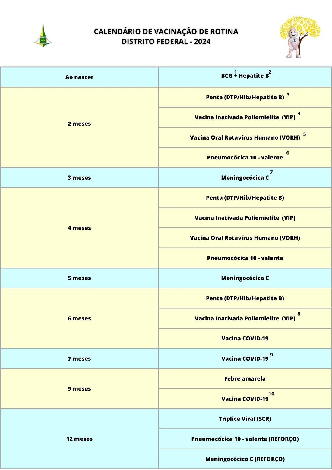 OBSERVAÇÕES: (1) Vacina BCG: administrar o mais precocemente possível, a partir de 2 Kg. Na rotina dos serviços administrar até 4 anos, 11 meses e 29 dias. (2) Vacina hepatite B: administrar preferencialmente nas primeiras 12 horas de nascimento, ou na primeira visita ao serviço de saúde, até 30 dias de nascimento. Crianças menores de 7 anos, ver recomendação da vacina penta. A partir de 7 anos, administrar 3 doses (0, 1 e 6 meses) considerando situação vacinal. Gestantes em qualquer faixa etária e idade gestacional, administrar 3 doses (0, 1 e 6 meses) considerando situação vacinal. (3) Vacina penta (DTP/Hib/Hepatite B): administrar aos 2, 4 e 6 meses de idade. Pode ser administrada até 6 anos, 11 meses e 29 dias. Intervalo entre as doses é de 60 dias e mínimo de 30 dias. R e f o r ç o s : 15 meses (1º) e 4 anos (2º) com a vacina DTP, caso esquema vacinal de penta esteja completo (3 doses). (4) Vacina poliomielite (VIP): administrar aos 2, 4 e 6 meses de idade. Intervalo entre as doses de 60 dias e mínimo de 30 dias. (5) Vacina rotavírus (VORH): administrar 2 doses (2 e 4 meses). Primeira dose a partir de 1 mês e 15 dias até 3 meses e 15 dias. Segunda dose a partir de 3 meses e 15 dias até 7 meses e 29 dias. O intervalo mínimo entre as doses é de 30 dias. Não administrar nenhuma dose após 3 meses e 15 dias. Se a criança regurgitar, cuspir ou vomitar após a vacinação não repetir a dose. (6) Vacina pneumocócica 10: administrar 2 doses, aos 2 e 4 meses de idade. O intervalo entre as doses é de 60 dias, mínimo de 30 dias. Reforço: 12 meses de idade, podendo ser administrado até 4 anos, 11 meses e 29 dias. Crianças de 12 meses a 4 anos 11 meses e 29 dias não vacinadas, administrar dose única. (7) Vacina meningocócica C: administrar 2 doses aos 3 e 5 meses de idade. O intervalo entre as doses é de 60 dias, mínimo de 30 dias. Reforço: 12 meses; pode ser administrado até os 4 anos, 11 meses e 29 dias. Crianças de 12 meses a 4 anos, 11 meses e 29 dias não vacinadas, administrar dose única. (8) Vacina COVID-19: administrar 3 doses (1ª DOSE + 2ª DOSE + 3ª DOSE). A primeira dose aos 6 meses, segunda dose aos 7 meses e terceira dose aos 9 meses em crianças entre 6 meses e 4 anos, 11 meses e 29 dias. O intervalo recomendado é de 28 dias entre a primeira e a segunda dose e 56 dias entre a segunda e a terceira dose. (9) Vacina febre amarela: administrar uma dose aos 9 meses de idade e um reforço aos 4 anos. Pessoas de 5 a 59 anos de idade, não vacinadas ou sem comprovação vacinal, administrar dose única. Contraindicada para gestantes e deve ser adiada em mulheres que estão amamentando até o 6º mês de vida da criança. Indivíduos a partir de 60 anos: avaliar o risco da doença e benefício da vacina. (10) Vacina tríplice viral: administrar 1 dose aos 12 meses e a segunda dose aos 15 meses de idade (esquema de substituição, na ausência da vacina tetra viral). Indivíduos de 1 a 29 anos devem ter 2 doses; indivíduos de 30 a 59 anos de idade devem ter 1 dose; trabalhadores da saúde independentemente da idade devem ter 2 doses. Contraindicada para gestantes. O intervalo mínimo entre as doses é de 30 dias. (11) Vacina poliomielite oral: administrar 2 gotas aos 15 meses (1º reforço) e aos 4 anos de idade (2º reforço). Administrar o 1º reforço a partir de 6 meses da conclusão do esquema básico (3 doses VIP). Não administrar VOP antes de completar o esquema de VIP (3 doses). O intervalo mínimo entre os reforços é de 6 meses. Se a criança regurgitar, cuspir ou vomitar após a vacinação NÃO está mais indicado repetir a dose, considerar vacinado. Não administrar VOP em imunossuprimidos ou contactantes de imunossuprimidos (nesses casos, administrar VIP). (12) Vacina varicela: administrar 1 dose aos 15 meses (esquema de substituição da vacina tetra viral: tríplice viral+varicela) e uma dose aos 4 anos; pode ser administrada até 6 anos, 11 meses e 29 dias. Toda criança até 6 anos, 11 meses e 29 dias deve ter 2 doses de vacina com o componente varicela, sendo o intervalo mínimo entre as doses de 30 dias. Profissionais de saúde não vacinados e que trabalham na área assistencial, especialmente em contato com pessoas imunodeprimidas e os da área de pediatria devem receber uma ou duas doses de vacina varicela (atenuada), a depender do laboratório produtor. (13) Vacina hepatite A: administrar dose única aos 15 meses de idade. Pode ser administrada até 4 anos, 11 meses e 29 dias. (14) Vacina HPV: administrar 2 doses (0 e 6 meses) em meninas e meninos de 9 a 14 anos, 11 meses e 29 dias. Intervalo mínimo entre as doses é de 6 meses. Desde que iniciado o esquema nas idades indicadas, pode ser CONCLUIDO até o limite de idade da bula. (15) Vacina Meningocócica ACWY: administrar 1 dose nos adolescentes de 11 a 14 anos, mesmo que já tenham recebido a vacina meningocócica C anteriormente (intervalo mínimo 30 dias entre as doses). (16) Vacina dupla adulto (dT): a partir de 7 anos, administrar 3 doses (0, 2 e 4 meses) considerando situação vacinal. O intervalo entre as doses é de 60 dias, mínimo de 30 dias. Vacinados anteriormente com 3 doses de vacina com componentes difteria e tétano: administrar reforço a cada 10 anos, após a data da última dose. Para profissionais de saúde, ver dTpa. (17) Vacina dTpa (adulto): administrar 1 dose a partir da 20ª semana de gestação. Deve ser administrada a cada gestação. Mulheres que perderam a oportunidade de serem vacinadas durante a gravidez devem receber 1 dose da vacina dTpa no puerpério (até 45 dias após o parto). Administrar uma dose de reforço da dTpa para todos os profissionais de saúde, considerando o histórico vacinal de difteria/tétano. (18) Vacina pneumocócica 23: administrar 1 dose nos indivíduos a partir de 60 anos acamados e/ou que vivem em instituições fechadas (asilos, hospitais e casas de repouso). Administrar 1 dose adicional a partir de 5 an
